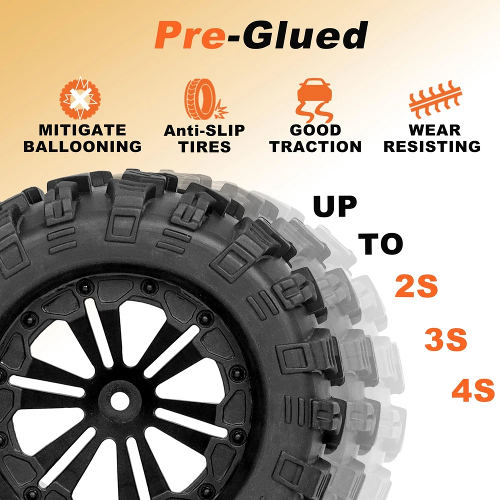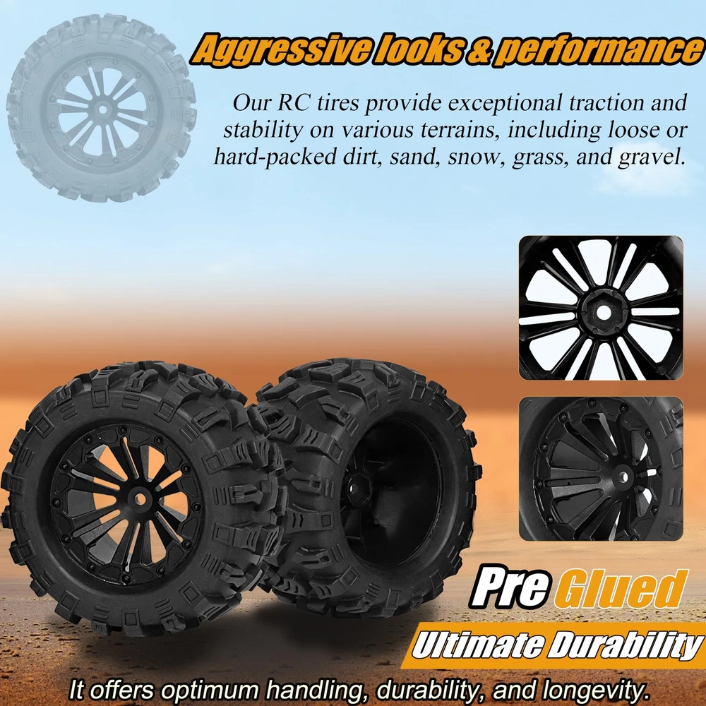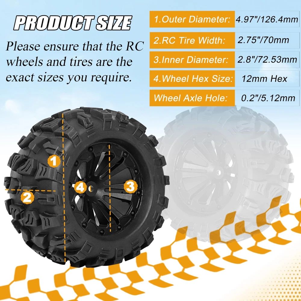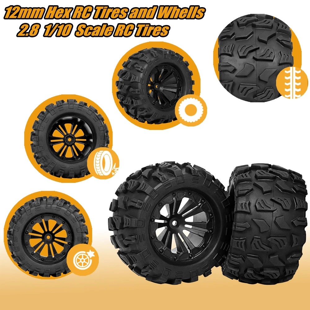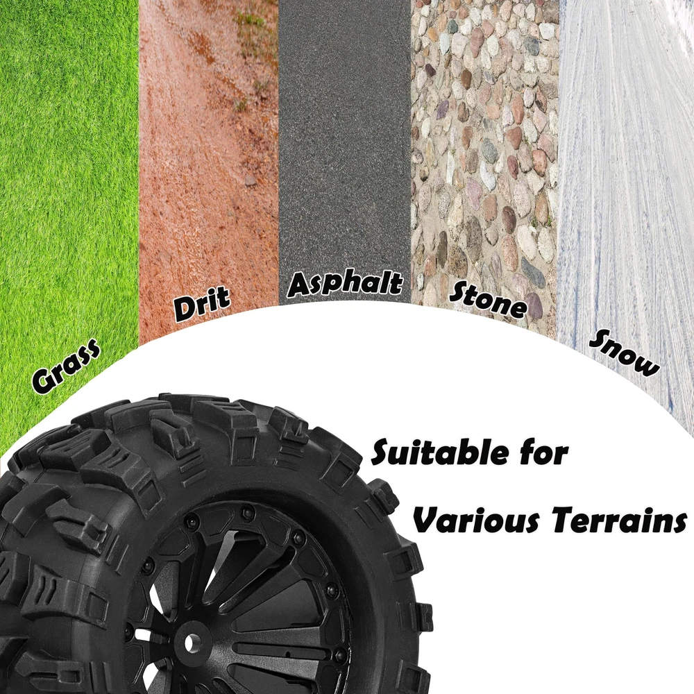 Please ensure that our RC tires and wheels match your required sizes to prevent unnecessary returns and save you time dealing with sizing inconsistencies. Product Compatibility: The precise design is suitable for a multitude of RC car models, simplifying the process of tire disassembly and assembly. It's Compatible with Traxxas Rustler 2wd 4x4 vxl tires and Wheels, It's Compatible with Traxxas Stampede 2wd 4x4 vxl tires and wheels, It's Compatible with Traxxas Hoss 4X4 VXL Tires and Wheels, It's Compatible with Redcat Volcano Epx S30 RC Truck tires and wheels, It's Compatible with Blackout XTE RC Truck tires and wheels. Exceptional Value: The package includes 4 top-quality 12mm Hex RC wheels and tires 1/10 Scale 2.8 RC tires. These can be utilized to upgrade your car and also provide a comprehensive aesthetic enhancement to your RC car. Broad Applicability: These 1/10 Scale RC Truck tires come pre-glued and include foam inserts, ready for immediate use. Crafted from high-quality materials and boasting a waterproof feature, these wheels can be extensively used on 1/10 scale RC car models, across a variety of terrains. Customer Services: If you have any questions or concerns about this product, please feel free to us. Our dedicated team is always ready to assist you and resolve any issues you may encounter. Feature: Inner Diameter: 2.86" (72.6mm) Outer Diameter: 4.85" (123 mm) Width: 2.8" (71mm) Hex Size: 12mm Package Included: 4 RC tires & wheels 1 Small Wrench Color: Black Product Compatibility: These RC wheels and tires 1/10 Scale 12mm hex are designed to fit the majority of 1/10 Scale RC racing cars that also use a 12mm hex, It's Compatible with Traxxas Rustler 2wd 4x4 VXL tires and Wheels, It's Compatible with Traxxas Stampede 2wd 4x4 VXL tires and wheels, It's Compatible with Traxxas Hoss 4X4 VXL Tires and Wheels, Compatible with Redcat Volcano Epx S30 Blackout XTE RC Truck tires and wheels. 12mm hex RC Wheels and Tires 1/10 Scale 2.8 RC Tires Size:The dimensions of our 1/10 scale RC truck buggy tires are as follows: Outer Diameter: 4.9" | Width: 2.8" Hex Size: 12mm. Please confirm that our RC tires and wheels fit your requirements to prevent unnecessary returns and to save your time from dealing with sizing issues. Outstanding Performance: The surface of these tires has an anti-skid feature, enabling superior road holding and durability for stable and flexible driving. The unique surface texture design enhances grip, making these tires suitable for a variety of terrains such as pavement, dry grass, hard-packed dirt, and loose surfaces. Premium Quality Material: Our pre-glued 1/10 scale with 12mm hex RC tires and wheels are made from natural rubber and plastics. These materials offer durability and sturdiness and they are designed to resist wear, ensuring a lengthy service life. Crucially, it is essential to ensure a tight connection between the tire's adapter and your remote control car's adapter. To prevent excessive wear on the RC tire's adapter, we strongly recomme Customer Services: We warmly invite you to reach out to us if you have any questions or concerns related to our products. Our dedicated and knowledgeable team is always ready and eager to provide assistance, aiming to swiftly resolve any problems or issues you may encounter with our products. Your satisfaction is our utmost priority.