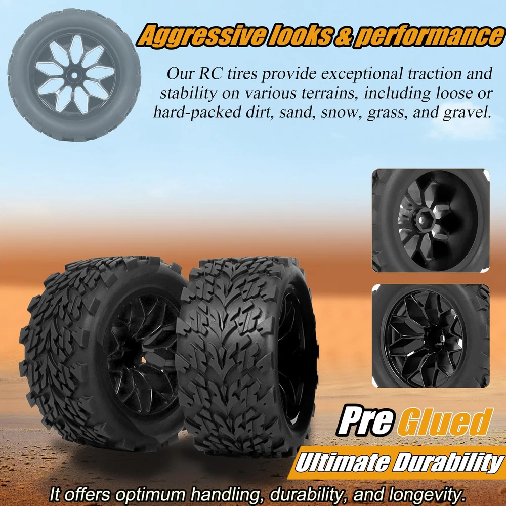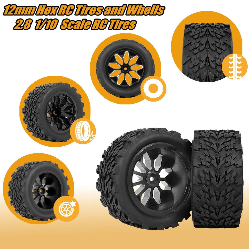Description Please make sure our RC tires and wheels are the correct sizes you are looking for, to avoid returning products and save your time due to the inconsistent size. [Great value]: There are 4 high-quality RC drift wheels in this tire set, you can use them to upgrade your car and also can provide a complete vision for your RC car. [Wide application]: These pre-glued buggies tires are equipped with foam inserts, ready to use. Due to the high-quality materials and the function of waterproof, the wheels can be widely used on 1/10 scale RC car models and various kinds of roads. [Easy to install/replace]: The accurate design is suitable for a variety of RC car models, making it easier to disassemble and assemble the tires. [Customer services]: If there is any question about this product, please us at your ease, our team is willing to help you to solve the problems that you meet. Feature: Tire Outer Diameter: 4.9" (124.5 mm) Width:2.69" (68.4mm) Hex Size: 12mm Package Included: 4 RC tires & wheels Color: Black 12mm Hex RC Wheels and Tires Size: The size of our 1/10 RC monster truck buggy tires, Inner Diameter: Outer Diameter: 4.66" 118mm | Width: 2.23" 56.9mm | Inner Diameter: 2.84" 72.1mm "Please make sure our RC tires and wheels are the correct sizes you are looking for, to avoid the returns products and save your time due to the inconsistent size." Universally Compatibility: Our 2.8 1/10 scale RC tires 12mm hex are universally compatible with a wide array of popular 1/10 scale RC racing cars with 12mm hex hubs, It's Compatible with Traxxas Rustler 2wd 4x4 VXL tires and Wheels, It's Compatible with Traxxas Stampede 2wd 4x4 VXL tires and wheels, It's Compatible with Traxxas Hoss 4X4 VXL Tires and Wheels, Compatible with Redcat Volcano Epx S30 Blackout XTE RC Truck tires and wheels, Compatible with 1/10 RIAARIO AMORIL tires and wheels. Optimized Traction & Multi-Surface Capability: Featuring an anti-skid surface and unique texture design, these tires provide exceptional grip on various terrains, from smooth pavement to rough grass, compacted dirt, and loose surfaces. Enjoy stable and agile driving experiences on any track or trail. Premium Material: This is a Preglued 1/10 scale with 12mm hex RC tires and wheels. And it is made of Premium natural rubber and sturdy nylon materials, which are more durable and sturdy, practical, it is not easy to wear and has a long service life. : We extend a warm invitation for you to us whenever any inquiries or concerns arise regarding our products. Our team, comprised of dedicated and well-informed individuals, stands ready and enthusiastic to offer prompt assistance, ensuring the swift resolution of any challenges or issues you may face with our offerings. Your satisfaction remains our foremost commitment.