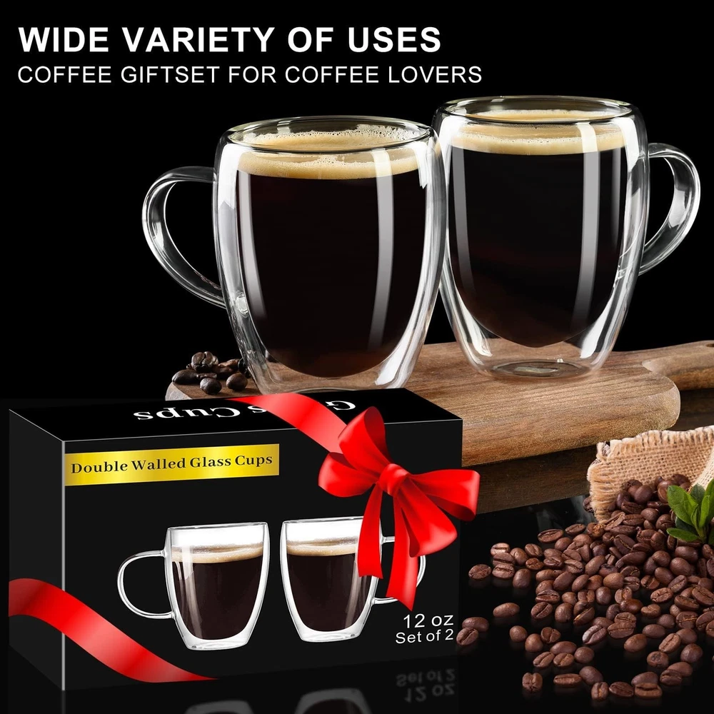 About this item 【ARTISTIC DOUBLE DESIGN】This coffee mugs adopt the design of double glass. Air is sandwiched between the double-layer glass, which effectively insulates part of the temperature and prevents hands from being scalded. The double walled glass coffee mugs have the air pockets that create complete insulation to keep your coffee warm for longer, and our glass coffee cups can also be used for cold drinks without condensation. 【HIGH BOROSILICATE GLASS MATERIAL】The coffee cups are made of heat-resistant lead-free borosilicate glass, which is healthy and environmentally friendly, and does not contain any harmful substances. It is an ideal drinking utensil at present. Borosilicate glass allows glass coffee mugs to withstand sudden temperature changes from -40°F to 300°F. In addition, the coffee mugs are super easy to clean, with a simple hand wash to keep them clean, or you can use the dishwasher, too. 【CONVENIENT AND ANTI-SCALD HANDLE】 This coffee mug features a convenient handle. The glass handle is ergonomically designed for easy handling and prevents burning hands. Whether it is freshly extracted espresso liquid from a French press or freshly heated milk froth, it will not burn your hands, and it is also a good choice to take it outdoors for camping. 【SAFE VENT HOLE】 The Double wall glass has a pinhead-sized hole somewhere in the glass. These holes will not let water/steam/condensation water enter, which can well reduce the glass bursting during use. Water and air can only be expelled, not entered. They will be completely hermetically sealed. Therefore, our double-layer glass coffee mugs have high safety and long service life. 【WIDE VARIETY OF USES】 Crystal clear appearance, smooth and delicate lines, good hand feeling. glass coffee cups feature a unique curvature that pairs perfectly with your espresso machine or coffee machine. The clear glass insulated coffee mug is perfect for brewing tea, coffee, latte, smoothies, desserts and juices, and comes with a beautiful gift box. Suitable as a Valentine's Day gift, Christmas gift.