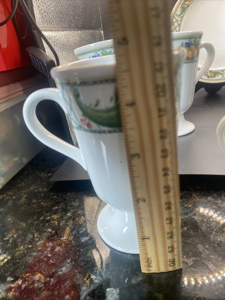 This 12-piece set of Cornucopia-themed mugs, creamer and sugar bowl with plate is perfect for all occasions. The set includes 8 footed mugs, each with a capacity of tea, coffee or hot cocoa. The mugs are made of pottery and have a contemporary style with an oblong vertical design. The set is decorated with the Cornucopia character and fruit from Germany, making it a great addition to any kitchen. The set is from Bavaria, Germany and is ideal for teens, adults and kids. The mugs have a height of 4.75 inches and are great for serving hot beverages. This set is perfect for those who love to entertain and want to add a touch of elegance to their table.