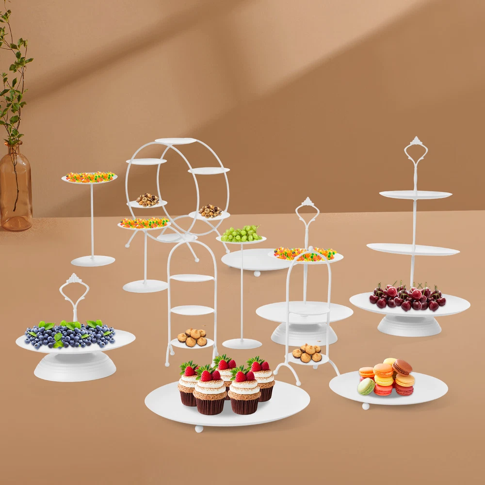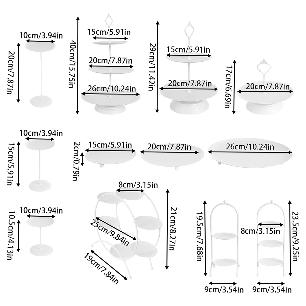 Specification Material: Iron Color: White Process: Welding, High-temperature Baking Paint Style: Modern Assembly Required: Yes Mounting Type: Tabletop Product 1 Size(D*H): 26*40cm/10.24*15.75in Product 2 Size(D*H): 20*29cm/7.87*11.42in Product 3 Size(D*H): 20*17cm/7.87*6.69in Product 4 Size(D*H): 26*2cm/10.24*0.79in Product 5 Size(D*H): 20*2cm/7.87*0.79in Product 6 Size(D*H): 15*2cm/5.91*0.79in Product 7 Size(D*H): 10*20cm/3.94*7.87in Product 8 Size(D*H): 10*15cm/3.94*5.91in Product 9 Size(D*H): 10*10.5cm/3.94*4.13in Product 10 Size: 25*8*21cm/9.84*3.15*8.27in Product 11 Size: 9*8*23.5cm/3.54*3.15*9.25in Product 12 Size: 9*8*19.5cm/3.54*3.15*7.68in Package Size: 47*27*22cm/18.5*10.63*8.66in Each Disc Load Capacity: 1-4kg/2.2-8.82lbs Gross Weight: 4.5kg/9.92lbs Net Weight: 4kg/8.82lbs 12pcs Round Cupcake Dessert Display Stand Fruit Snack Holder Party Event Wedding Description Our dessert display stand set is a dessert display solution designed for bakeries, cafes, and home parties. It combines elegant design with practical functionality, aiming to provide an aesthetically pleasing as well as practical display platform for your desserts. Whether it's cakes, macarons, or assorted pastries, it will present the best visual effect. Key Features Made to Last: This product is made of high-quality iron, treated with welding and high-temperature baking paint processes, sturdy and wear-resistant , not easy to rust, corrode and deform, ensuring long-term beauty and practicality. Diversified Display: We provide 12 different sizes and types of display racks so that they can meet the needs of diversified dessert displays, such as cakes, macaroons, cupcakes, and so on. Multifunctional Use: Thanks to their different sizes and combinations, they are not only suitable for dessert displays but also for other items such as fruits, trinkets, etc., for a wide range of occasions. Beautiful Decoration: The 12 different shapes of the display racks make it not only practical but also a decorative piece to enhance the overall aesthetics of the space. Good Performance: This product is made up of 12 different display racks, which can not only adapt to different types and sizes of desserts but also present you with a unique display format, thus increasing the attractiveness to customers. Easy Assembly: Simple structure and complete accessories help you finish the installation quickly and use it in a short time. Effortless Cleaning: It has a smooth surface and an open structure, so you only need to wipe the dust or residue with a towel. Ideal Gift: With good performance and a modern appearance, you can give it as a gift to your friends who love to make desserts and add a touch of beauty to their dessert display. Good Customer Service: We aim to provide quality products and services. If you have problems, please feel free to contact us. We will reply and solve the problem for you as soon as possible. Details Round Plates: This design provides a full range of dessert presentation angles. Practical Handles: They are easy for you to pick up and move around. Solid Base: No matter which shape they are, their bottoms are made with solid bases according to their shapes, effectively preventing them from tipping over and ensuring the stability of the product. Application This product can be used to show your favorite cakes and desserts at any wedding, birthday party, baby shower, anniversary, afternoon tea, celebration, fancy dinners and candlelight dinners, holiday dinners, and any other event or special occasion. Specification Material: Iron Color: White Process: Welding, High-temperature Baking Paint Style: Modern Assembly Required: Yes Mounting Type: Tabletop Product 1 Size(D*H): 26*40cm/10.24*15.75in Product 2 Size(D*H): 20*29cm/7.87*11.42in Product 3 Size(D*H): 20*17cm/7.87*6.69in Product 4 Size(D*H): 26*2cm/10.24*0.79in Product 5 Size(D*H): 20*2cm/7.87*0.79in Product 6 Size(D*H): 15*2cm/5.91*0.79in Product 7 Size(D*H): 10*20cm/3.94*7.87in Product 8 Size(D*H): 10*15cm/3.94*5.91in Product 9 Size(D*H): 10*10.5cm/3.94*4.13in Product 10 Size: 25*8*21cm/9.84*3.15*8.27in Product 11 Size: 9*8*23.5cm/3.54*3.15*9.25in Product 12 Size: 9*8*19.5cm/3.54*3.15*7.68in Package Size: 47*27*22cm/18.5*10.63*8.66in Each Disc Load Capacity: 1-4kg/2.2-8.82lbs Gross Weight: 4.5kg/9.92lbs Net Weight: 4kg/8.82lbs Package Included 12* Round Dessert Displays Other Accessories for Assembly Notes You can wipe the surface with a damp cloth. Do not immerse them in water. Please do not expose it to sunlight and do not scratch the surface with sharp objects. Please keep it in a cool and dry place. Please note that display items such as cakes and pastries are not included in this product. Please note this product is not dishwasher safe. Please allow the slight color difference caused by the shooting light and 1-3cm error due to manual measurement, and make sure you do not mind before ordering. Payment Delivery details Terms of sales About us Contact us Payment We accept ebay payment 。 Fees such as import duties, taxes are not included in the item price or shipping costs. These charges are the buyer's responsibility. Delivery details Shipping: 2-9 working days to: USA Terms of sales We maintain high standards of excellence and strive for hundred percent customer satisfaction. Feedback is very important to us. We hope that you contact us immediately before you give neutral or negative feedback, so that we can address your concerns. It is impossible to address issues if we do not know about them! About us Your satis faction is our ultimate goal. We work hard to earn your trust and future business. Our certified technicians have tested each item before shipping. The unit comes with 1 year limited warranty on all manufacturing defects. a) If you receive a defective item, you may return it or ask for a discount. Please contact us within 14 days after you receive the package. b) What you returned must be intact and in its original packaging as re? u. Customer i