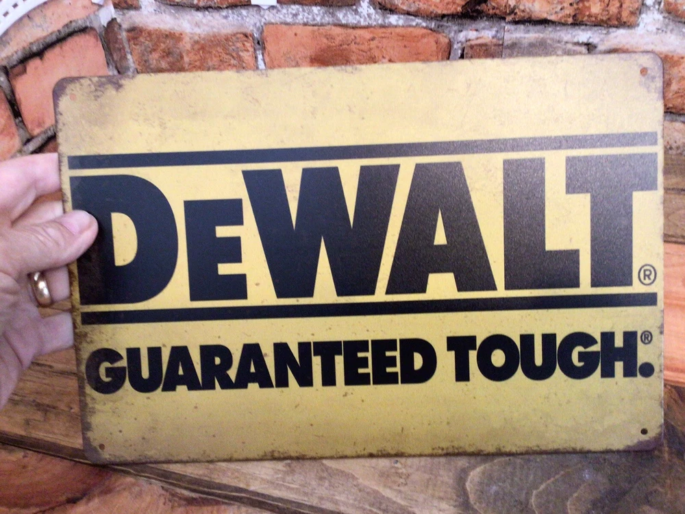 This vintage DeWalt advertising sign features the brand's iconic "Guaranteed Tough" slogan in a stylish patina design. Measuring 8 inches in height, this sign is perfect for any fan of advertising memorabilia or DeWalt history. The sign is made of high-quality materials and is guaranteed to add a touch of vintage charm to any space. It has rolled edges for stability and 4 predrilled holes for easy mounting. Whether you're a collector or just looking for a unique piece of home decor, this DeWalt sign is a must-have. And, it SHIPS FREE