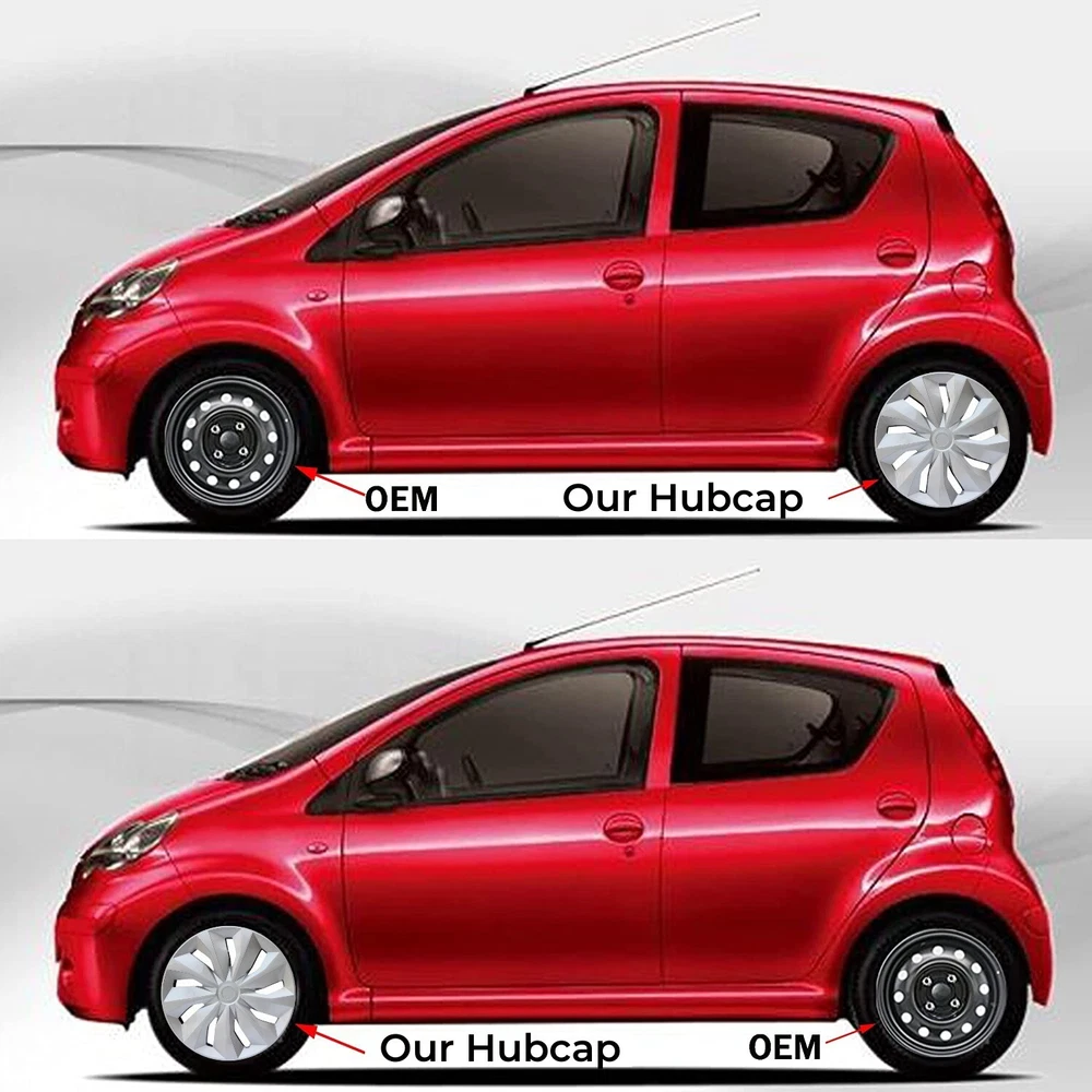 Including: 4pcs Material: Plastic, Silver ABS Brand: Unbranded Notice 2: 13" only fits R13 tire Fitment: R13 Tire Number in Pack: 4 Color: Silver Placement on Vehicle: Front, Left, Rear, Right Finish: Glossy, Rust Preventative Type: Hub Cap Features: Easy to Install Notice: before you buy it,please check your tire size Attention: not for aluminium alloy hub