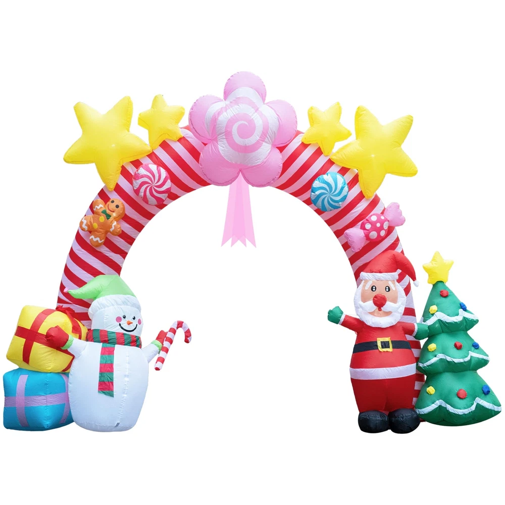🎄 Large Christmas Inflatable Arch: Standing at an impressive 9.5 feet tall and 13 feet wide, this unique Christmas candy inflatable archway brings a festive spirit to your home and yard. It’s the perfect addition to your outdoor Christmas décor, creating a stunning focal point that will delight guests and passersby alike. ☃️ Creative Design with Multiple Christmas Elements: Exclusively designed for Christmas, this inflatable features a delightful archway adorned with pink candy shapes, elegant ribbons, playful gingerbread people and glittering yellow stars at the top. Underneath the arch, charming holiday characters like Santa Claus, snowmen stand alongside gift boxes and a decorated Christmas tree, capturing the joyful essence of the season. Perfect for adding a touch of fun and whimsy to any setting! ✨ Joyful LED Lighting: Add a magical glow to your holiday nights with built-in LED lights that bring the candy archway to life. The soft lighting creates a warm, inviting atmosphere, making it perfect for evening gatherings, family Christmas parties, or simply enhancing your yard’s holiday charm. It’s especially appealing to children, turning your yard into a festive wonderland they’ll love! 💖 Easy Setup with Powerful Air Blower: Setting up your holiday decorations is hassle-free with the included high-power built-in 2A air blower and 1.5A power adapter. Simply plug it in, zip it up, and watch it inflate in minutes. The package also includes ground stakes, ropes, and water bags for secure setup, ensuring stability in any outdoor space. 🎅 Sturdy and Wind-Resistant for Outdoor Use: This Xmas candy arch inflatable is designed to withstand outdoor elements, with strong ground stakes, durable ropes, and water bags to keep it securely anchored. Whether it’s windy or calm, your inflatable Christmas tree carousel will stay upright and ready to spread holiday joy all season long.