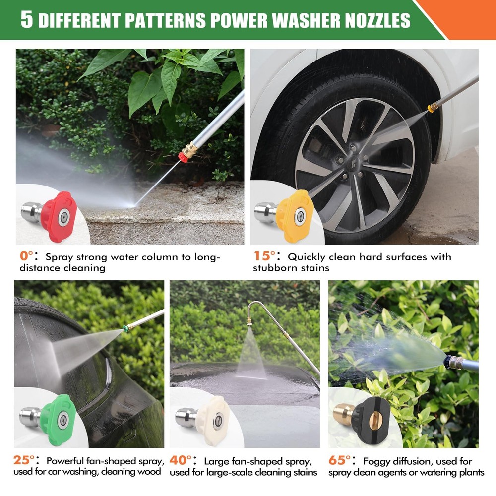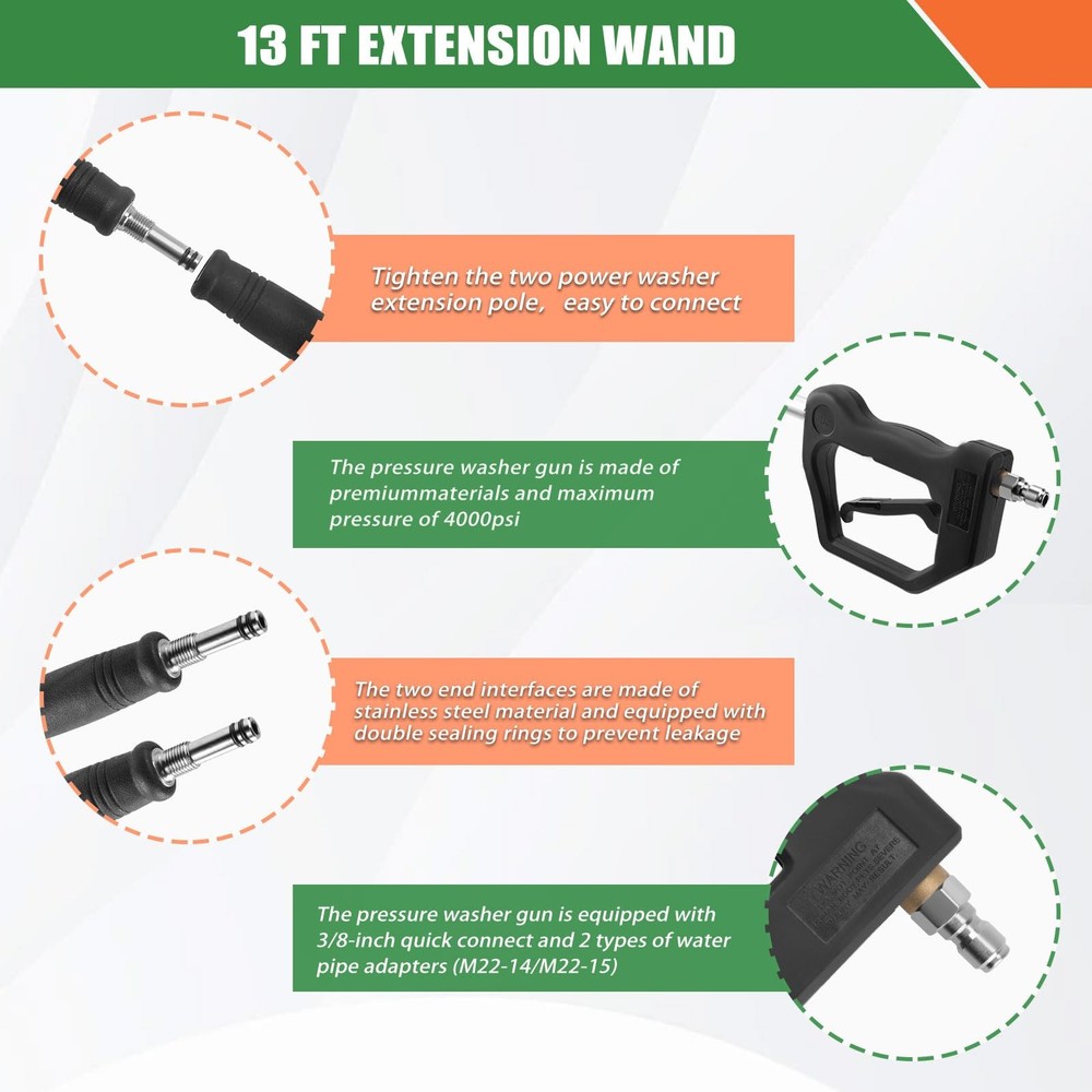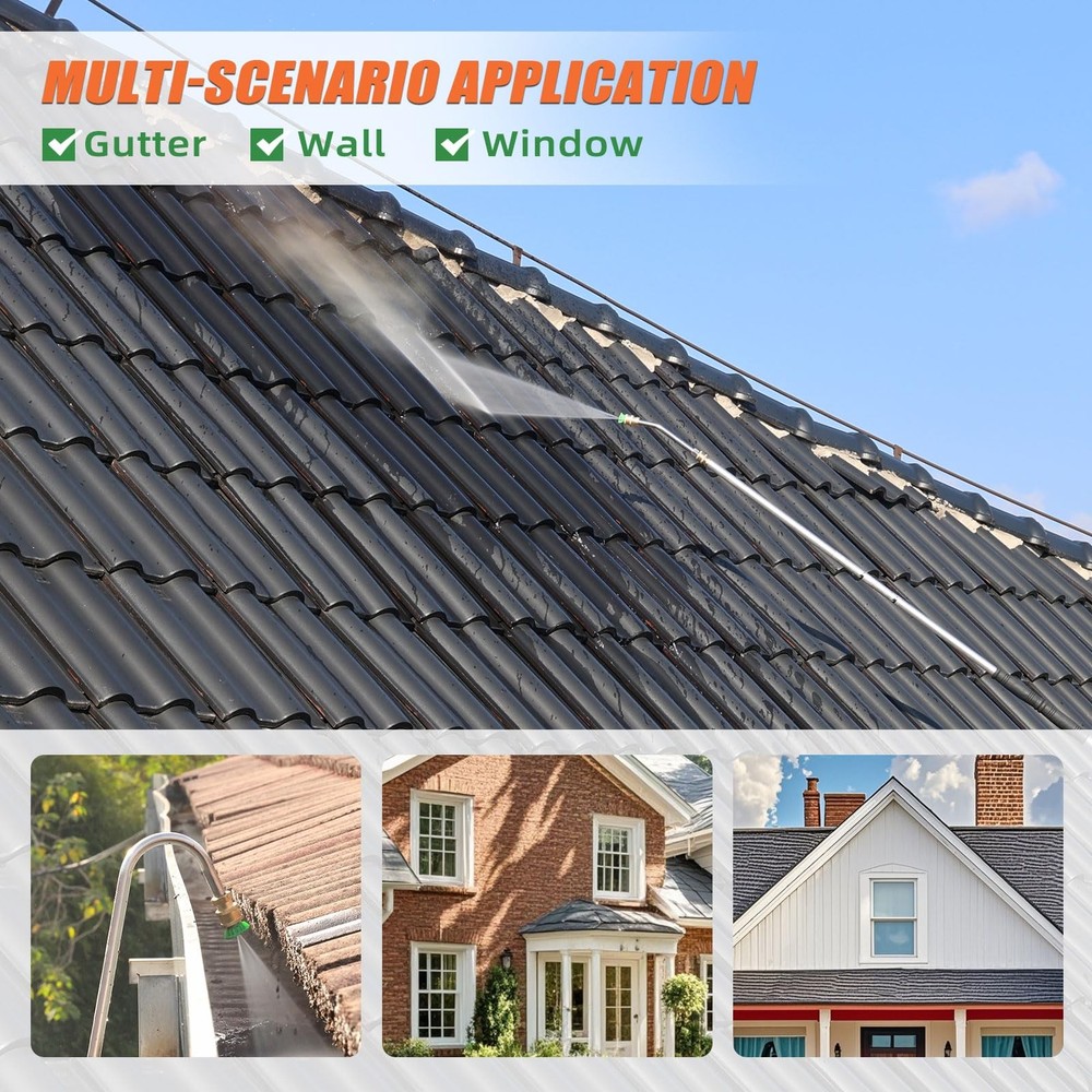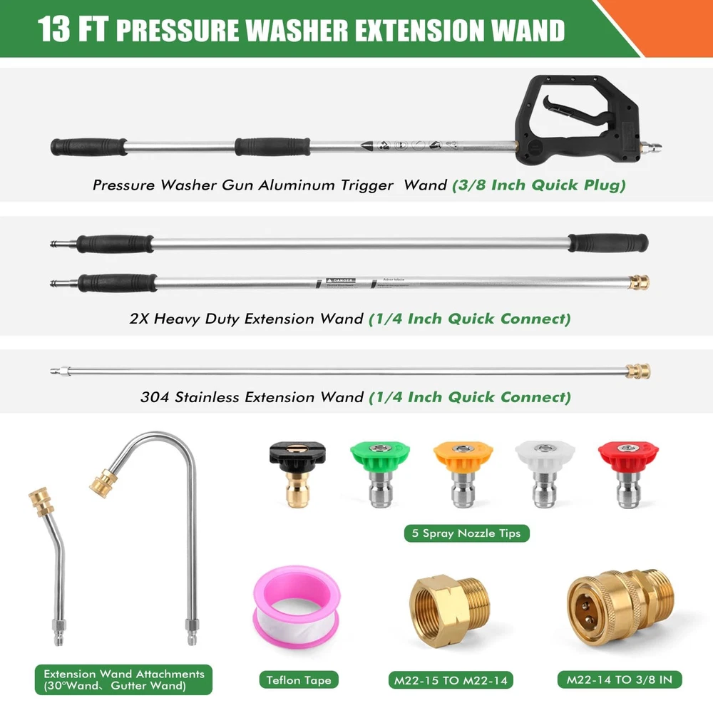 Professional Cleaning Tool: Our pressure washer extension wand is equipped with a lightweight and durable 3-section aluminum alloy extension wand and 1-section stainless steel extension wand, with a length adjustable to 13 feet. It can easily reach hard to reach areas such as exterior walls, windows, gutters, eaves, wall panels, eaves, and roofs, making professional cleaning work more effortless Excellent Quality Material & Durable & Lightweight: This power washer extension wand kit is made of sturdy and lightweight aluminum alloy and stainless steel materials, making it easy to grip and operate. The comfortable rubber grip design allows you to reduce fatigue even after long hours of work. Fully sealed pressure washer gun and durable high-pressure cleaning machine spray bar ensure no leakage and support power washer up to 4000 PSI Multi Angle Flexible Response: The pressure washer extension wand is equipped with two different angle extension rods (30 °, U-shaped gutter cleaner) to meet various angle requirements. The fixed threaded interface ensures that the extension rod is stable and does not shake, and the spray nozzle tips can be accurately positioned in the desired direction (with 5 spray nozzle tips) Widely Compatible & Worry Free: Our pressure washer wand tool is equipped with 2 types of adapters (compatible with 3/8 "QC to M22-14mm、M22-15mm), Compatible with most gas and power washer on the market with a rated pressure between 2000-4000 PSI Comprehensive Accessory Set: The pressure washer extension gutter cleaner attachment set includes: 4 extension rods, 5 spray nozzle tips, 2 hose adapters(M22-14mm, M22-15mm), 2 extension wands (30 °, U-shaped gutter cleaner), thread seal tape, nozzle cleaner