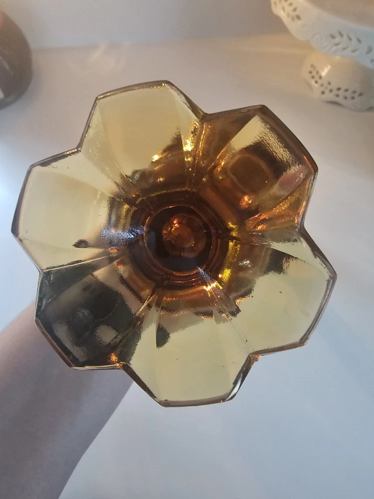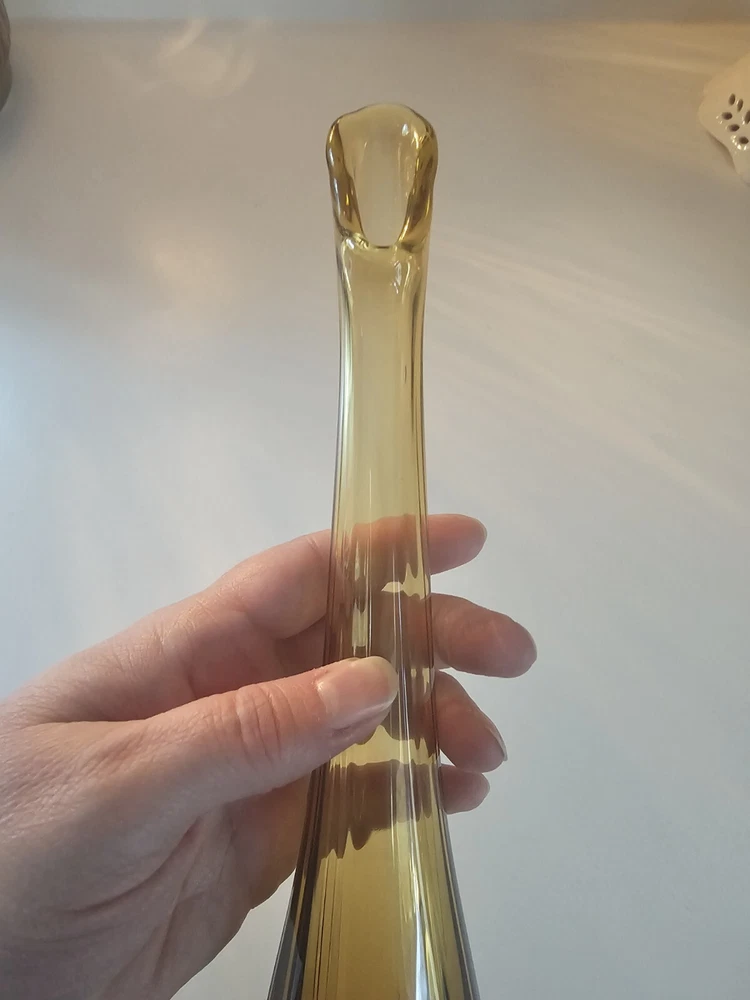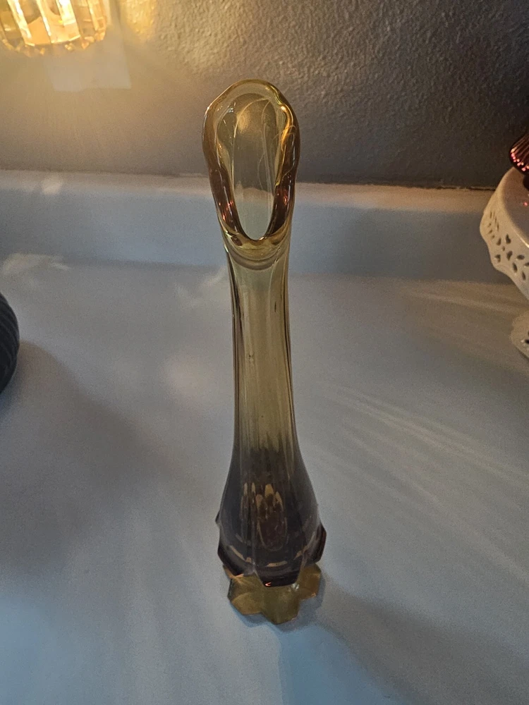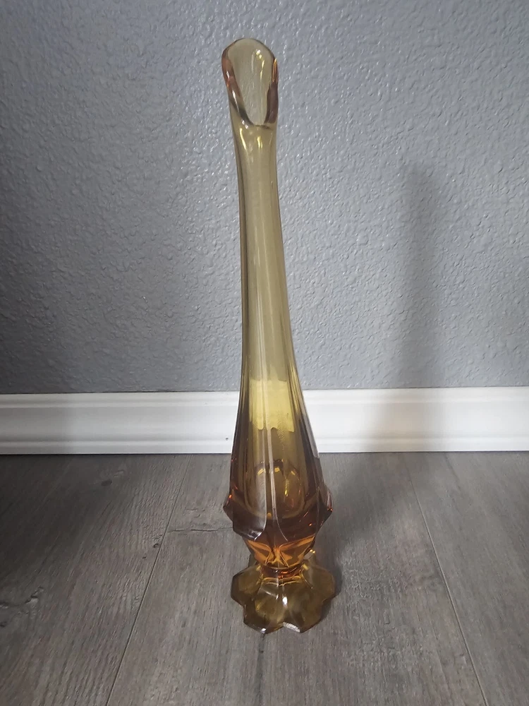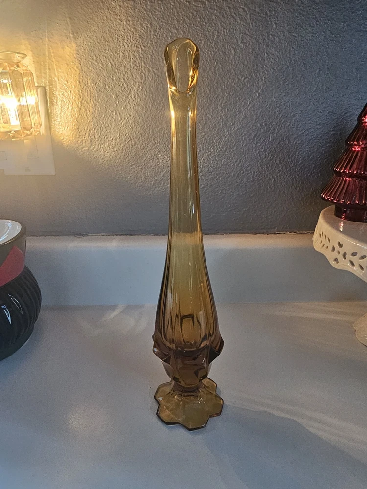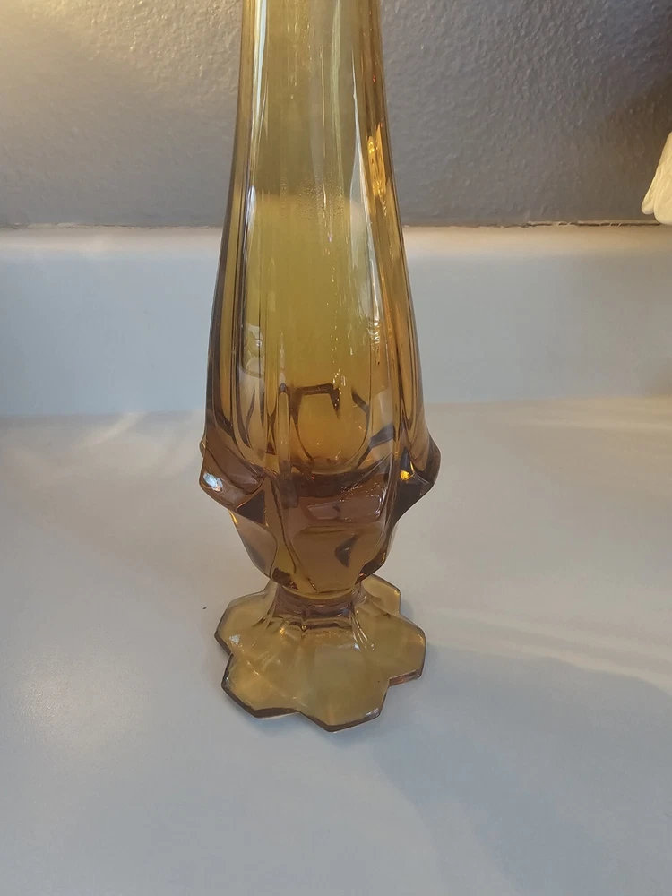 This is a vintage Fenton glass vase in amber color, standing 13 inches tall. The vase features a unique "Swung" design and is set on a pedestal base. It is a hand blown piece, showcasing mid-century modern style. The brand is Fenton and the vase is an original handmade creation.