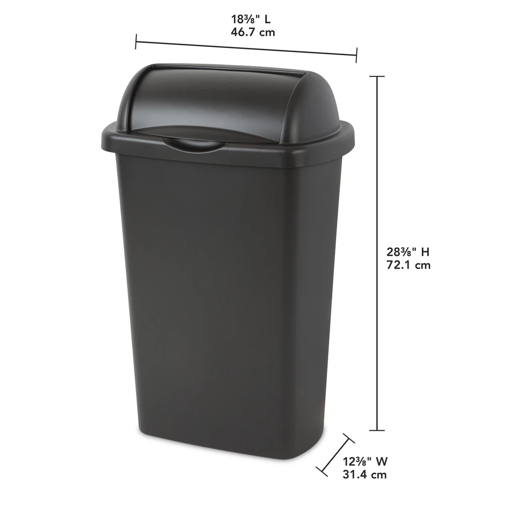The 13 Gallon Roll-Top Wastebasket features a lid that rolls up, stays open and returns closed, all with minimal effort. The large opening allows for disposal of oversized items while leaving the lid rolled up. The design coordinates with any kitchen décor and this wastebasket features an easy-to-clean textured surface. It accommodates a standard 13-gallon trash liner or it can be used to collect recyclable material. This Wastebasket is ideal for all areas of the home including kitchen, garage, basement or even the office. It's durable design will hold up to regular day-to-day use and confidently conceal contents. The overall assembled dimensions of this item are 18 3/8" L x 12 3/8" W x 28 3/8" H. Adult Plastic 13 Gal. Roll Top Wastebasket Black: Outside Dimensions: 18 3/8" x 12 3/8" x 28 3/8" Large 13 Gallon capacity makes this the ideal size for kitchen use Single unit option Classic color to complement all décor - Black The 13 Gal RollTop lid opens with a touch and stays open for easy disposal Lid rolls up, stays open and returns closed with minimal effort Coordinates with any kitchen décor Easy-to-clean textured surface Accommodates a standard 13-gallon trash liner Ideal for use in the Kitchen, Bathroom, Bedroom, Dorm Room, Mudroom or Basement BPA-free and phthalate-free Made of easy to clean plastic No batteries required
