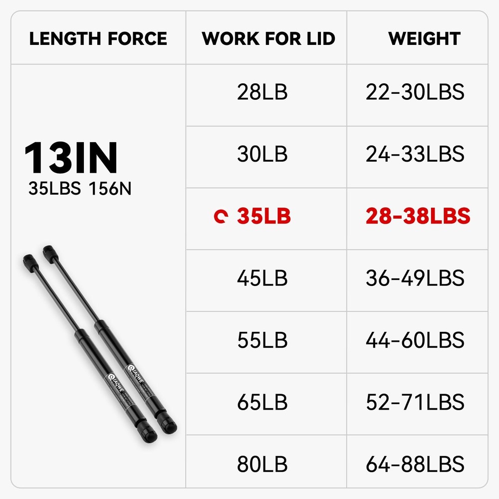 C16-22360 13Inch 35Lb/156N Gas Struts Shocks Springs 13" Lift Support for Snugtop are Leer Truck Camper Shell Topper Rear Cap Window Door Pickup Canopy Lid 2PCS [ Gas Struts Parameter ]: Force: 35Lbs/156N 13 Inch per Strut. Extended Length: 13.00 Inch, Compressed Length: 8.50 Inch. A pair of 2 shocks, Very Strong! Can not compress directly by your hands [ Replacement Part Number ]: 1:1 OEM Interchange number: C1622360, C16-22360 [ 35LB Struts Application ]: Suitable for Leer ARE Snugtop camper shell rear topper window, truck cap topper, tool box, toy chest box, outdoor TV cabinet window lid and so on. Scope of application: 28-39Lb [ Stable. Strong. Reliable. ]: Our struts are suitable for various harsh weather environments such as outdoor heavy rain and minus 104℉. As the best and reliable gas spring manufacturer, will always stand behind you to provide you with the strongest support [ 3-Minute Upgrade ] Package includes: 2 gas struts + 1 instruction. Just use a screwdriver to remove old struts and install 's - the whole swap takes just 3 minutes! 13 inch 35 lbs Lift Supports Struts used in different application scenes such as Suitable for leer camper shell, truck topper, atc truck cap, canopy lid, leer topper, rearwindow, household cabinets, advertising boards, bedframes, truck canopy, homebuilt generator house, trash bin lid, loft floor hatch, outdoor bench lid, trap door, garbage shed lid, camper shell window, teardrop trailer, and so on. Specification: Force: 35Lbs (Per Strut) Extened Length (Center-to-Center): 13 inch Compressed Length (Center-to-Center): 8.5 inch Package: 2 Pcs* Lift Support HOW TO INSTALL&ADJUST IT: If you want to open the lid at 90-120 degrees, the mounting point is at 120-130 mm(4.72-5.12 inch) to the hinge's direction. If you want to open the lid at more than 120 degrees, the mounting point on the door is at the 75 mm(2.95 inch) to the hinges direction. If you feel the it's too powerful, you can move the mounting point 20 mm(0.79 inch) towards the hinges's direction ,while if you feel it's too weak,you can move it 20 mm(0.79 inch)towards the opposite direction. Shipping We offer FREE shipping on all orders! We ship within Three business days of payment, usually sooner. We use a selection of shipping services such as UPS, FedEx, USPS etc. We only ship to the lower 48 states, no APO/FPO addresses or PO Boxes allowed. Local pickups and combined shipping options are not provided at this time. Return You can return a product for up to 30 days from the date you purchased it. Any product you return must be in the same condition you received it and in the original packaging. Please keep the receipt. Payment We accept payment by any of the following methods: PayPal Please pay as soon as possible after winning an auction, as that will allow us to post your item to you sooner! Feedback Customer satisfaction is very important to us. If you have any problem with your order, please contact us and we will do our best to make you satisfied. Contact Us If you have any queries, please contact us via ebay. We usually respond within 24 hours on weekdays. Please visit our eBay store to check out other items for sale! Thank you for shopping at our store.