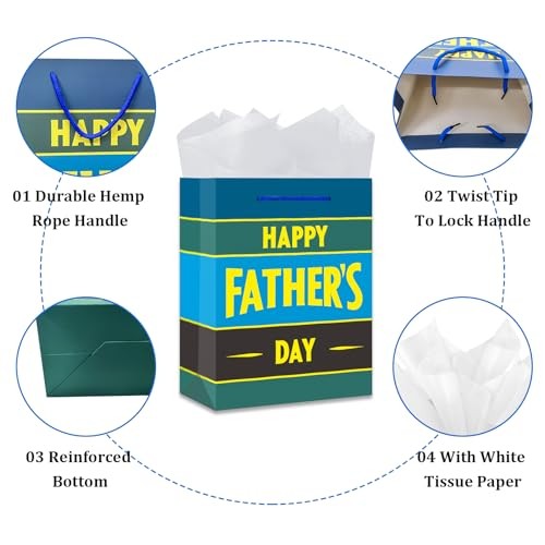 Return Policy Fast Delivery Trusted seller 13" Fathers Day Gift Bag - Large Gift Bag with Tissue Paper Father's Day Bag with Handles Fathers Day Paper Bags Happy Father's Day Gift Bag for Men Dad Stepdad Husband Grandpa Product Description Large Fathers Day Gift Bag: Fathers day bag measures approximately 10.2" wide by 13" high by 5.8" deep,and the Fathers day greeting cards size is 4x6 inches. Large Gift Bag with Tissue Paper: Fathers day bag with handles features stripes with " HAPPY FATHER'S DAY "lettering,and coordinating Fathers day card that reads "HAPPY FATHER'S DAY " ALL-IN-ONE: This fathers day paper gift bag includes 2 sheets of white tissue paper to make presents wrapping for dads quick and easy,and attached with a greeting card to tell dad how much you love or thanks to him. THANK DAD GIFT DAG: Charming gift bags and wrapping paper are a great way to show the father figures in your life how much you care. Perfect for Father's Day party use to hold more of various gifts or small items carried. MATERIAL: Crafted from high-quality paper materials, lightweight and no smell. The bags have reinforced bottom, strong enough to hold small gift you wanted. Shipping Returns Payment Shipping Shipping is FREE to all addresses other than APO/PO boxes in the lower 48 states. All our stock ships from US-based warehouses. Shipped via USPS or UPS (depending on location and package weight) Unless stated otherwise, all orders will ship within 24-72 hours of your payment being processed. Check our feedback to see the great reviews of FAST shipping we offer. Returns Seller does not accept returns Payment We currently accept payment via eBay managed payments only. Once payment is cleared, we will dispatch your shipment within 1-3 business days. Please refer to the "Shipping" tab for more information regarding shipping speed to your destination.