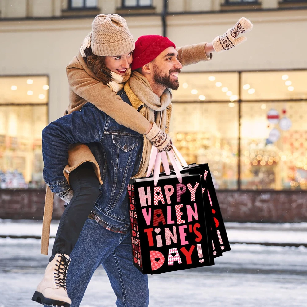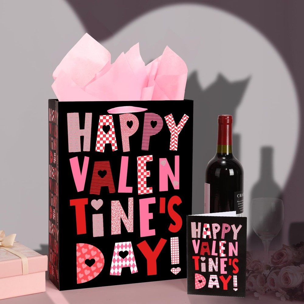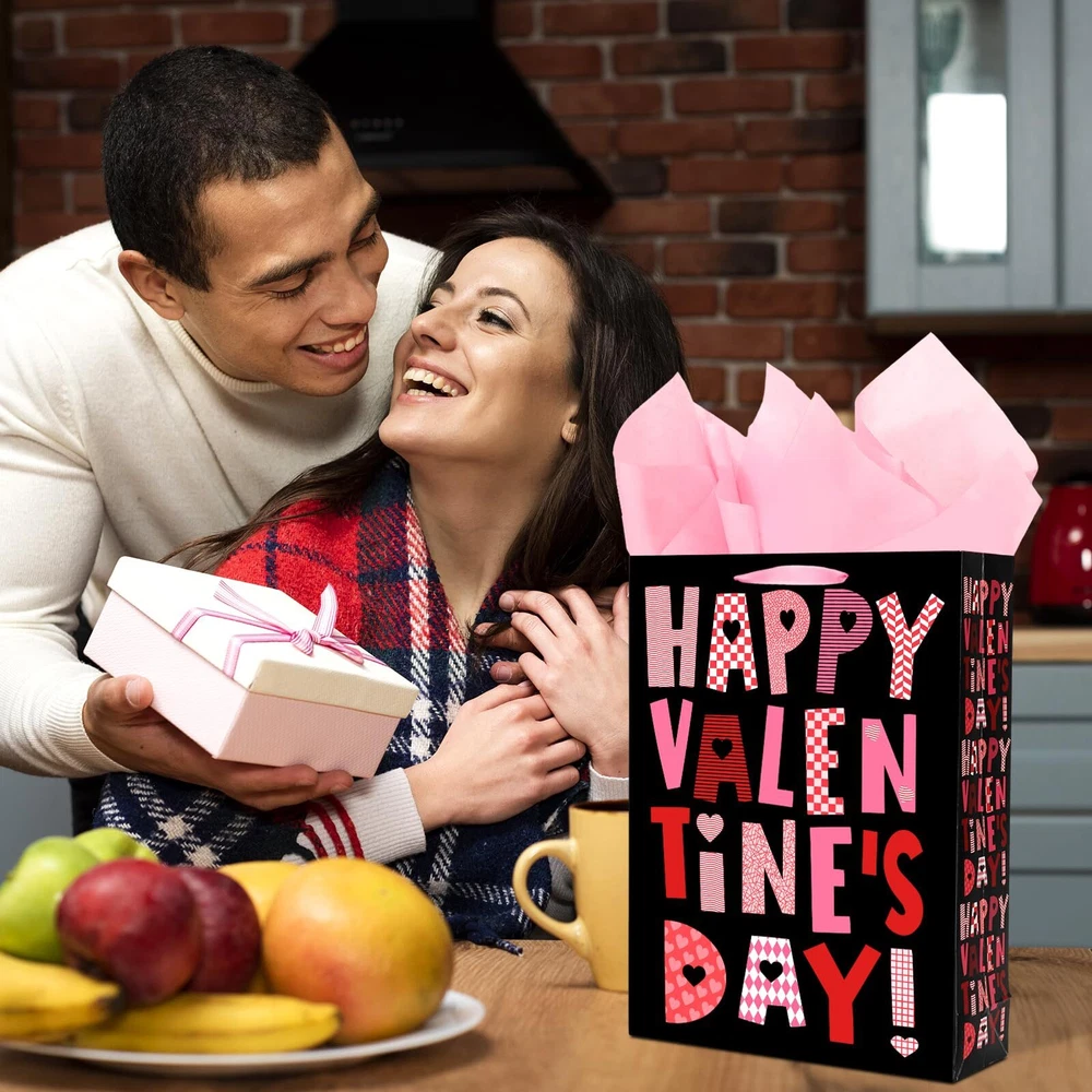 Large Black Valentine Gift Bag with Wrapping Paper for Women Men Anniversary ...