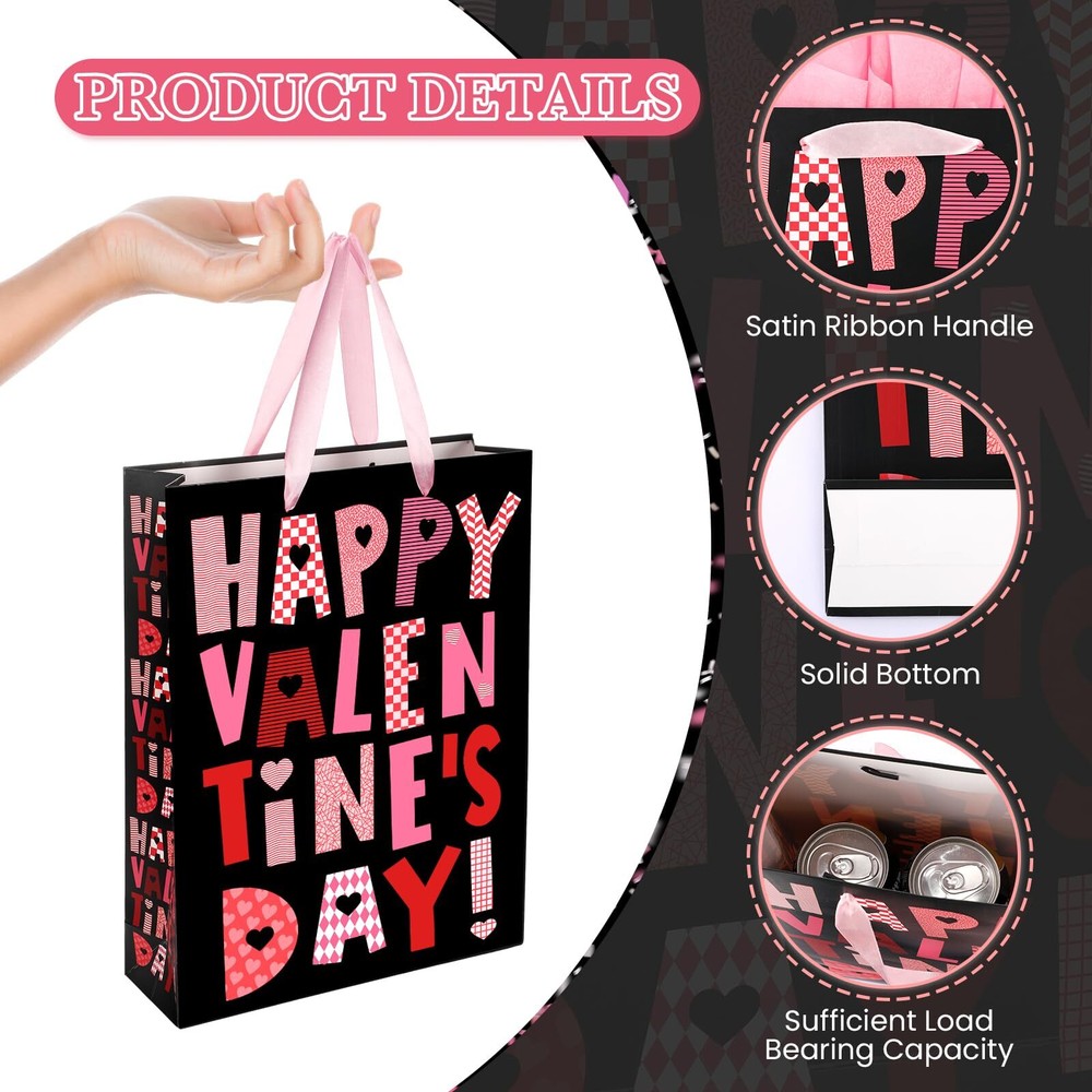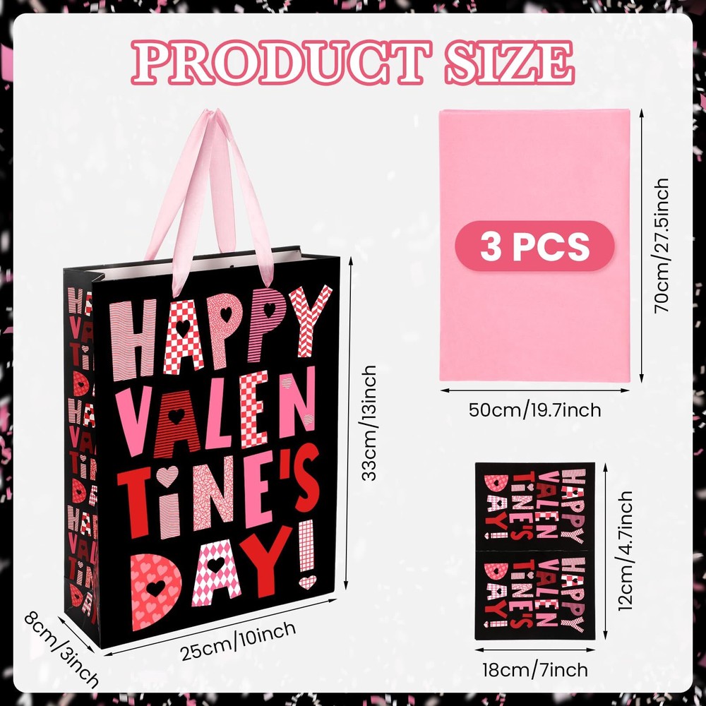 Welcome to Our Store! Quality Products, Satisfaction is what we guarantee. 13" Large Black Pink Valentines Day Gift Bags with Tissue Paper Greeting Card Happy Valentines Day Gift Bags with Handle for Women Men Product Images Product Details Features: Surprise and delight your lover by wrapping gifts in this romantic Valentine's Day gift bag with greeting card and wrapping paper. Occasion: The pink and black Valentine's Day gift bag is suitable for Valentine's Day, wedding, anniversaries, birthday, etc. Specifications: Material: Paper Size:Valentines gift bag:13"x 10"x 3" Valentine's Day card: 5"x 7" Tissue paper: 27.5"x 20" Color: black, pink and red Package : 1x Valentines gift bag:13"x 10"x 3" 1x Valentine's Day card: 5"x 7" 3x Tissue paper: 27.5"x 20" Note: Due to manual measurement, please allow a slight deviation. There may be color differences due to different monitors. Key Features 💕【Package List】You will receive a black and pink Valentine's Day gift bag with handle, a black and pink greeting card and 3 pieces of pink wrapping tissue paper. 💖【Large Size and Durable Material】The large black and pink Valentines gift bag is 13"x 10"x 3", which is big enough to hold most gifts of your choice. The Valentine's Day card is 5"x 7" and the wrapping tissue paper is 27.5"x 20". The material of this Valentine's Day paper gift bag is thick paper, which is strong and durable. 💝【Valentine's Day Design】The romantic Valentine's Day gift bag comes in black, pink and red and has "Happy Valentine's Day" printed on it. There are also heart-shaped, striped, and plaid pattern designs on the letters. 💘【Wide Application】The pink and black Happy Valentine's Day gift bag is suitable for Valentine's Day, wedding, anniversaries, birthday, etc. Great Valentine's Day gift bag for women, men, girlfriend, boyfriend, husband, wife, friends, kids, etc. 💞【Service Guarantee】Thank you for purchasing this item in our store. If you have any problems or unsatisfied with our Happy Valentines gift bags with tissue paper and card, please contact us by Email. We will provide you with satisfactory service. We appreciate your business! Contact Us 📧 If you have any questions, feel free to reach out via the eBay messaging system. We respond to all inquiries within 24 hours. Payment Information 💳 We accept PayPal, credit cards, and other payment methods supported by eBay. Please ensure your payment information is current to avoid delays. Shipping Information We ship to the address on your eBay account. Please confirm your address before completing the purchase. Delivery times are typically 3-5 business days. If there are delays, please allow an extra 1-2 business days due to postal service issues or technical problems. We use trusted shipping services like UPS, FedEx, and USPS. Shipping is available to the contiguous 48 states only. We do not ship to Alaska, Hawaii, US territories, APO/FPO addresses, or PO Boxes. Local pickups are not available. For any issues with delivery, please contact us promptly. Feedback 🌟 We value your feedback and strive to earn your trust. If you're not satisfied with your purchase, please contact us and we'll work to resolve the issue. Return Policy - We offer a 30-day money-back guarantee. - If the item is defective or you are not satisfied, contact us for a replacement or refund. - All returns must be sent to the address provided upon contacting us.
