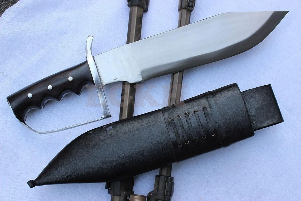 * Specification of 13 Inch Blade Kukri Knife : This is handcrafted kukri therefore please note that each one might have slight variations in measurement. Material Used :-Highly Graded Carbon Steel , Buffalo Leather for Scabbard(outside) and Rosewood for the Handle, Pinewood for the Scabbard (inside), Whitemetal and "Laha" ( Nepali Traditional Glue). Blade Size and Type :- 13 inch (33.02cm) Handmade and Unpolished blade. Handle Size and Type :- 5 inch (12.70cm) Rosewood full Tang G Guard Gripper handle. Upper Spine :-5mm Lower Spine :-3mm Handle Circumference :-5 Inch. Belly :-6.5cm. Hardness of steel :-spine= 22-25 RC, belly= 45-46 RC, edge= 58-60 RC. Weight(Gms) :- 1000.0000