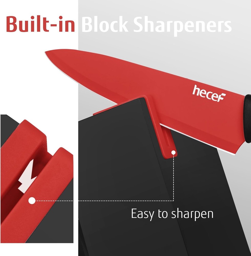 Product Description 13 Pieces Kitchen Knife Set with Built-in Sharpening Wooden Block, High Carbon Stainless Steel Knife Block Set with Steak Knives, Kitchen Scissors, Red ALL-IN-ONE KNIFE SET: The set includes an 8" chef's knife, an 8" bread knife, a 8" slicing knife, a 5" utility knife, a 3.5" paring knife, a pair of kitchen scissors, a 6 pcs steak knife, and a knife block for all of your everyday cutting tasks. PREMIUM MATERIAL/QUALITY KITCHEN KNIFE SET: Our blades are carefully forged from premium martensitic stainless steel for higher corrosion resistance and exceptional durability. BUILT-IN SHARPENER: The knife block comes with a built-in sharpener, saving you from honing blades on a sharpening steel and keeping your knives sharp for a long time. In addition, knives can be stored in knife block, freeing up countertops and saving space. NON-STICK AND ANTI-CORROSION BLADES: The blades are coated with a food-grade red coating that enhances the non-stick performance of the blades so they won't stick when cutting ingredients. It also effectively prevents corrosion and rust. ERGONOMIC HANDLE: This streamlined handle is injection-molded from PP+TPR material, sturdy and durable for a great kitchen experience. The handle has a frosted surface with a non-slip feature that is safe to use and feels comfortable. No fatigue even after prolonged use. About Us We are a reputable seller with many years of experience selling on eBay. Our goal is to provide high-quality products and excellent customer service. Shipping Items will be shipped within 1-3 business days when we received payment. (Orders are not processed on weekends & holidays) Tracking information will be sent once item is shipped. Delivery time depends on destination and other factors Item is shipped to ebay address. Leaving correct address can minimize delay. For international shipping and shipping to Guam, Hawaii and Alaska, Please contact us before placing the order. International buyers please note: Import duties, taxes and charges are not included in the item price or shipping charges. These charges are buyer’s responsibility. We will try our best to reduce the risk of the custom duties. Local pick-up is unavailable at the moment. Contact Us We reply any email messages within 1 business / working days(off-duty at weekend). If you do not get a response from us, then please check your junk or spam mailbox. Our Business hours: Mon-Fri 9:00-18:00, UTC/GMT +8 hours. Please contact us either by clicking "contact seller" in the "purchase history" section or simply click "ask a question" at the bottom of this page. If you are unsatisfied with our item or service, please contact us before leaving any feedback. We are committed to resolve all issues in a friendly and satisfactory manner.