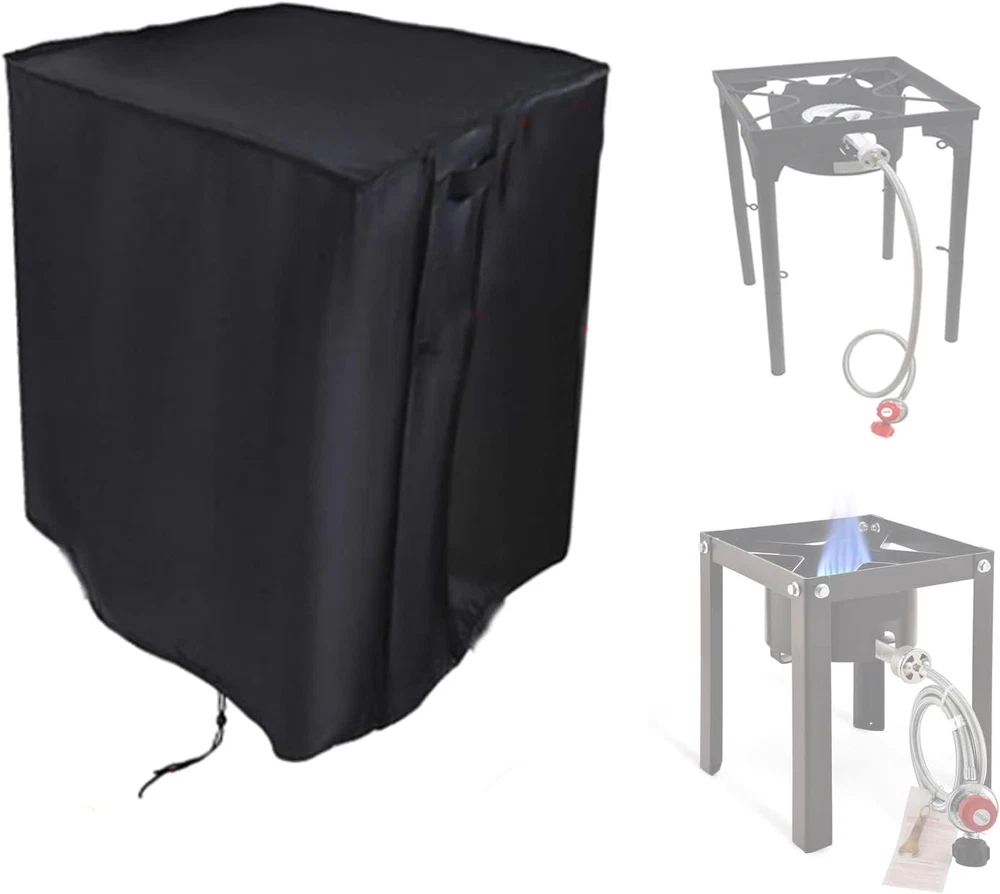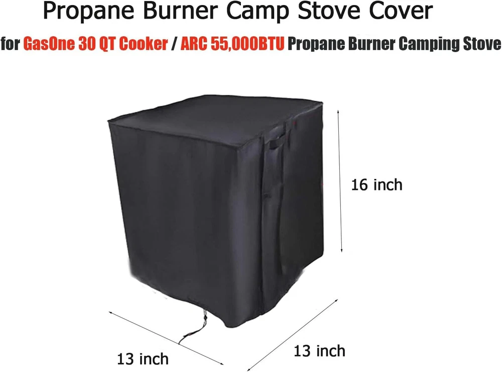 Perfect Fit for Single Burner Stoves : Measures 13x13x16 inches (LxWxH), designed to fit GasOne Turkey Fryer 30 QT Cooker and similar-sized single burner stoves. Please confirm your stove's dimensions before ordering. Durable Waterproof Protection : Made from 420D Oxford fabric with PU coating, this cover protects your propane burner camp stove from rain, snow, dirt and dust extending its lifespan. Windproof Design : Features a drawstring at the bottom and plastic buckles for a snug, secure fit, ensuring the cover stays in place during strong winds. Easy to Clean : Simply hose off or wipe with a damp cloth to remove dirt, then let it air dry in the sun for your next use. Important Note : Allow your propane burner camp stove to cool completely before covering. Thank you for viewing our 13" Small Stove Cover for GasOne Turkey Fryer 30 QT Cooker, Square Cooker Cover.
