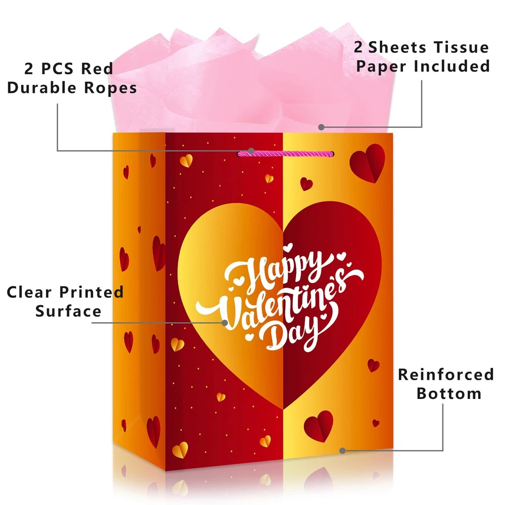 Welcome to Our Store! Quality Products, Satisfaction is what we guarantee. 13" Valentines Day Gift Bag with Tissue Papers Happy Valentines Day Gift Bag with Handles Love Heart Paper Goodies Treat Bag for Valentine's Day Gift Bags for Girlfriend Boyfriend Wife Husband Product Images Product Details Large Love Heart Gift Bags with Tissue Paper, Romantic Valentines Gift Bags for Her Him Girlfriend Boyfriend Wife Husband Women Specification Package : 1 x Valentine’s Day gift bag 2 x Pink tissue papers Size: 13 x 10.2 x 5.9 inch Color: As the pictures show Material: Paper Notes: Manual measurement, please allow slight errors on size. The color may exist a slight difference due to different screen displays. Key Features Happy Valentine's Day Gift Bag: Package 1 large valentines day paper bag, 2 sheets of pink tissue papers. With handles design,Valentine's Day paper bags are perfect for craft and DIY, you can decorate it with beautiful ribbons, especially for Valentine’s day party decorations Valentines Day Storage Bags: The Valentine’s Day party favors bags measure about 13"H x 10.2"L x 5.9"W. Large capacity can be applied as storage bags or gift bags, perfect for containing candy, goodies, clothing, toys, chocolates, cookies, gifts, Jewelry for date preparation Love Heart Gift Bag Design: Valentine Paper gift bag features love elements and patterned with gold and red love heart interspersed with colorful small love hearts, which looks vivid and adorable. Eye-catching “Happy Valentine’s Day” and “Love You” will add a festive atmosphere Quality Valentines Gift Bags for Women: Valentines day goodie bag is made of high quality paper material, it has beautiful shape, lightweight and reusable, easy to break, can be applied for a long time Valentines Day Giftbags: These Valentine gift bags with tissue paper are very suitable for Valentine's Day gift bag, Anniversary gift bag, holiday bag, party favor bag, Valentine’s night decoration We appreciate your business! Contact Us 📧 If you have any questions, feel free to reach out via the eBay messaging system. We respond to all inquiries within 24 hours. Payment Information 💳 We accept PayPal, credit cards, and other payment methods supported by eBay. Please ensure your payment information is current to avoid delays. Shipping Information We ship to the address on your eBay account. Please confirm your address before completing the purchase. Delivery times are typically 3-5 business days. If there are delays, please allow an extra 1-2 business days due to postal service issues or technical problems. We use trusted shipping services like UPS, FedEx, and USPS. Shipping is available to the contiguous 48 states only. We do not ship to Alaska, Hawaii, US territories, APO/FPO addresses, or PO Boxes. Local pickups are not available. For any issues with delivery, please contact us promptly. Feedback 🌟 We value your feedback and strive to earn your trust. If you're not satisfied with your purchase, please contact us and we'll work to resolve the issue. Return Policy - We offer a 30-day money-back guarantee. - If the item is defective or you are not satisfied, contact us for a replacement or refund. - All returns must be sent to the address provided upon contacting us.