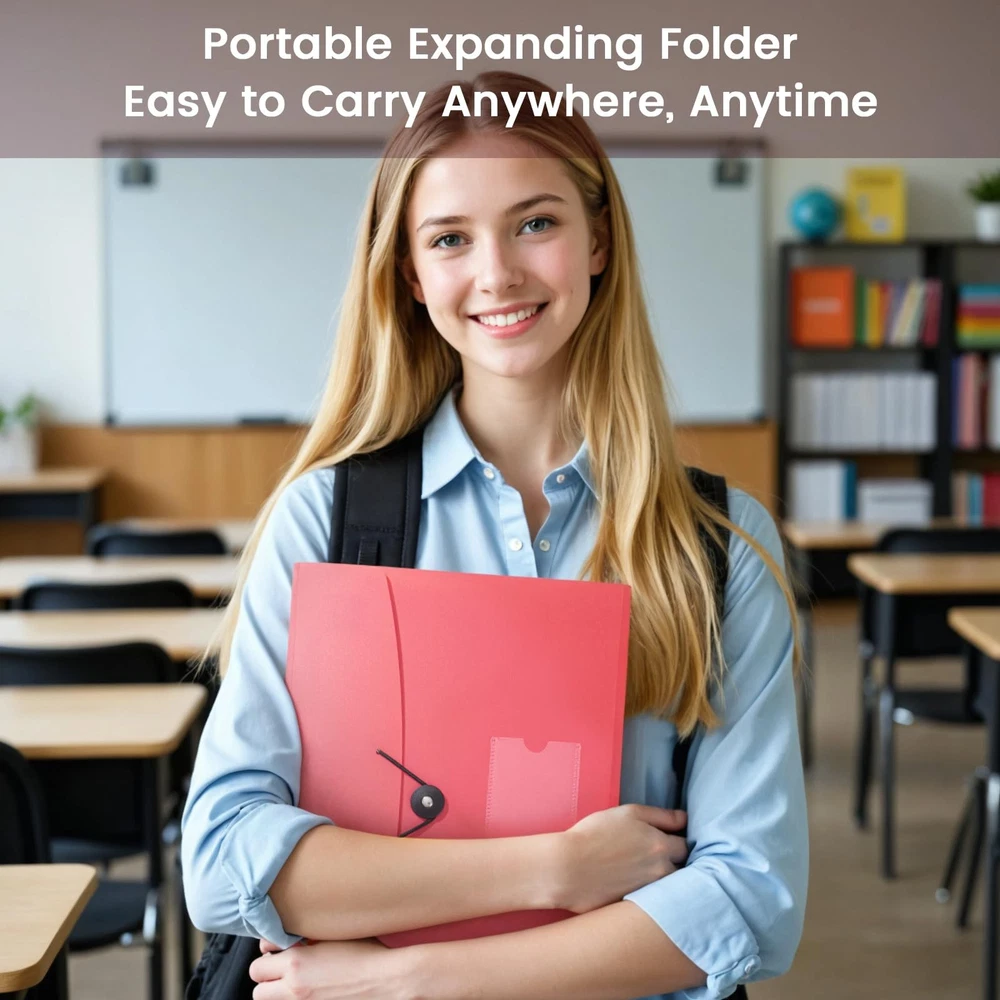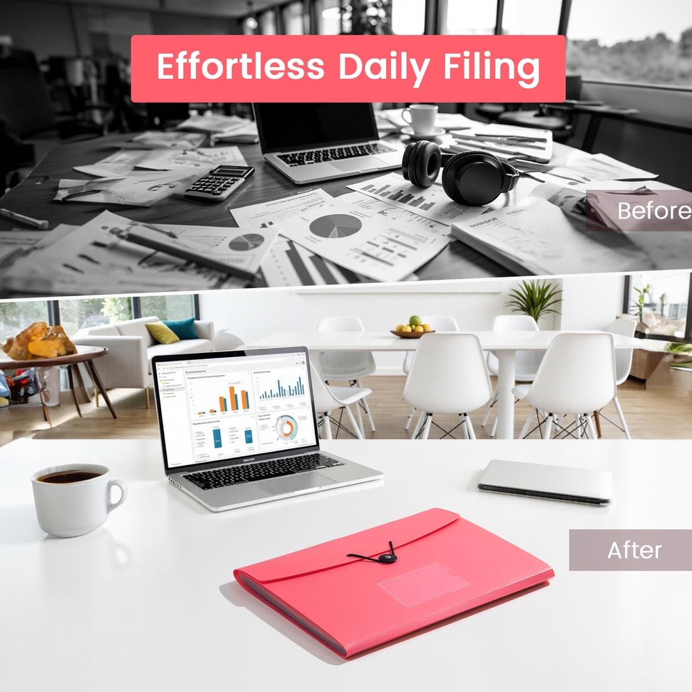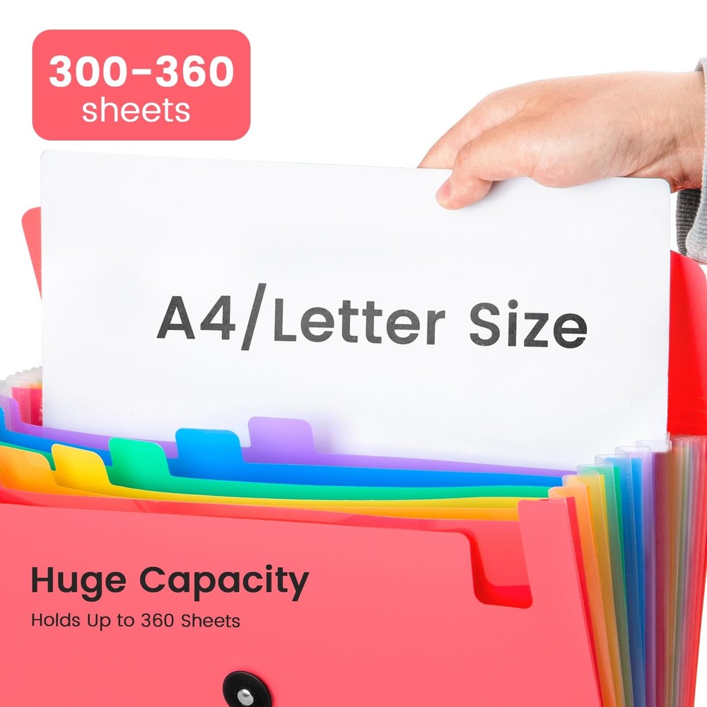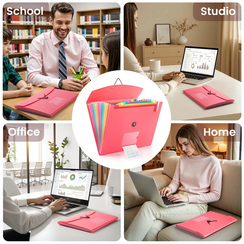 13 Pocket Expanding File Folder Features: 1. Accordian file organizer for storing important papers or documents 2. High quality material provides waterproof and tear-resistant performance 3. The elastic buckle design allows you to store paper more securely 4. The accordion file organizer features colorful compartments for easy file classification and quick access Package includes: 1 x 13 Pocket Accordion Folder 1 x 12 Writable blank label Size: 13x 9.6 inches Color: Pink Extra Capacity: 13 pocket accordion folder size is 13 x 9.6 inches, holds up to 300~360 sheets of paper. Comes with 12 writable labels to help find what you want easily Built to Last: The expandable file folder is made of high quality and safety material. The materials are durable and resistant to breaking and getting misshapen Colored Design: Accordian file organizer has colorful compartments to better gives your files a convenient classification so that you can quickly find the files you need Applicable Scope: This folder is ideal for sorting utility bills, invoices, letters, A4 papers, and more. It’s great for home, office, school, etc. An excellent alternative to a binder Elastic Buckle Design: The expanding file folder features a flap with elastic cord closure, protecting documents safe and firmly in place during transport