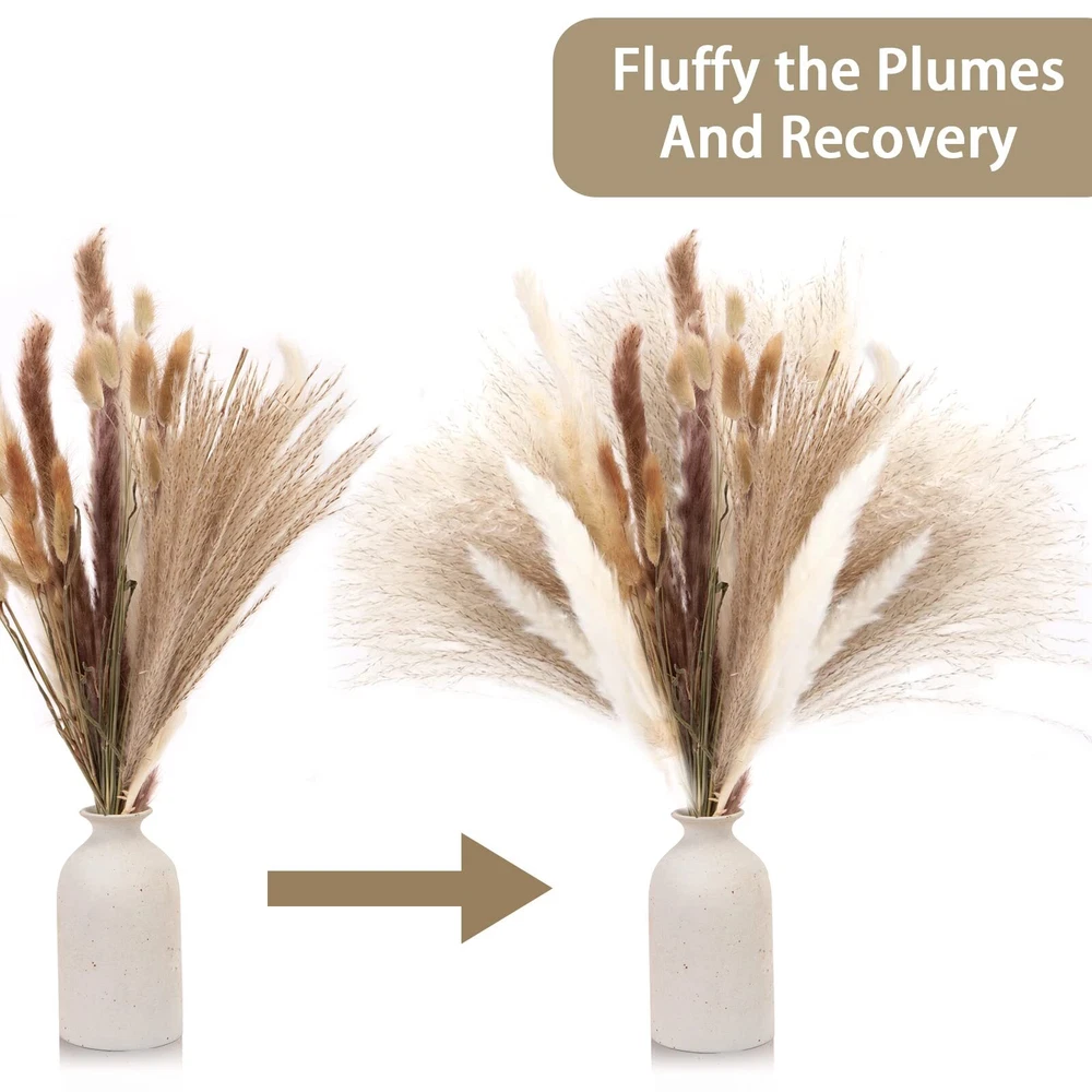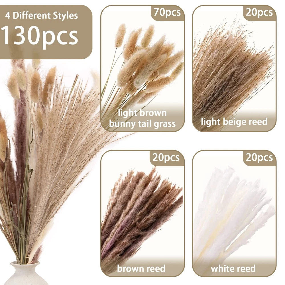 What's include: carefully selected 4 different types natural pampas grass branches, white reed (20pcs), light beige reed (20pcs), brown reed (20pcs), and light brown bunny tail grass(70pcs) for you to collocate and decorate Premium quality: Our pampas grass dried plants are made from 100% natural high-quality grass, giving you the original touch Warm tips: our dried pampas grass plumes will shed if you shake these grass. Although long-distance delivery may lead to misshapen plumes, these pampas grass will recover immediately if you fluff the plumes Multiple Occasions: Our pampas grass is perfect for home, office, party, garden, cafe, patio, fall wedding decorations. You can use these dried grass as DIY supplies, additions for a bundle of flowers, vase decor, etc. Feel free to cut the pampas grass to adapt your own decor needs Elegant color: pampas grass about 17 inches in height, suitable for small and medium-sized pampas grass vase, fall vase filler have natural color overall elegance Smooth, warm color palette can give you autumnal atmosphere