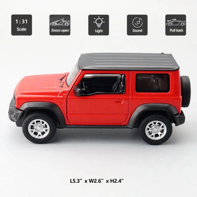 1/31 Suzuki Jimny SUV Model Toy Car Diecast Toy Vehicle Metal Toys for Kids Red Item Type Diecast & Toy Vehicles Scale 1:31 Material Diecast and ABS Colour Red Dimension About L5.3" x W2.6" x H2.4" (L13.5 x W6.5 x H6.0 cm) Vehicle Type SUV Vehicle Year 2018 Function *Pull back *Press the car or open the door, it will make sound light *Two doors can be open Packing Packed in original colour box, in excellent condition Power 3 x AG13/LR44 button cell, power is just for light and sound Tips *Great choice of gift for kids, especially for Birthday, Christmas and New Year Gift *Great item for collector, business gift, home decoration, office decoration, display Warning Don't put in mouth/Keep Away from Fire/Not for Children under 3 Years Notice Due to manual measurement, please allow a little error Package include 1 x 1:31 Scale Suzuki Jimny 2018 Model Car (The Batteries NOT Included) Payment Delivery details Terms of sales Payment We accept paypal only. Delivery details We ship orders within 24 hours upon receipt of payment. Terms of sales We provide great products and service. If you have any problems with the order,please do contact us before leaving negative feedback and opening case on eBay.