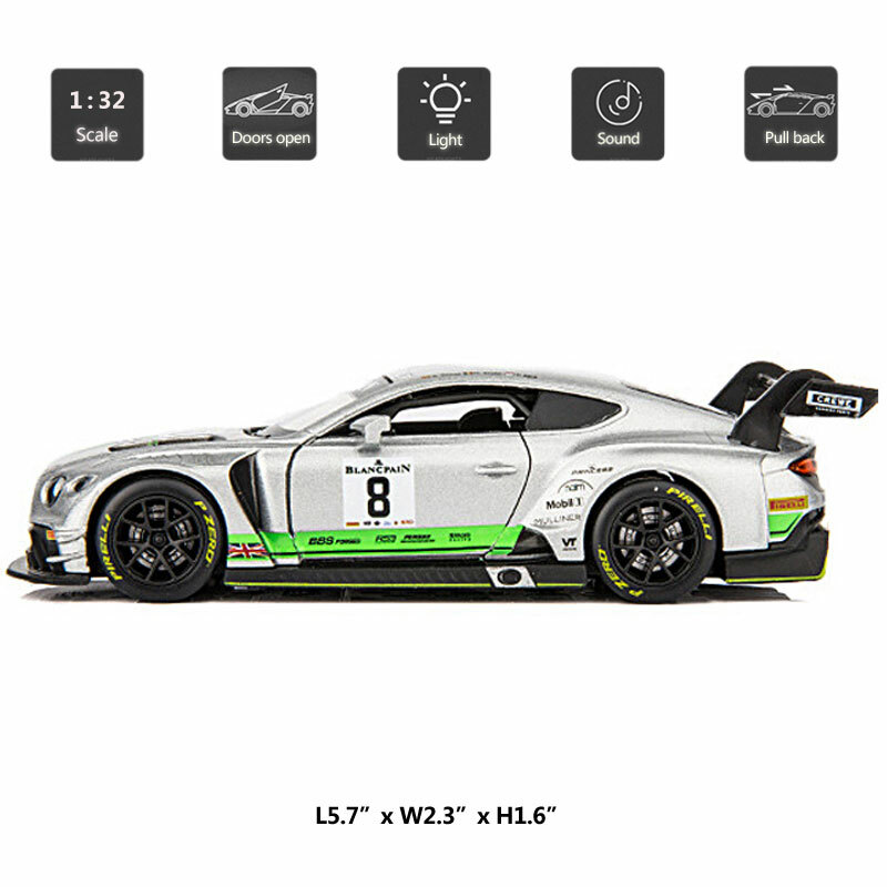 1/32 Bentley Continental GT3 Model Toy Car Diecast Toy Vehicle Metal Zinc Alloy Item Type Diecast & Toy Vehicles Scale 1:32 Material Diecast and ABS Colour Grey and green, as picture shows Dimension About L5.7" x W2.3" x H1.6" (L14.4 x W5.9 x H4 cm) Vehicle Type Racing car Function *Pull back *Two doors and engine cover can be open *Press the car or open the door, it will make sound and light Packing Packed in original colour box, in excellent condition Power 3 x AG13/LR44 button cell, power is just for light and sound Tips Great choice of gift for kids, especially for Birthday, Christmas and New Year Gift Great item for collector, business gift, home decoration, office decoration, display Warning Don't put in mouth/Keep Away from Fire/Not for Children under 3 Years Notice Due to manual measurement, please allow a little error Package include 1 x Bentley Continental GT3 1:32 Scale Model Car ( Batteries Not Included ) Payment Delivery details Terms of sales Payment We accept paypal only. Delivery details We ship orders within 24 hours upon receipt of payment. Terms of sales We provide great products and service. If you have any problems with the order,please do contact us before leaving negative feedback and opening case on eBay.