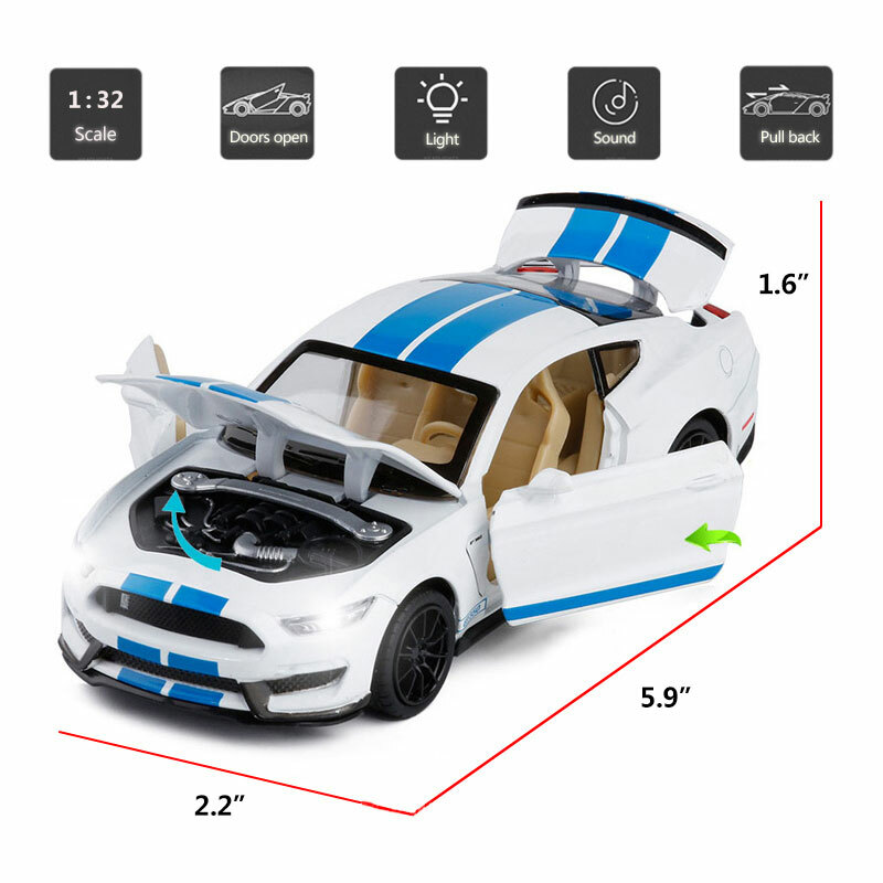 1:32 Scale Ford Mustang Shelby GT350 Model Car Diecast Vehicle Toys for Kids Item Type Diecast & Toy Vehicles Scale 1:32 Material Diecast and ABS Color Red, white and blue, as picture shows Dimension About L5.9" x W2.2" x H1.6" (L15.0 x W5.7 x H4.1 cm) Vehicle Type Sports Car Function *Pull back *Open the door, it will make sound and light *Two doors, engine cover and trunk lid can be open Packing Packed in original color box, in excellent condition Power 3 x AG13/LR44 button cell, power is just for light and sound Tips *Great choice of gift for kids, especially for Birthday, Christmas and New Year Gift *Great item for collector, business gift, home decoration, office decoration, display Warning Don't put in mouth/Keep Away from Fire/Not for Children under 3 Years Notice Due to manual measurement, please allow a little error Package include 1 x 1:32 Scale Ford Mustang Shelby GT350 Model Car ( Batteries Not Included ) Payment Delivery details Terms of sales Payment We accept paypal only. Delivery details We ship orders within 24 hours upon receipt of payment. Terms of sales We provide great products and service. If you have any problems with the order,please do contact us before leaving negative feedback and opening case on eBay.