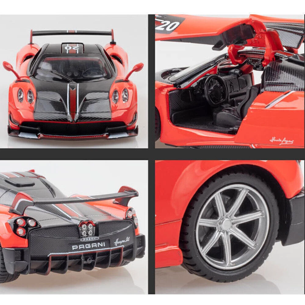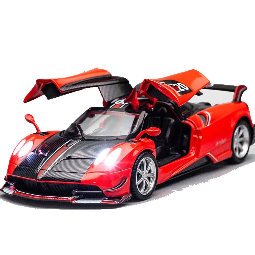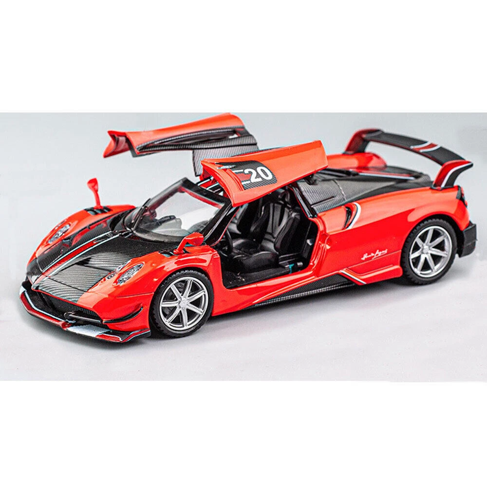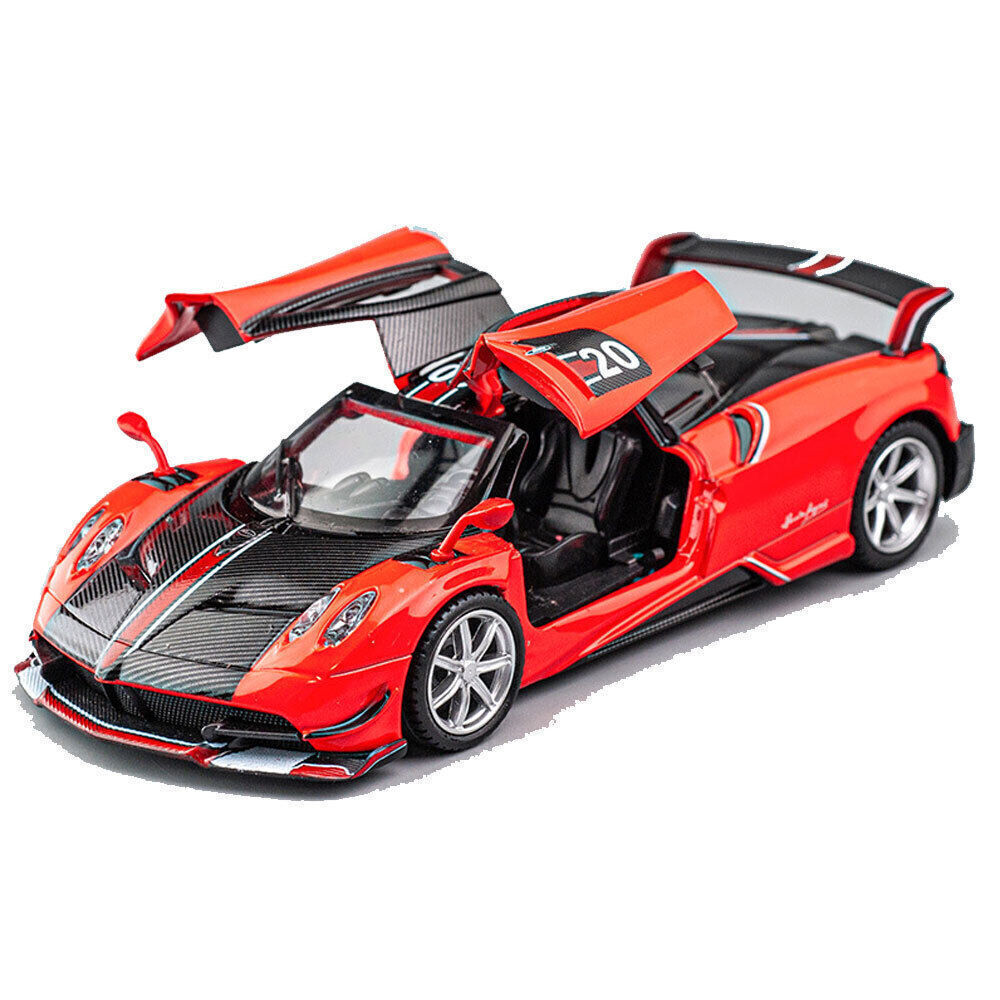 Item Type Diecast & Toy Vehicles Scale 1:32 Material Diecast and ABS Colour Red, as picture shows Dimension About L6.1" x W2.6" x H1.7" (L15.5 x W6.6 x H4.2 cm) Vehicle Type Supercar Function *Pull back *Open the door, it will make sound and light *Press the button on the car, two doors can be open *The stand is a mobile phone support, also you can put pens and bussiness card with the stand Power 3 x AG13/LR44 button cell, power is just for light and sound Packing Packing in bubble wrap, without color box Tips *Great choice of gift for kids, especially for Birthday, Christmas and New Year Gift *Great item for collector, business gift, home decoration, office decoration Warning Don't put in mouth/Keep Away from Fire/Not for Children under 3 Years Package include 1 x 1:32 Scale Pagani Huayra BC Model Car (Without box Batteries Included)