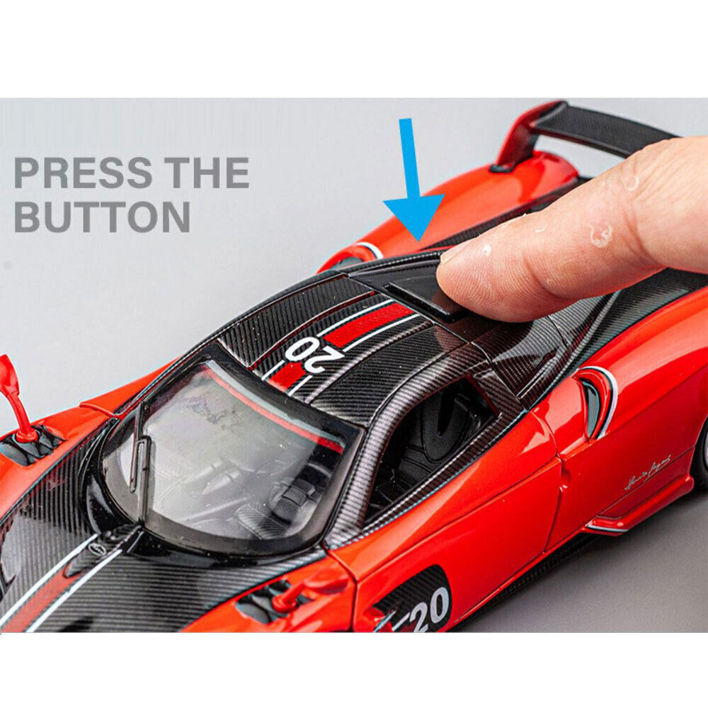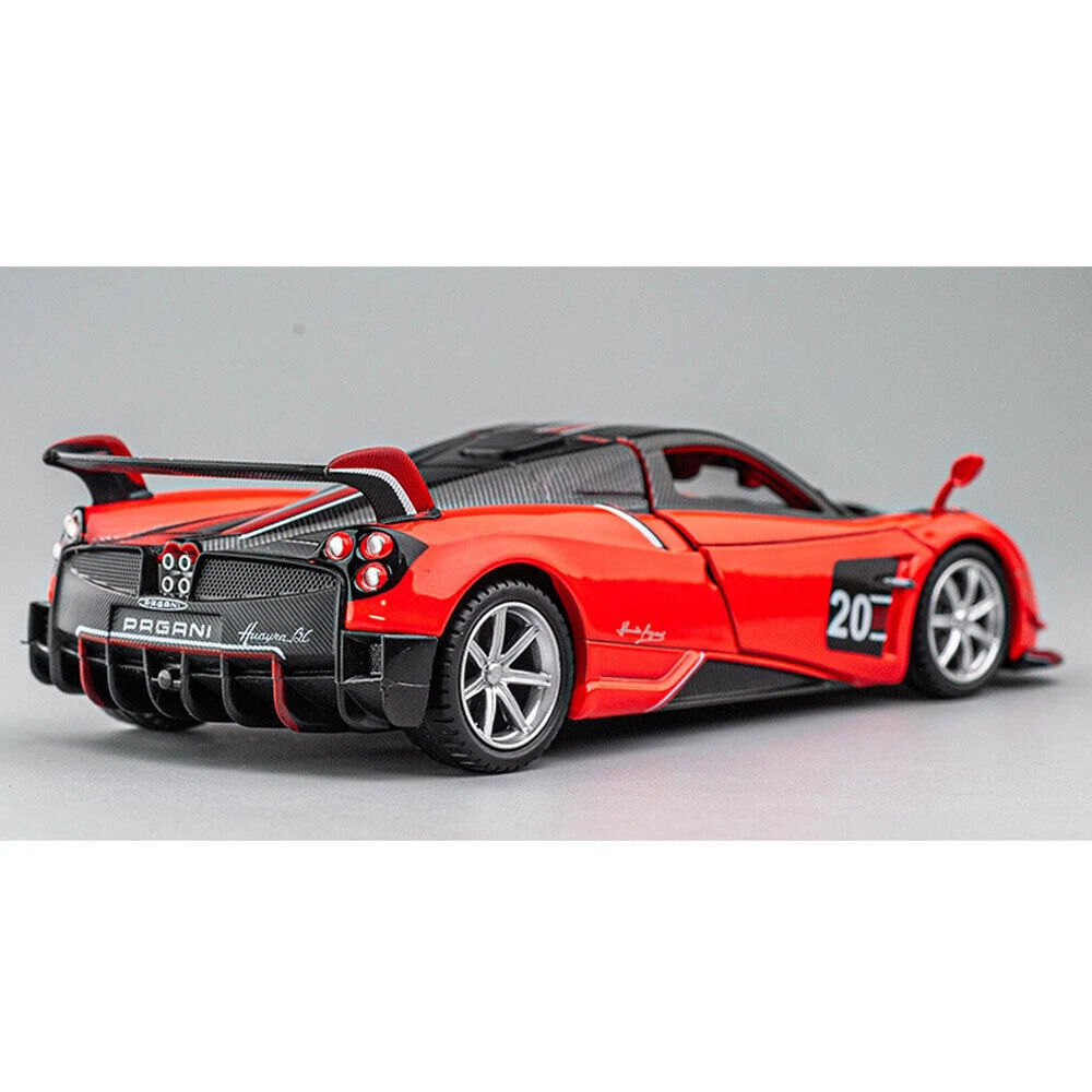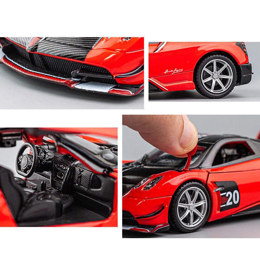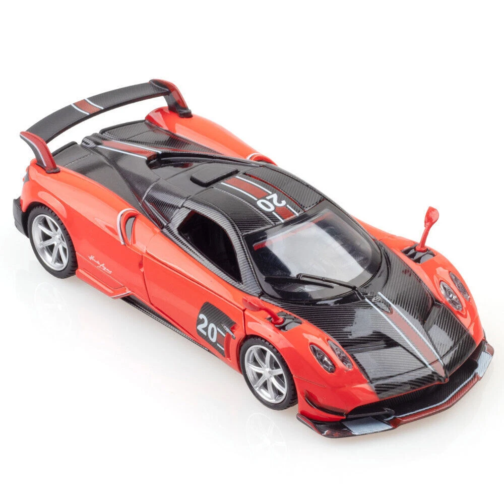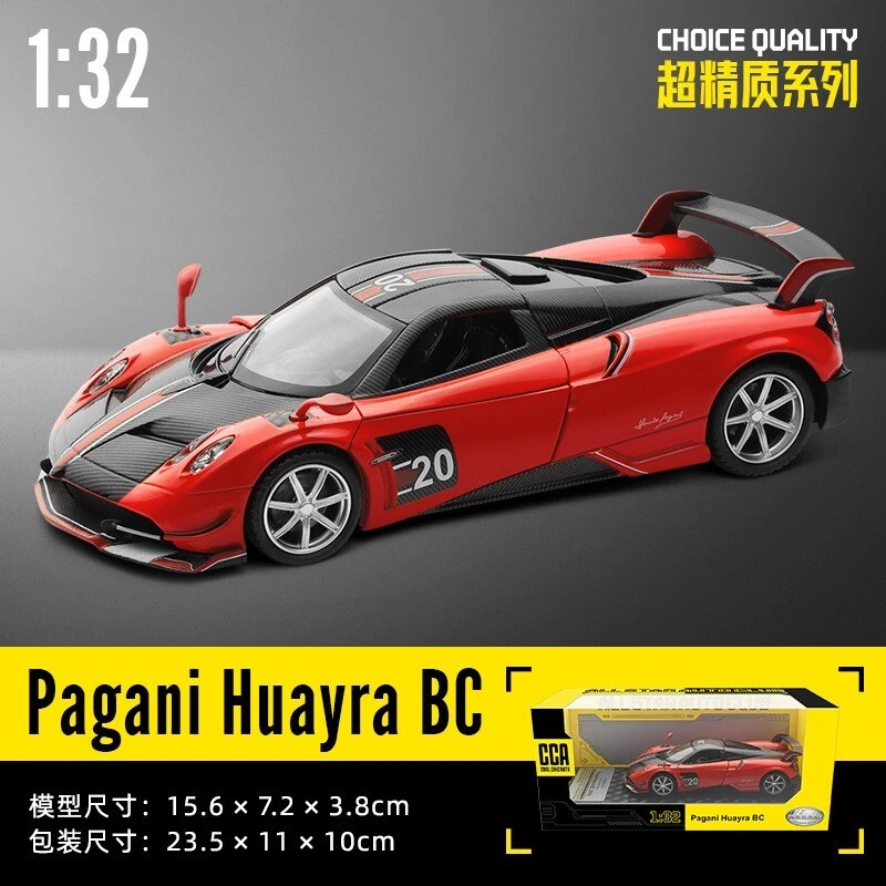 Item Type Diecast & Toy Vehicles Scale 1:32 Material Diecast and ABS Colour Red, as picture shows Dimension About L6.1" x W2.6" x H1.7" (L15.5 x W6.6 x H4.2 cm) Vehicle Type Supercar Function *Pull back *Open the door, it will make sound and light *Press the button on the car, two doors can be open *The stand is a mobile phone support, also you can put pens and bussiness card with the stand Power 3 x AG13/LR44 button cell, power is just for light and sound Packing Packing in bubble wrap, without color box Tips *Great choice of gift for kids, especially for Birthday, Christmas and New Year Gift *Great item for collector, business gift, home decoration, office decoration Warning Don't put in mouth/Keep Away from Fire/Not for Children under 3 Years Package include 1 x 1:32 Scale Pagani Huayra BC Model Car (Without box Batteries Included)