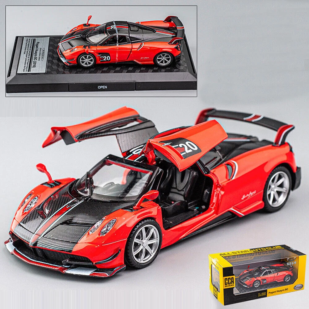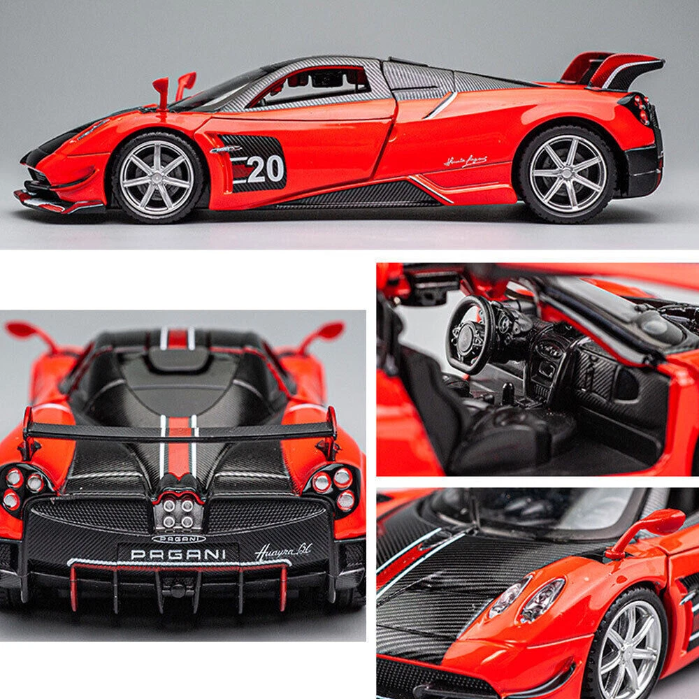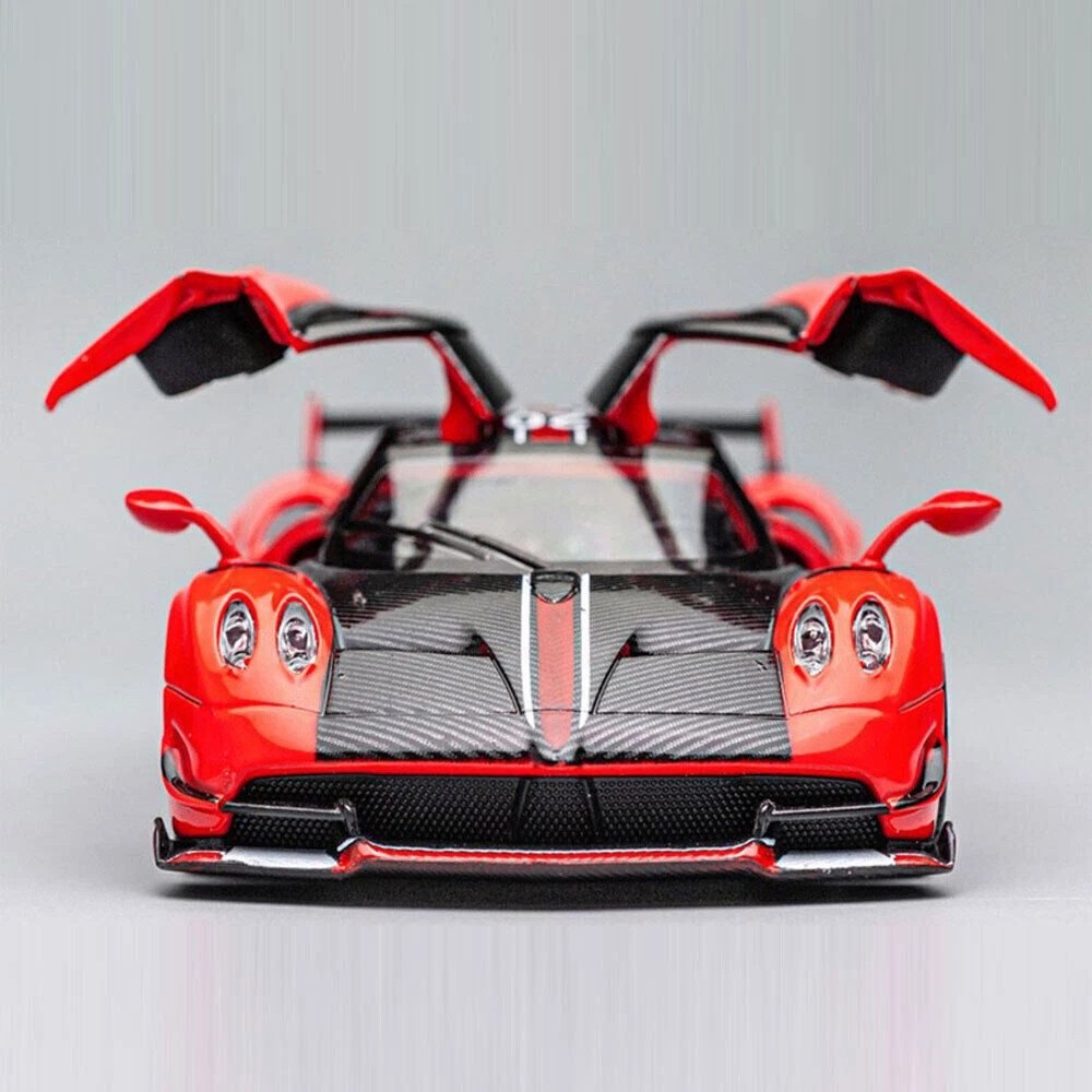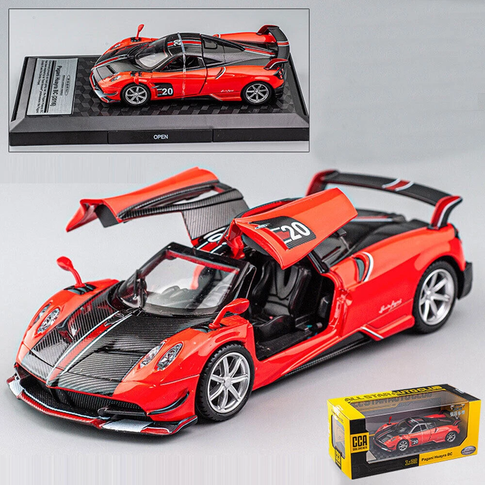 Item Type Diecast & Toy Vehicles Scale 1:32 Material Diecast and ABS Colour Red, as picture shows Dimension About L6.1" x W2.6" x H1.7" (L15.5 x W6.6 x H4.2 cm) Vehicle Type Supercar Function *Pull back *Open the door, it will make sound and light *Press the button on the car, two doors can be open *The stand is a mobile phone support, also you can put pens and bussiness card with the stand Power 3 x AG13/LR44 button cell, power is just for light and sound Packing Packing in bubble wrap, without color box Tips *Great choice of gift for kids, especially for Birthday, Christmas and New Year Gift *Great item for collector, business gift, home decoration, office decoration Warning Don't put in mouth/Keep Away from Fire/Not for Children under 3 Years Package include 1 x 1:32 Scale Pagani Huayra BC Model Car (Without box Batteries Included)