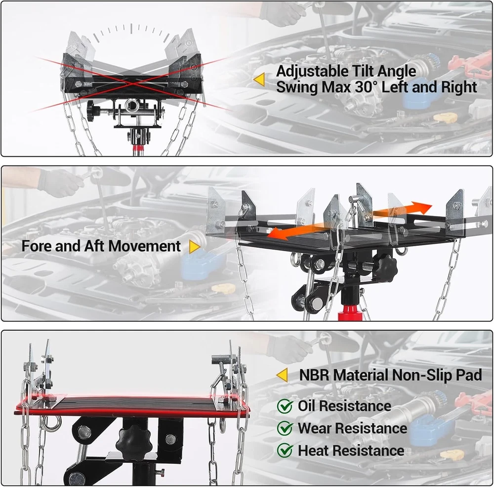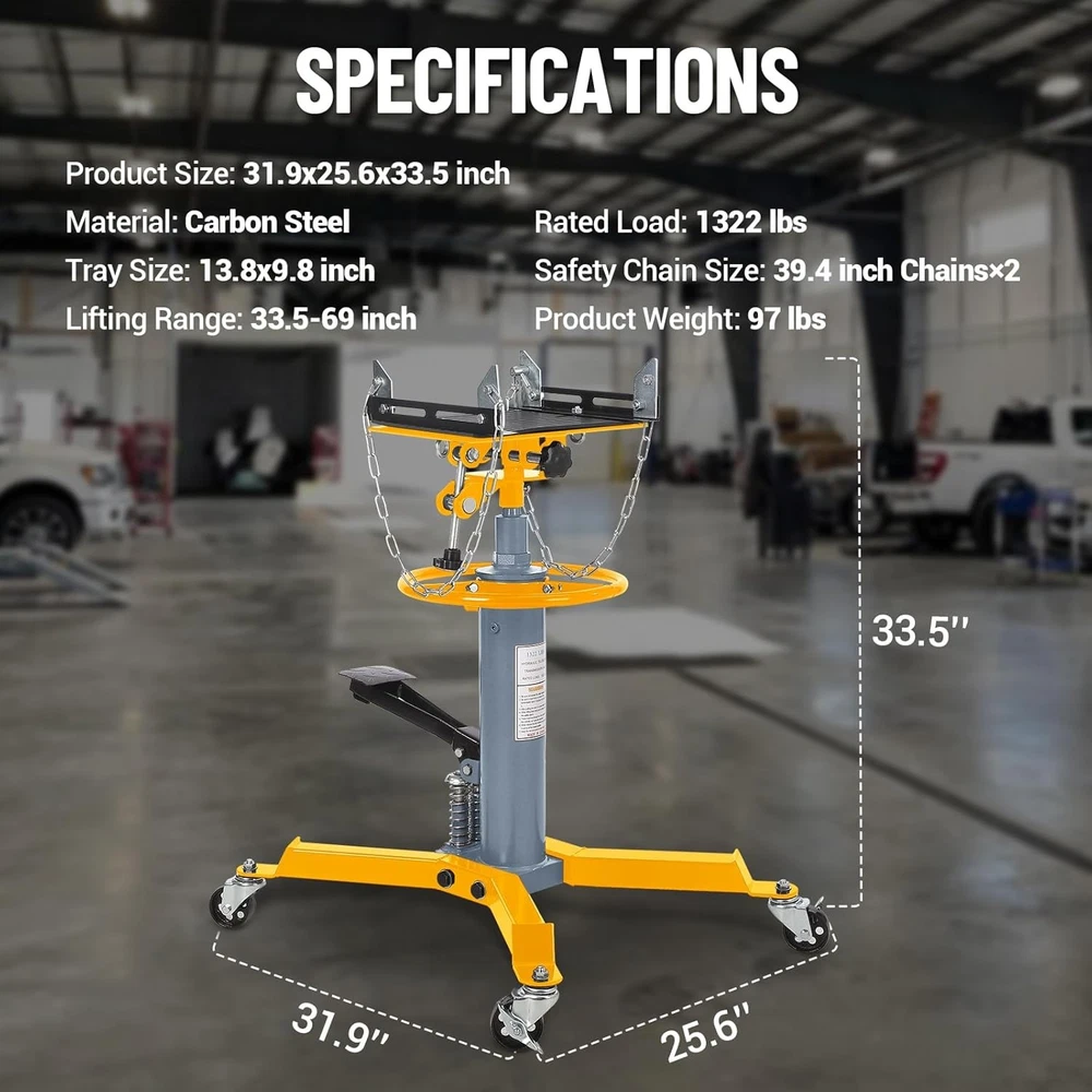 Specifications: Style: 1322 lbs Lifting range:33.5"-69" Material:Carbon Steel Vehicle Service Type:Car Features: 【Advanced Dual Plunger Hydraulic System】- The Hydraulic transmission jack features an innovative dual plunger design, enabling it to reach maximum lifting height in just 20 seconds—significantly faster than traditional single plunger jacks. This efficiency helps streamline the removal, installation and transportation of transmissions and transfer cases on vehicles supported by lifts, saving you valuable time in your automotive tasks. 【1322 LBS Load Capacity】- This hydraulic transmission jack is engineered from robust carbon steel, ensuring exceptional durability and strength, and maximum load capacity is up to 1322lbs. Its wide base provides enhanced stability, while the two heavy-duty safety anchor chains securely hold the load in place, allowing for safe and efficient transmission service. In addition, it comes with an 8MM thick anti-slip pad to ensure safe load. 【33.5"-69" Adjustable Lifting Height】- Featuring a two-stage telescoping design, our transmission jack adjusts effortlessly from 33.5 inches to 69 inches. This versatility is complemented by a convenient foot-operated pedal and a 30° tilting tray, accommodating various vehicle models and transmission sizes for optimal usability. 【Stable & Precise Control】- Our dual hydraulic lifting system utilizes a foot pedal mechanism, providing superior control compared to manual options. When the handle is released, the foot pedal enables slow and controlled descent of the transmission, ensuring precise positioning during repairs and minimizing the risk of damage to components. 【Effortless Mobility】- Our professional hydraulic transmission jack is equipped with four swivel casters, two of which have brakes, facilitating smooth movement and security between vehicles. An auxiliary ring located at the center of the jack enhances mobility, allowing for easy pushing or pulling by hand during transport. 【Versatile Applications】- This heavy-duty hydraulic transmission jack is ideal for America's automotive professionals and enthusiasts alike, perfect for the installation and removal of various automotive and light truck transmissions, making it a must-have tool for any workshop or garage. Payment Delivery Returns Feedback We accept Payoneer only. All major credit cards are accepted through secure payment processor PayPal. Payment must be received within 7 business days of auction closing. If you have bought multiple items from me, you can send me one payment for all the items instead of paying for them individually. When you click the Pay Now button, eBay will automatically determine if there are other items you have won or purchased from me and will combine them for your review. NOTE: Import duties, taxes and chargers are not included in the item price or shipping charges. These charges are the buyer's responsibility. Please check with your country's customs office to determine what these additional costs will be prior to bidding buying. 1. We will delivery out at the handing time when we receive the payment. 2. The delivery time is 3-5 business days to US by usually time.The parcel maybe delay 1-2day of the weekend.Due to the bad weather,Holidays,Hot Season ect.the parcel maybe delay,If you have any problems,mssage us,we will try our best to solve it. 3. We ship to your eBay address. Please make sure your eBay address is correct before you pay. 4. If you want to change the shipping address,message us before our send out. 5. We cannot deliver your order if your state is PR. 1. If you donot receive the items at the delivery time,the parcel has broken/missing,Please message us before you open case/return,we will try our best to solve it. 2. We offer a 30 day return policy from checkout winning date. 3. An RMA number is required for all returns. Message us for return instructions. Items Returned without a RMA number will not be processed. 4. Items defective upon receipt must be packaged in their retail packaging as if new and returned with a detailed description of the problem. 5. Return shipping fees are not refundable.We reserve the right to decline any returns if the above guidelines are not followed. If you are not satisfied with the item for any reason, please do not quick to leave negative/neutral feedback even open request and case without any communication with us. We devote ourselves making EVERY CUSTOMER in 100% Satisfactory and resolve any problem. Thank you for your understanding and recognition,we are always leave positive feedback to all our customers. About Reply: All replies will be sent to your email box, if you do not get response within 24 hours (Sat. & Sun. excluded) please check your eBay My Messages in case that our emails will be filtered automatically by your settings.