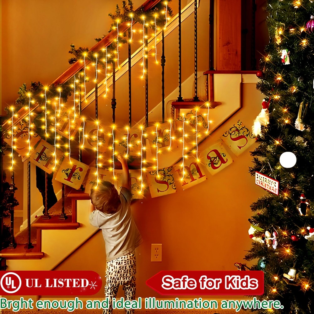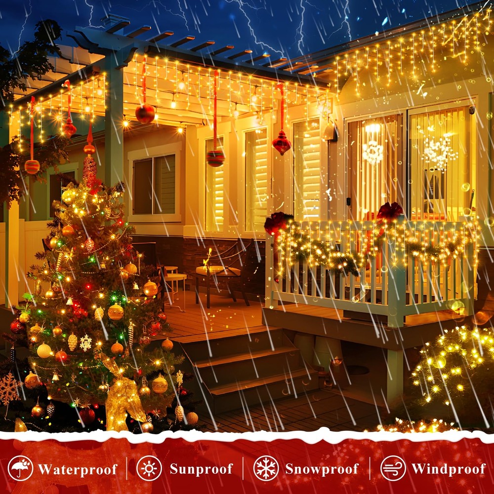Christmas Decoration Ice Lights: These Ice String Lights are 132ft long with 240 drops, and they feature 1280 quality crystal clear led lights.HANGING FROM ROOF LINES, PORCHES FENCES AND RAILINGS,IT WILL INSTANTLY TRANSFORM YOUR DECORATED SPACE INTO FUN, RELAXING, COZY AND FESTIVE. 8 Lighting Modes: You can choose from 8 different lighting modes (Combination, In Waves, Sequential, Slo-glo, Chasing/Flash, Slow Fade, Twinkle/Flash, and Steady On.) for an extra festive display.CUSTOMIZE YOUR OWN MOOD LIGHTING,MAKING THE HOLIDAYS SPECIAL THIS YEAR WITH SOME BRIGHT LIGHTS AND COLORFUL CHEER. Timer and Memory Function: The outdoor Christmas lights built in timer function:6 hours on 18 hours off.Memory function can recover from the previous setting mode when you restart. Plug the led outdoor christmas lights into an outdoor timer, preferably one that automatically turns on when it gets dark out. UL Listed For Outdoor: brand Christmas fairy string lights are IP44 waterproof and built to stand up against harsh environmental elements while maintaining safe connections.NOVEL AND CLASSIC DESIGN,IT’S PERFECT FOR DECORATING CHRISTMAS,NEW YEAR,ANNIVERSARY, BIRTHDAY ,VALENTINE'S DAY, WEDDING,ETC. High-End Christmas lights: The 8 modes are carefully designed to provide a variety of choices while greatly reducing energy consumption. The timer function precisely controls the time of use, realising the efficient use of energy and contributing to sustainable development.