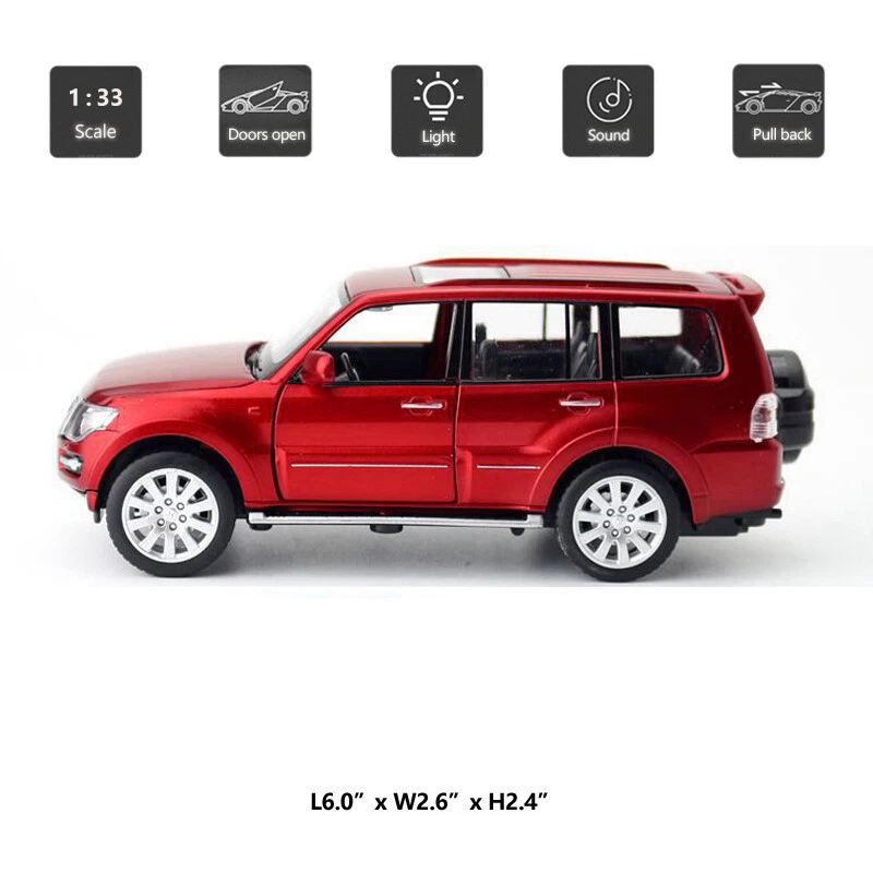 1/33 Mitsubishi Pajero Model Toy Car Diecast Toy Vehicle Metal Alloy Kids Toys Item Type Diecast & Toy Vehicles Scale 1:33 Material Diecast and ABS Colour Red, black and silver, as picture shows Dimension About L6.0" x W2.6" x H2.4" (L15.0 x W6.5 x H6.0 cm) Vehicle Type SUV Function *Pull back *Press the car or open the door, it will make sound and light *Two doors, engine cover and back door can be open Packing Packed in original colour box, in excellent condition Power 3 x AG13/LR44 button cell, power is just for light and sound Tips *Great choice of gift for kids, especially for Birthday, Christmas and New Year Gift *Great item for collector, business gift, home decoration, office decoration, display Warning Don't put in mouth/Keep Away from Fire/Not for Children under 3 Years Notice Due to manual measurement, please allow a little error Package include 1 x 1:33 Scale Mitsubishi Pajero Model Car (Batteries Not Included) Payment Delivery details Terms of sales Payment We accept paypal only. Delivery details We ship orders within 24 hours upon receipt of payment. Terms of sales We provide great products and service. If you have any problems with the order,please do contact us before leaving negative feedback and opening case on eBay.