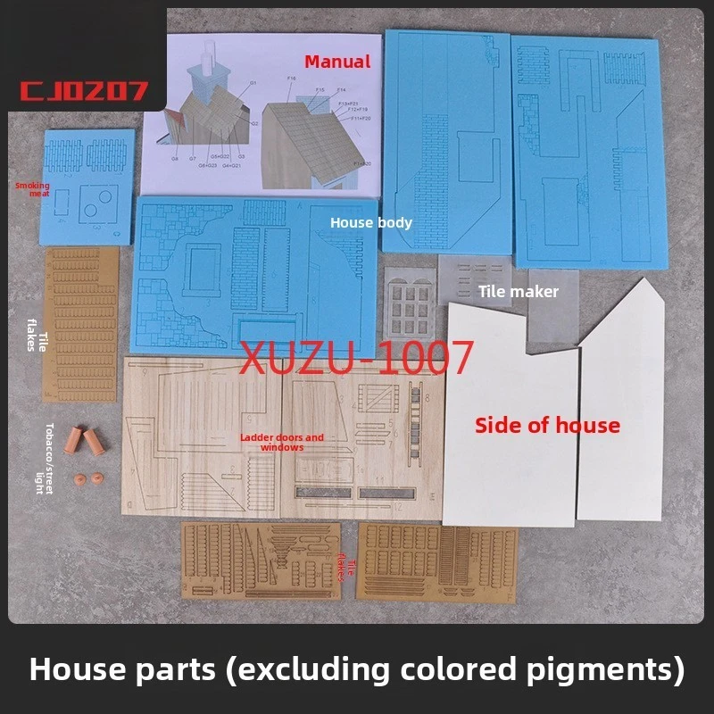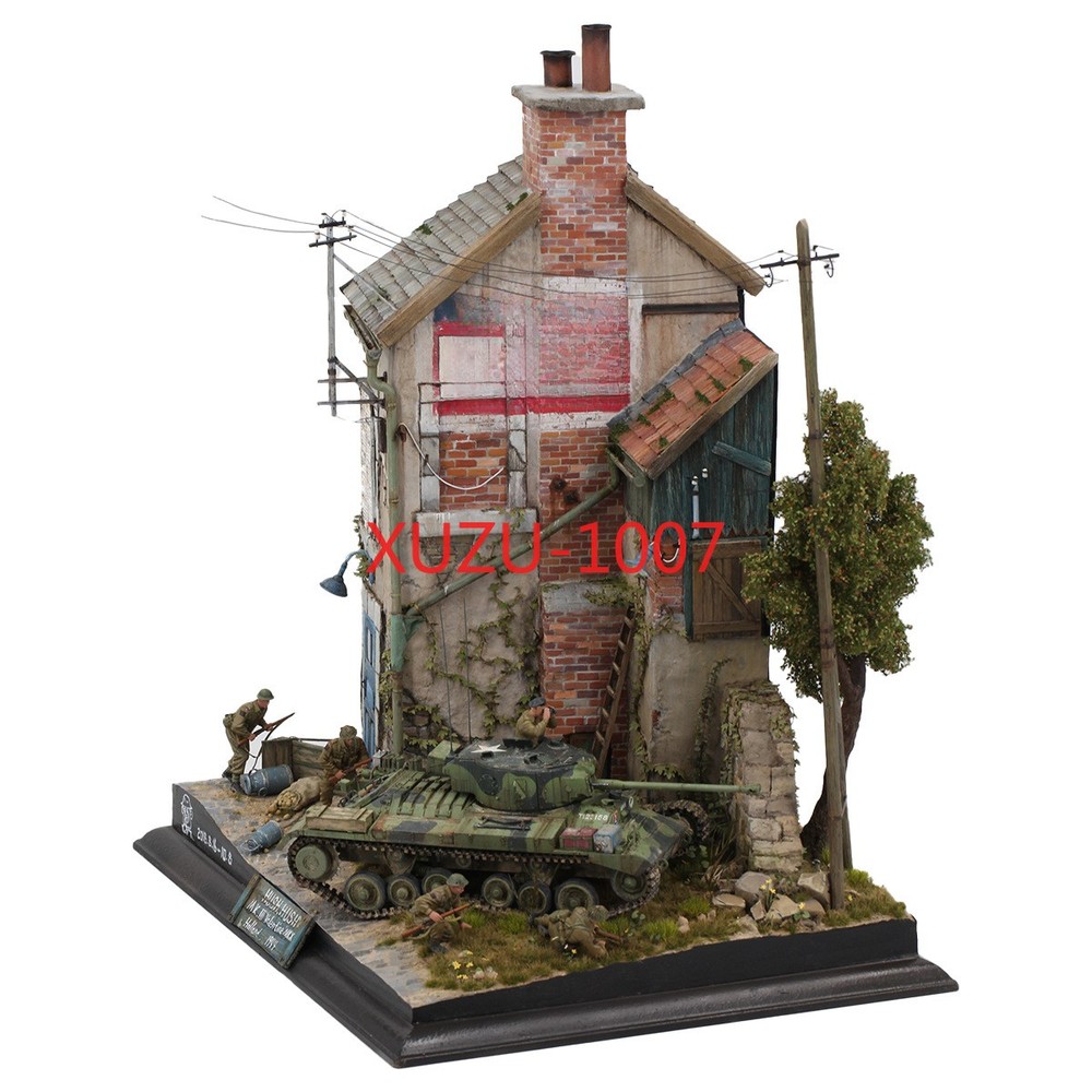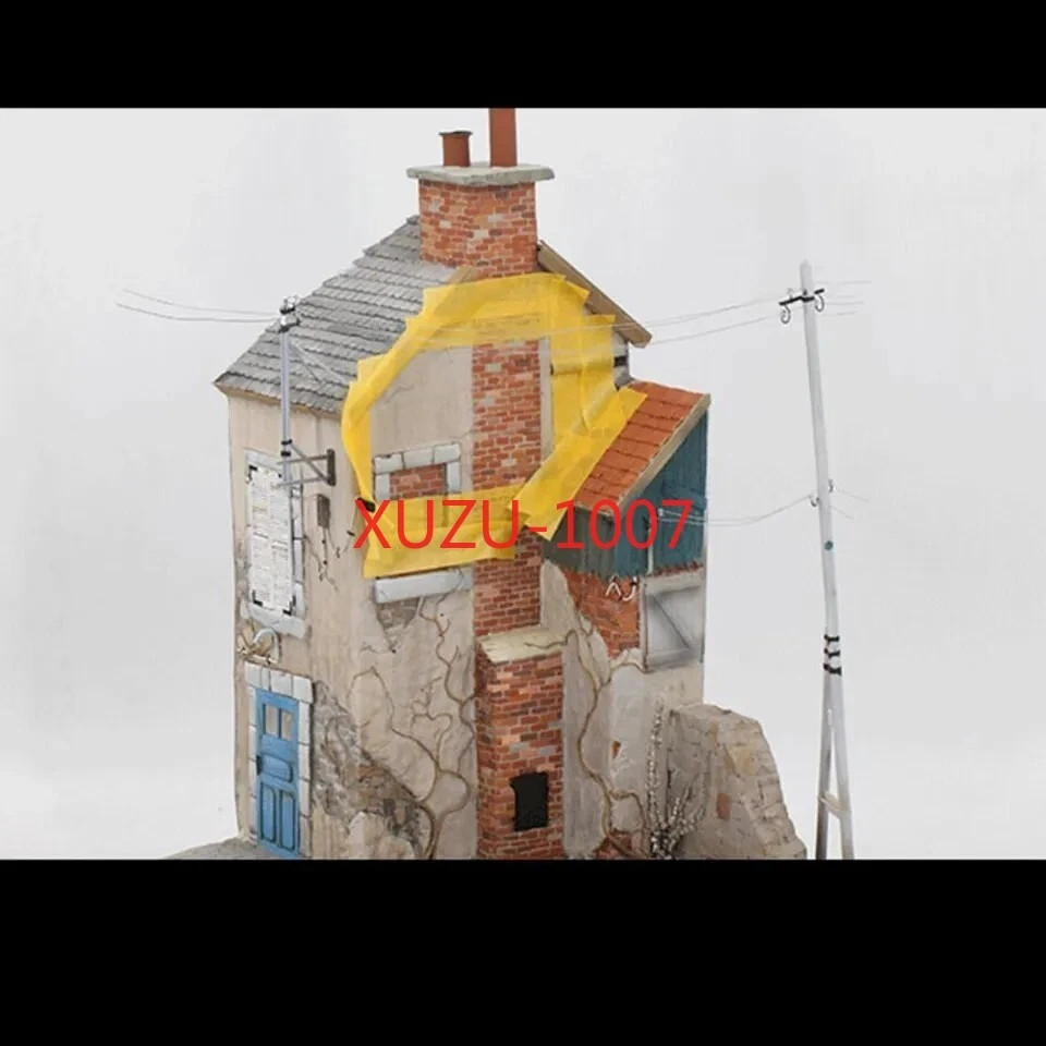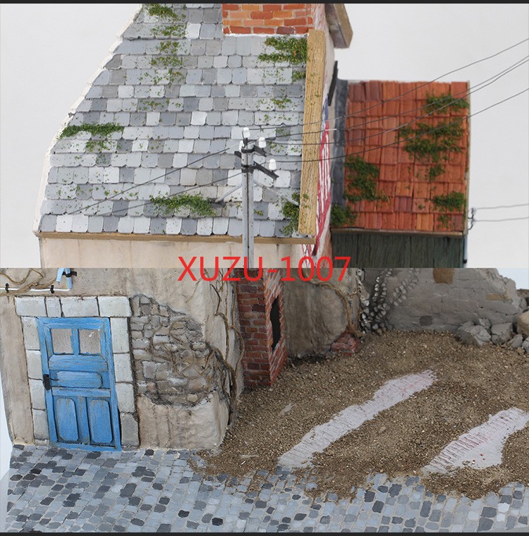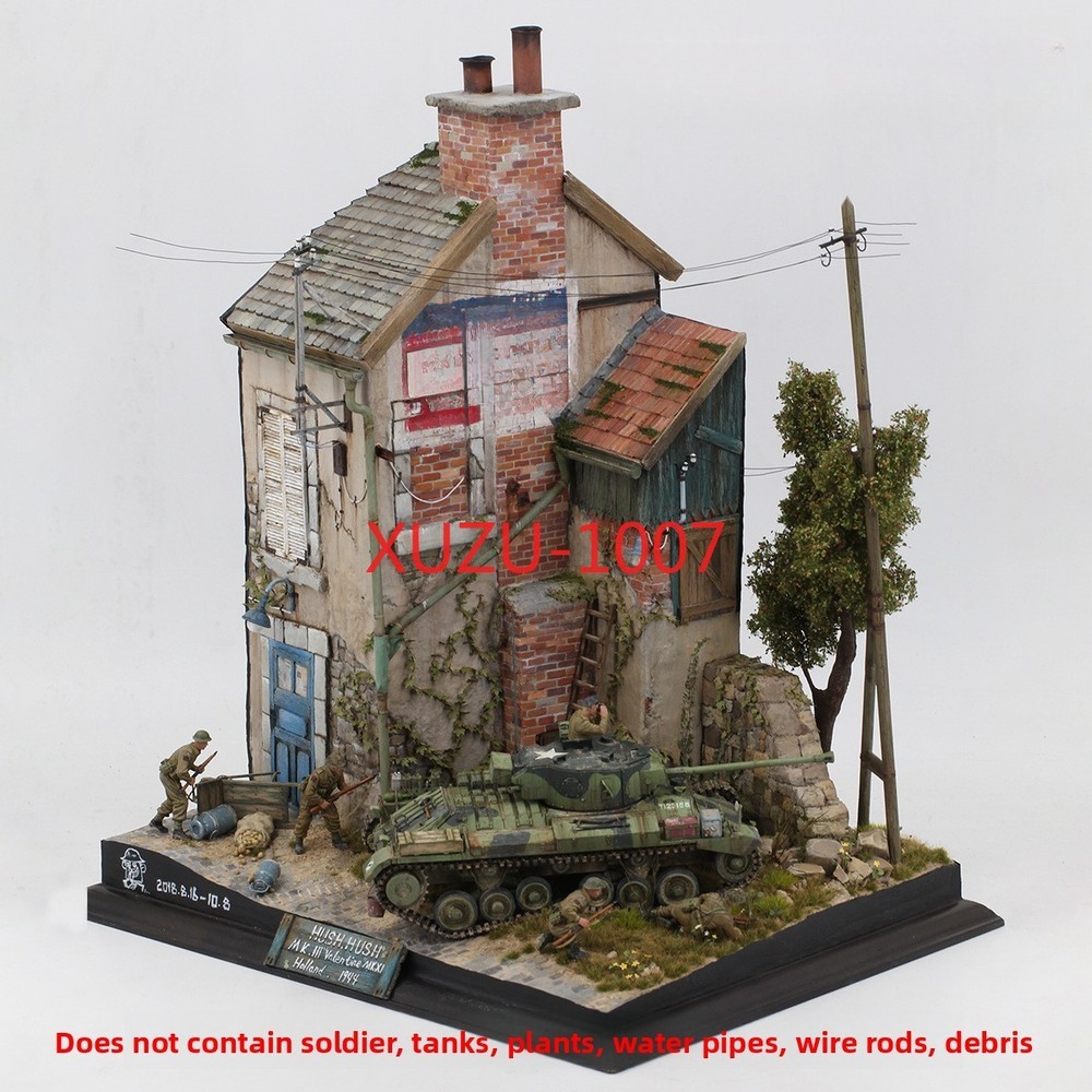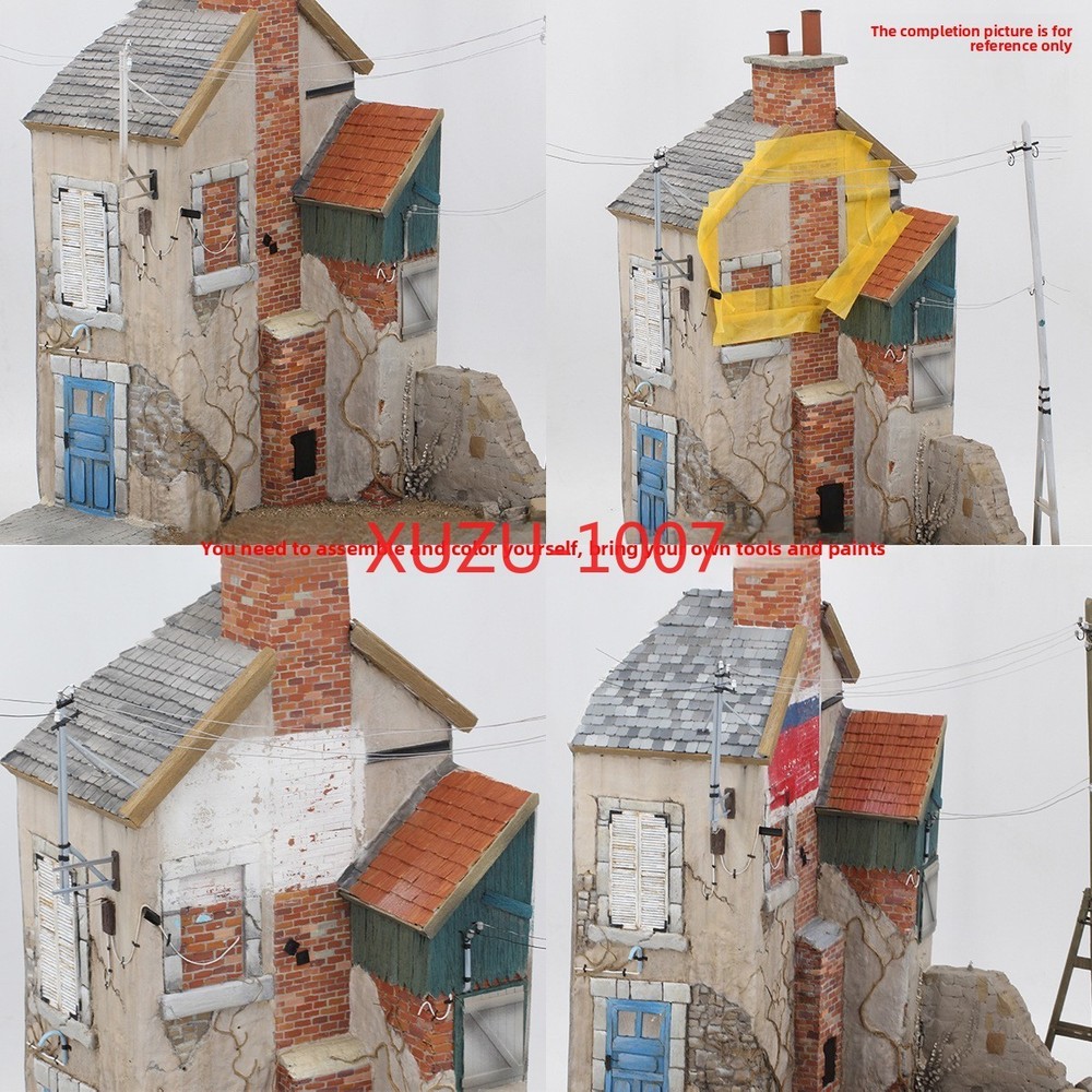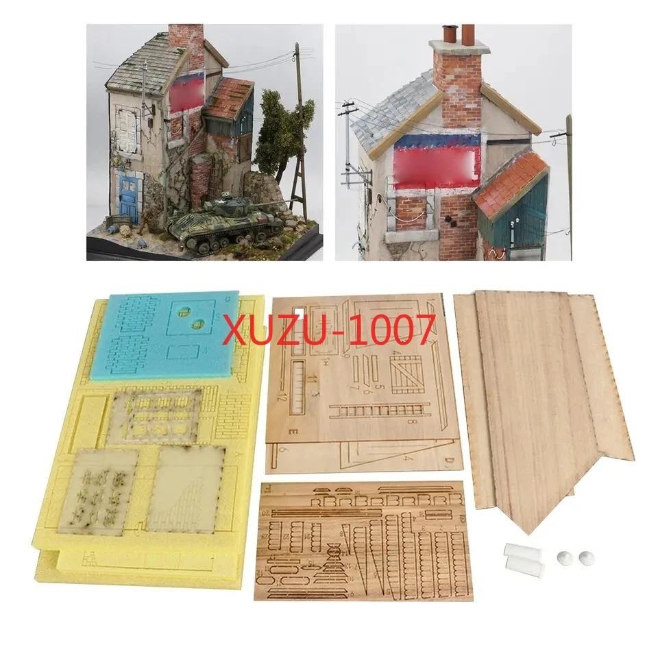 Does not include the bottom platform (black plank) no include light pole, water pipe and electricity wire Description: 1:35 scale wooden european house battlefield ruins scene building model unassembled and unpainted kit. It is not finished model, you have to make it all by yourself, build yourself a vintage European style house model. Great accessories for miniature sand table, war diorama, army base play set, exhibition or scenery layout. Can improve your imagination, collaboration skills and hands-on ability. Perfect for DIY hobby and fans. Specification: Material: Wood Scale: 1:35 Size Chart: package size: 24x23x6CM/9.45x9.06x2.36inch Package Includes: 1 Set Wood Models House Kits