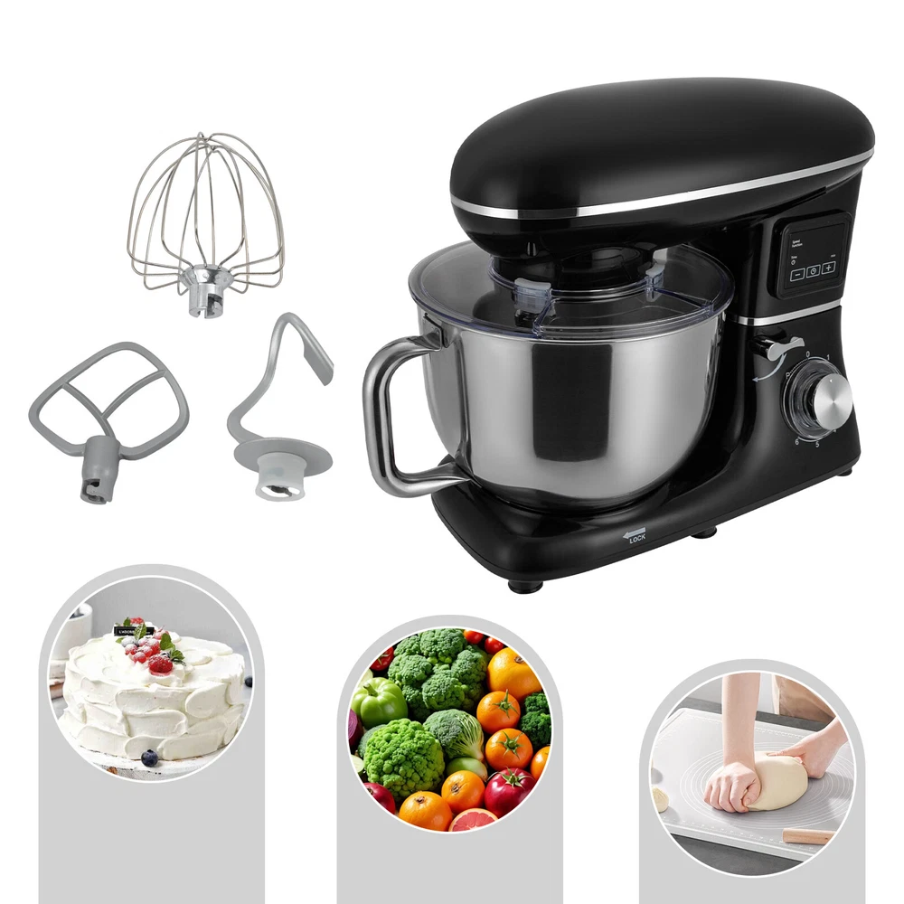 Electric Food Stand LCD Mixer 1350W 6 Speed 6.5 Quart Kitchen Beater Black ABS Description Look at our kitchen mixer, it is a helpful assistant for your kitchen. It is made of premium materials, safe to use and durable. This machine is compact and lightweight, so you can easily store it in the cabinet. As a daily mixer, it is easy to operate and clean up, allowing you to conveniently deal with different kinds of foods. Key Features Build to Last : The product is made of high-quality ABS, making it durable, and not easy to rust and corrosion, so it can remain beautiful and practical for a long time. Powerful and Efficient: It has a strong power (1350W) and a knob to adjust 6+1 mixing speeds, 1-3 speed for bread and pasta dough, 2-4 speed for butter, cookies, and salad, 5-6 speed for egg white, cream, cake, and sauces, and P for pulse function to make the texture of bread and butter more creamy. Thoughtful Design: The LCD screen can be set to time (±30s per click) and has a regular reminder function, allowing you to maximize your freedom without having to keep an eye on the mixing progress. High Safety: The machine's head-up power failure and overheating protection can ensure your safety when using as well as easy for you to replace the accessories, in addition, the cooling holes can dissipate the heat in time to ensure the stability of the product when using. Excellent Performance: The deepened bowl can thoroughly mix flour, eggs, and other ingredients inside. It can hold 6.5 qt of ingredients and is equipped with a whisk, beater, and dough hook to facilitate the mixing of different ingredients and meet the dietary needs of you and your family. Ready to Use: The assembled host, practical accessories, and detailed English manual make it very convenient and time-saving for you to use it directly after receiving it. Compact and Lightweight: With its compact size (15.31*9.37*13.23 inches) and lightweight ( 13.23 lbs ), you can use it conveniently or store it in your cabinet without taking up too much space, making it suitable for small kitchen, apartment, or limited storage space. Protective Package: We use foam to wrap this product in order to minimize damage to the product during transportation. Ideal Gift: Because of its powerful functions and practicality, you can give it to your friends as a Christmas, Thanksgiving, or housewarming gift. Details Non-slip Feet: Six non-slip feet on the base prevent sliding and ensure product stability. Clear Splash-proof Lid: It helps you with process monitoring and facilitates pouring water, milk, or other liquid ingredients(not included) through the hole in the splash guard when needed while preventing ingredients from running out of the bowl, making cleanup easier. Practical Spatula: It helps you scoop out the ingredients and also makes for a more even distribution of the ingredients before blending. Comfortable Handle: The handle on the bowl makes it easy to grip and pour out your mixed ingredients(not included). Application It can be used in kitchens, small restaurants, bakeries, etc. for pizza, waffles, milkshakes, bread, dough, whipped cream, marble cakes, mincemeat, and more! Specification Color: Black Style: Modern Material: ABS Mount Type: Free Standing Assembly Required: Yes Control Type: Knob Screen Type: LCD Model: SM-1505HL Power Source: Corded Electric Plug Type: US Standard Motor Type: Pure Copper Motor Volatge: AC 110V Power: 1350W Speed Gears: 6 +1(Pulse Function) Time: ±30s Per Click Noise: <75db Capacity: 6.2L/6.5Qt Product Size: 38.9*23.8*33.6cm/15.31*9.37*13.23 inch Mixing Bowl Size(D*H): 22.3*17.2cm/8.78*6.77 inch Package Size: 40.6*36.3*24.7cm/16*14.3*9.7 inch Gross Weight: 6.6kg/14.6 lb Net Weight: 6kg/13.23 lb Package Included 1* Kitchen Mixer 1* Douch Hook 1* Beater 1* Whisk 1* Spatula 1* English Manual Notes Please note that this product does not include any food ingredients. Before purchasing, please make sure that the capacity of this product is available for your needs. It is suitable for the new baker, 1-2 members, or small family in everyday use. If you are a pro-baker or need to handle large batches of mixing, please consider other larger-capacity mixers. Please read the English manual carefully before use and pay particular attention to the safety instructions contained therein. Please allow the slight color difference caused by the shooting light and 1-3 cm error due to manual measurement, and make sure you do not mind before ordering. Payment Delivery details Terms of sales About us Contact us Payment We accept ebay payment 。 Fees such as import duties, taxes are not included in the item price or shipping costs. These charges are the buyer's responsibility. Delivery details Shipping: 2-9 working days to: USA Terms of sales We maintain high standards of excellence and strive for hundred percent customer satisfaction. Feedback is very important to us. We hope that you contact us immediately before you give neutral or negative feedback, so that we can address your concerns. It is impossible to address issues if we do not know about them! About us Your satis faction is our ultimate goal. We work hard to earn your trust and future business. Our certified technicians have tested each item before shipping. The unit comes with 1 year limited warranty on all manufacturing defects. a) If you receive a defective item, you may return it or ask for a discount. Please contact us within 14 days after you receive the package. b) What you returned must be intact and in its original packaging as re? u. Customer is responsible for shipping costs of the returned item. c) We will cover the cost of shipping back t with the shipping rate indicated in the registration page. We will send you a new unit or refund the full payment you paid. Thank you. Contact us Business Hour Business Hour: Monday To Friday: 8:30 AM to 5:00 PM (Beijing China time) Due to time zones, our reply to your questions may not be immediately. But within above working