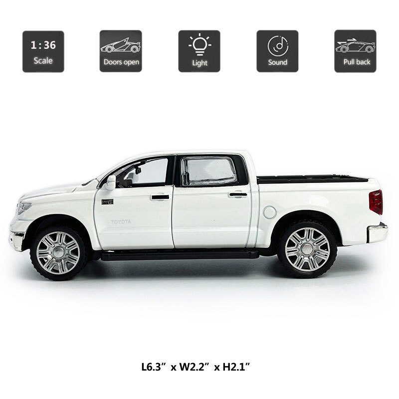 1/36 Tundra Pickup Truck Model Car Diecast Toy Vehicle Metal Pull Back White Item Type Diecast & Toy Vehicles Scale 1:36 Material Diecast and ABS Color White Dimension About L6.3" x W2.2" x H2.1" (L16.1 x W5.6 x H5.3 cm) Vehicle Type Pickup Truck Function *Pull back *Two doors and engine cover can be open *Press the car, it will make sound and light Package Packed in original color box, in excellent condition Power 3 x AG13/LR44 button cell, power is just for light and sound Tips *Great choice of gift for kids, especially for Birthday, Christmas and New Year Gift *Great item for collector, business gift, home decoration, office decoration Warning Don't put in mouth/Keep Away from Fire/Not for Children under 3 Years Notice Due to manual measurement, please allow a little error Package include 1 x 1:36 Scale Tundra Model Car (Batteries Not Included) Payment Delivery details Terms of sales Payment We accept paypal only. Delivery details We ship orders within 24 hours upon receipt of payment. Terms of sales We provide great products and service. If you have any problems with the order,please do contact us before leaving negative feedback and opening case on eBay.