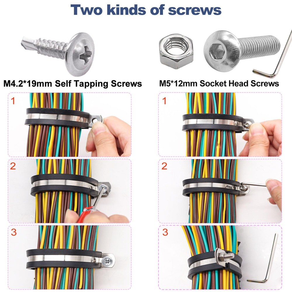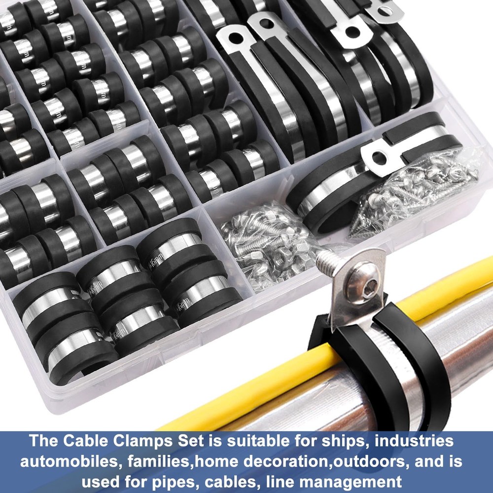 Cable Clamps Kit 10 Sizes 1/4"(6mm),5/16"(8mm),3/8"(10mm) 1/2"(13mm),5/8"(16mm),3/4"(19mm),1"(25mm),1-1/4"(32mm),1-1/2"(38mm),1-3/4"(45mm).The Cable Clamps Set is suitable for ships,industries,automobiles,home decoration,families,outdoors,and is used for pipes,cables,line management. 【With Two Kinds Of Screws】:Cable Clamps Assortment Kit with M5*12mm Socket Head Screws,M5 Nut/wrench and M4.2*19 Metal Self-Tapping Screws .Two types of screws can be more convenient for your use. 【Product Parameters】:Cable Clamps Kit 10 Sizes 1/4"(6mm),5/16"(8mm),3/8"(10mm) 1/2"(13mm),5/8"(16mm),3/4"(19mm),1"(25mm),1-1/4"(32mm),1-1/2"(38mm),1-3/4"(45mm). 【be suitable for】:The Wire Clamps Set is suitable for ships,industries,automobiles,home decoration,families,outdoors,and is used for pipes,cables,line management 【Product Material】:The pipe clamp is made of 304 stainless steel and rubber cushion,rust-proof,corrosion-resistant and wear-resistant.The rubber coating offers a more secure fitting, as well as cutting down noise vibration for pipes. 【Packaging Content】:12pcs 1/4"+10pcs 5/16" +10pcs 3/8" + 6pcs 1/2" + 6pcs 5/8" +4pcs 3/4"+2pcs 1" +2pcs 1-1/4" +2pcs 1-1/2"+2pcs 1-3/4"+30pcs M4.2*19mm Self Tapping Screws +25pcs M5*12mm Socket Head Screws+25PCS M5 Nut + wrench