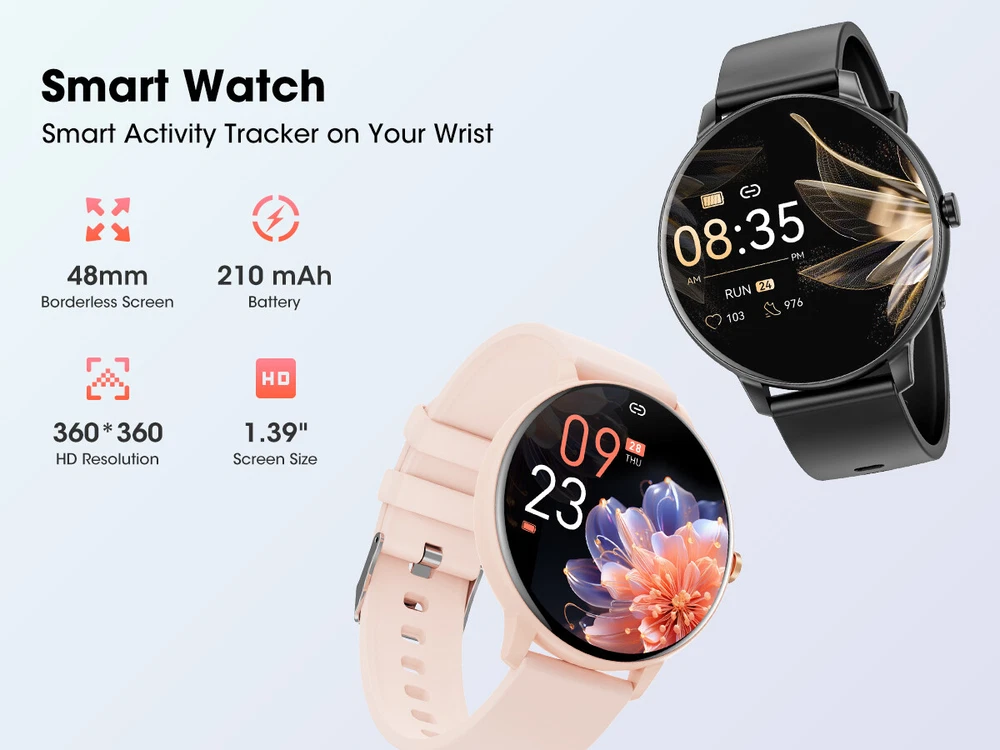 Karchilor 2024 Women'S Smartwatch Bluetooth Call 1.39 Touch Screen smart watches for men Health MonitoringIp67Waterproof Fitness Item Description: Smart Watch with Bluetooth Calling | 1.39” HD Display | Health & Fitness Tracker Experience next-level connectivity and wellness with this stylish and feature-rich smart watch, designed to fit seamlessly into your lifestyle. 🕹️ Key Features: Bluetooth Calling & Music: Make and receive calls directly from your wrist. Enjoy your favorite music hands-free. Voice Assistant Built-in: Control your phone or get quick answers with voice commands. Advanced Health Monitoring: Track your heart rate, blood oxygen, sleep quality, women’s health, and breathing patterns. Fitness Tracker: Monitor calories burned, distance walked, steps taken, and set fitness goals with real-time feedback. Smart Reminders: Get notifications for calls, messages, and apps right on your wrist. Daily Tools: Includes weather updates, stopwatch, timer, alarm, sedentary reminder, flashlight, and more. 📱 User-Friendly Interface: 3 Display Themes: Circle, List, Cellular layout Adjustable brightness, sound toggle, and screen-on gesture Remote camera control, phone finder, DND mode Multiple system settings: Restart, Reset, Language & Unit selection (Metric/Imperial), Time format (12H/24H), and more. 💧 Durability & Compatibility: Waterproof Level: IP67 – splashproof for everyday use Battery: 210mAh rechargeable, long-lasting power Compatibility: Android 8.0+ / iOS 9.0+ 📦 Package Includes: 1 x Smart Watch 1 x Magnetic Charger 1 x Strap 1 x User Manual 🌐 Multilingual Support: UI Languages: English (default), Chinese (Simplified/Traditional), Japanese, Russian, German, French, Arabic, Spanish, Portuguese, Turkish, and more. App Languages: Over 30 supported, including English, French, Hindi, Korean, Ukrainian, and more. Payment Free Worldwide Shipping Shipping safe payment . Return 30 Day's returns