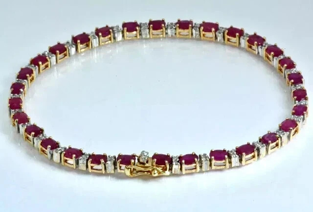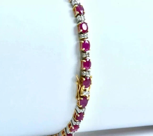 13Ct Oval Ruby & Diamond Tennis Bracelet 14k Yellow Gold Plated Lab Created 7”