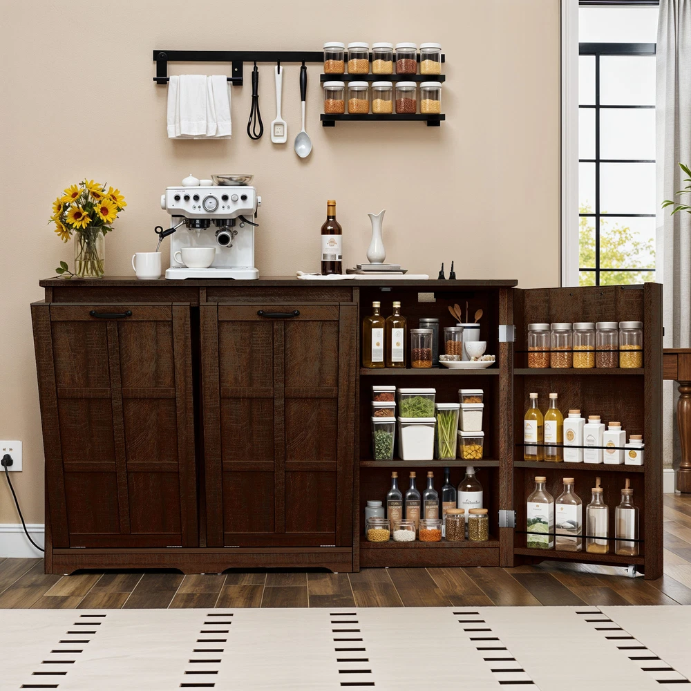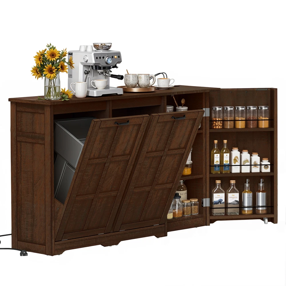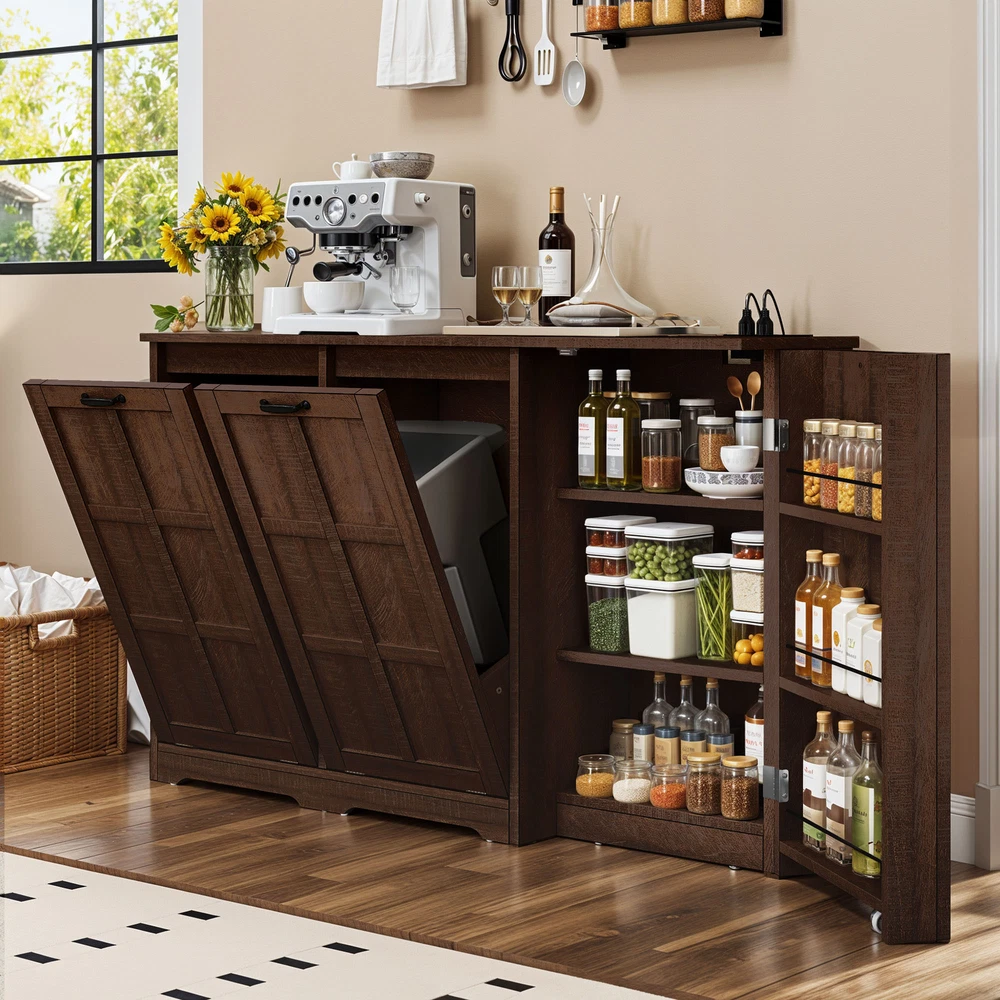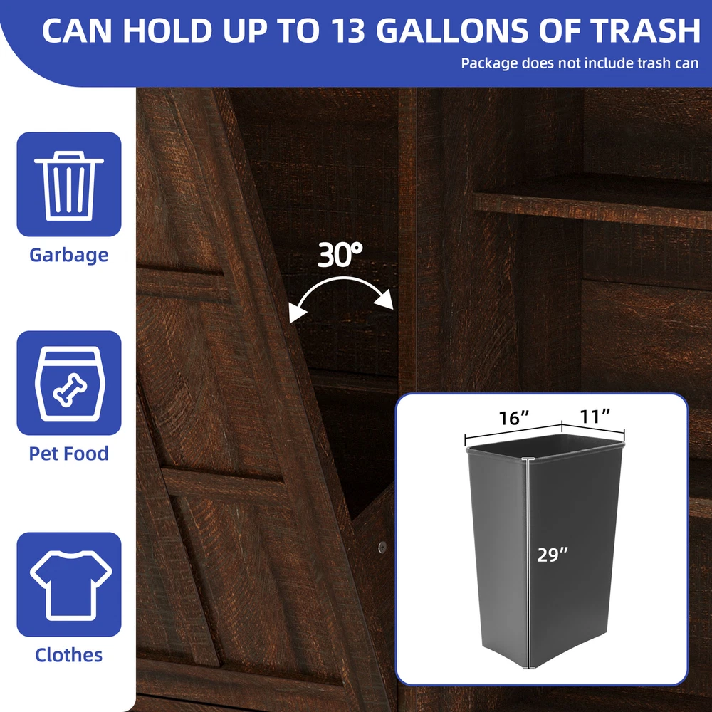 Double 13-Gal Tilt-Out Trash/Recycling Cabinet, Kitchen Island with Shelves, Doors, and Charging Outlet for Living Room, Dining Room, Kitchen, Brown Product Description NOTE: Professional Installation would be Highly Recommended. Description: 1. Color: Brown Oak 2. Material: Manufacture Wood + MDF 3. Handle Material: Steel / Iron 4. Fits The Size of Trash Bin : Dual Trash Bin,13 Gallon 5. Number of Doors : 3 6. Number of UL Outlets : 2 7. Number of USB Port : 2 8. Room Type: Kitchen / Dining Room / Entryway Features: Expansive Design; Shelves Can Be Adjusted. The Tilt Out Trash Can Cabinet features a large countertop and versatile storage, including adjustable shelves for dishes and snacks, and metal organizers for spices. It conceals double trash cans and offers additional shelving for items like pet food and seasonings. Ideal for kitchens, dining rooms, or laundry areas, this cabinet also includes a charging station and extra storage racks for optimal organization. Tilt-Out Trash Bin Storage The Tilt-Out Trash Can Storage cabinet features a design that conceals two compartments, each capable of holding a 13-gallon trash can (not included). Its tilt-out mechanism makes disposing of kitchen waste easy and helps control odors and prevent pets from accessing the garbage. This practical solution keeps your kitchen clean and organized. Constructed with Premium Materials. The buffet cabinet is made from high-quality MDF and particle board, ensuring both durability and style with its cream white and brown finish. It is built to handle daily use with features like smooth rolling wheels for easy movement and anti-tipping designs for added safety and stability. These thoughtful details ensure a reliable and secure addition to your kitchen or living room. Effortless Charging The kitchen cabinet is designed for convenience, featuring a spacious wooden countertop for meal preparation and easy cleaning. It includes a built-in power station with 2 AC outlets and 2 USB ports, allowing you to effortlessly charge devices and power appliances like mixers and blenders. This cabinet not only hides trash with its double tilt-out system but also serves as a charging hub, ensuring your devices stay powered without the need to search for outlets. Enjoy a fully equipped kitchen that keeps you connected and efficient while cooking. Easy Assembly and Customer Service The trash can cabinet is designed for quick and easy assembly, with clear, numbered instructions and labeled parts, ensuring a straightforward setup process. Our commitment to excellent customer service means any questions or concerns you have will be promptly addressed. Purchase today to enjoy a tidy and organized space that your family will appreciate. Dimensions: 1. Product Dimensions: 58.3"L x 14.17"W x 37.4"H 2. Tilt-out Door Dimensions: 18.5"L x 33"H 3. Pull-0ut Door Dimensions: 18.5"L x 3.34"D x 36.4:H 4. Shelving Cabinet Dimensions: 10.6"H x 9.8"D 5. Trash-bin Dimensions: 16.5"L x 11"W 6. Capacity: 13 Gallon Trash (Trash Can Not Included) 7. Item Weight: 108.02 lbs 8. Power Cord Length : 6.5 Feet 9. UL Outlets Capacity : 120V / 2A 10. USB Port Capacity : 5V / 2A Package Included: 1 X Cabinet 1 X Assembly Instruction NOT INCLUDED IN PACKAGE: Trash Can *Additional Notes: - This pantry is designed for indoor use only. - Avoid placing heavy objects on top of the cabinet. - Clean the cabinet with a soft, damp cloth. - Do not use harsh chemicals or abrasive cleaners Shipping 1. Normally the item will be dipatched within 1 business day if payment is cleared before 12pm PST. 2. Please verify the correct shipping address in your PayPal account before making the payment. We only dispatch the item to the address that is sent to us at the time of checkout. 3. We don't ship to Hawaii, Alaska, Puerto Rico, APO/FPO/PO Boxes. 4. We don't provide local pick-up service. 5. Normally we will use USPS, UPS, FedEx & LTL to dispatch items. Payment 1. We accept PayPal and credit card. 2. We will ship to the confirmed Paypal shipping address that is provided with the payment only. Return 1. 30 days Money Back Guarantee. 2. Please contact our customer service to receive a RMA form first if want to return the item. 3. All returned items MUST in new condition with the original package. Contact If has any problem, please contact us by sending an ebay message. Our customer service will resolve the problem as soon as possible. On Nov 12, 2024 at 19:54:59 PST, seller added the following information:
