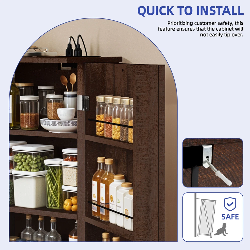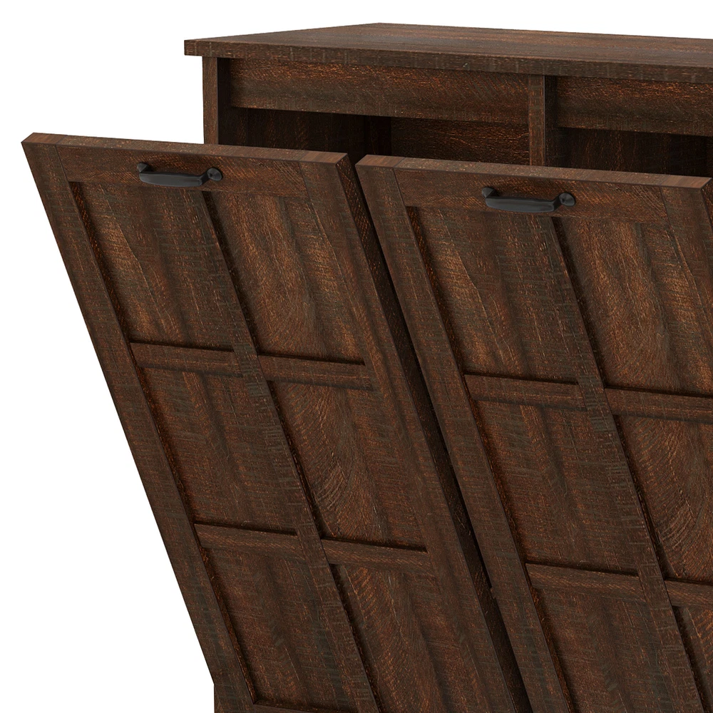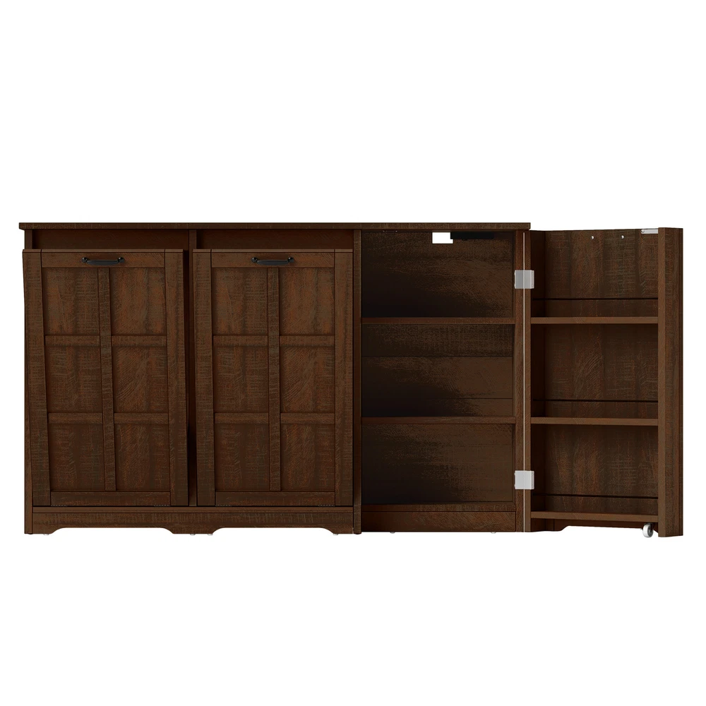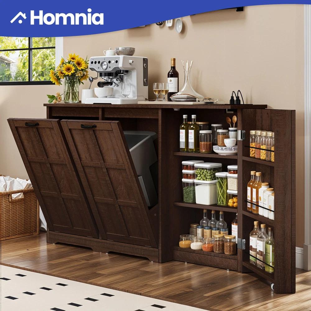 Double 13-Gal Tilt-Out Trash/Recycling Cabinet, Kitchen Island with Shelves, Doors, and Charging Outlet for Living Room, Dining Room, Kitchen, Brown Product Description NOTE: Professional Installation would be Highly Recommended. Description: 1. Color: Brown Oak 2. Material: Manufacture Wood + MDF 3. Handle Material: Steel / Iron 4. Fits The Size of Trash Bin : Dual Trash Bin,13 Gallon 5. Number of Doors : 3 6. Number of UL Outlets : 2 7. Number of USB Port : 2 8. Room Type: Kitchen / Dining Room / Entryway Features: Expansive Design; Shelves Can Be Adjusted. The Tilt Out Trash Can Cabinet features a large countertop and versatile storage, including adjustable shelves for dishes and snacks, and metal organizers for spices. It conceals double trash cans and offers additional shelving for items like pet food and seasonings. Ideal for kitchens, dining rooms, or laundry areas, this cabinet also includes a charging station and extra storage racks for optimal organization. Tilt-Out Trash Bin Storage The Tilt-Out Trash Can Storage cabinet features a design that conceals two compartments, each capable of holding a 13-gallon trash can (not included). Its tilt-out mechanism makes disposing of kitchen waste easy and helps control odors and prevent pets from accessing the garbage. This practical solution keeps your kitchen clean and organized. Constructed with Premium Materials. The buffet cabinet is made from high-quality MDF and particle board, ensuring both durability and style with its cream white and brown finish. It is built to handle daily use with features like smooth rolling wheels for easy movement and anti-tipping designs for added safety and stability. These thoughtful details ensure a reliable and secure addition to your kitchen or living room. Effortless Charging The kitchen cabinet is designed for convenience, featuring a spacious wooden countertop for meal preparation and easy cleaning. It includes a built-in power station with 2 AC outlets and 2 USB ports, allowing you to effortlessly charge devices and power appliances like mixers and blenders. This cabinet not only hides trash with its double tilt-out system but also serves as a charging hub, ensuring your devices stay powered without the need to search for outlets. Enjoy a fully equipped kitchen that keeps you connected and efficient while cooking. Easy Assembly and Customer Service The trash can cabinet is designed for quick and easy assembly, with clear, numbered instructions and labeled parts, ensuring a straightforward setup process. Our commitment to excellent customer service means any questions or concerns you have will be promptly addressed. Purchase today to enjoy a tidy and organized space that your family will appreciate. Dimensions: 1. Product Dimensions: 58.3"L x 14.17"W x 37.4"H 2. Tilt-out Door Dimensions: 18.5"L x 33"H 3. Pull-0ut Door Dimensions: 18.5"L x 3.34"D x 36.4:H 4. Shelving Cabinet Dimensions: 10.6"H x 9.8"D 5. Trash-bin Dimensions: 16.5"L x 11"W 6. Capacity: 13 Gallon Trash (Trash Can Not Included) 7. Item Weight: 108.02 lbs 8. Power Cord Length : 6.5 Feet 9. UL Outlets Capacity : 120V / 2A 10. USB Port Capacity : 5V / 2A Package Included: 1 X Cabinet 1 X Assembly Instruction NOT INCLUDED IN PACKAGE: Trash Can *Additional Notes: - This pantry is designed for indoor use only. - Avoid placing heavy objects on top of the cabinet. - Clean the cabinet with a soft, damp cloth. - Do not use harsh chemicals or abrasive cleaners Shipping 1. Normally the item will be dipatched within 1 business day if payment is cleared before 12pm PST. 2. Please verify the correct shipping address in your PayPal account before making the payment. We only dispatch the item to the address that is sent to us at the time of checkout. 3. We don't ship to Hawaii, Alaska, Puerto Rico, APO/FPO/PO Boxes. 4. We don't provide local pick-up service. 5. Normally we will use USPS, UPS, FedEx & LTL to dispatch items. Payment 1. We accept PayPal and credit card. 2. We will ship to the confirmed Paypal shipping address that is provided with the payment only. Return 1. 30 days Money Back Guarantee. 2. Please contact our customer service to receive a RMA form first if want to return the item. 3. All returned items MUST in new condition with the original package. Contact If has any problem, please contact us by sending an ebay message. Our customer service will resolve the problem as soon as possible. On Nov 12, 2024 at 19:54:59 PST, seller added the following information: