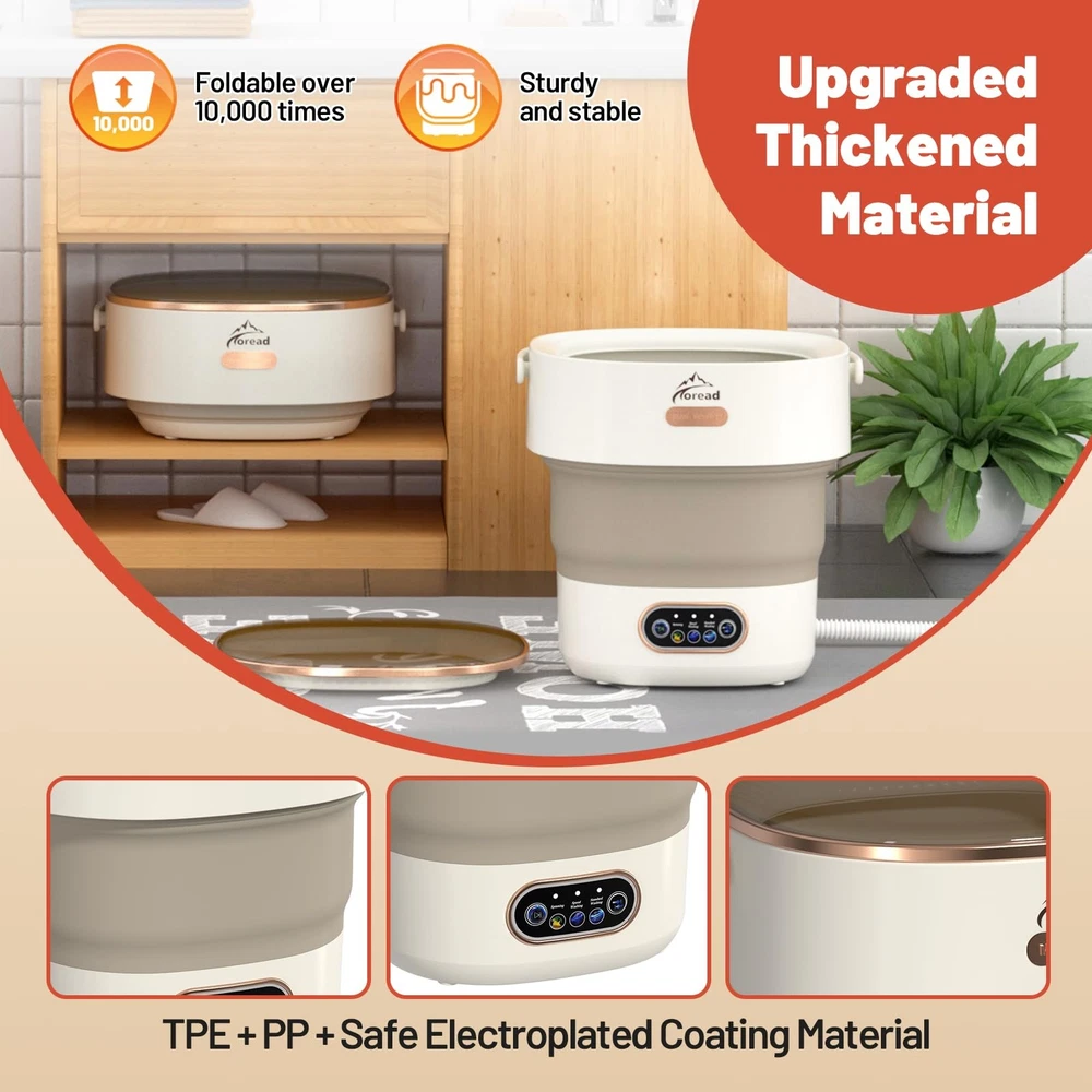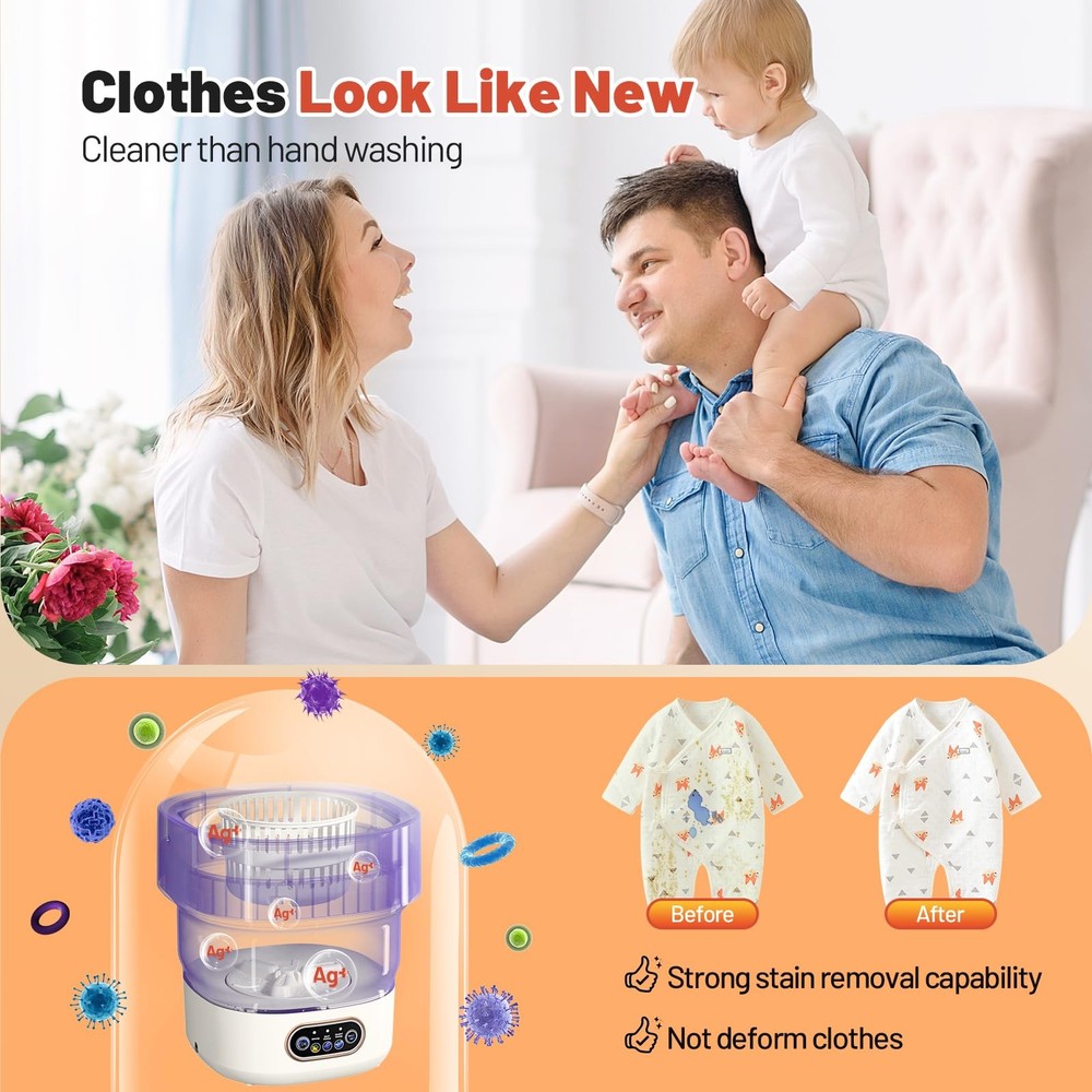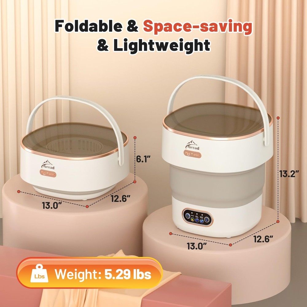 Portable Washing Machine, With a one-button start and an easy-drain hose, it’s designed for convenience. This mini washer features a 13L capacity and 3 wash settings: Quick Wash (5 min), Slow Wash (10 min), and Spin Dry (3 min), Made from durable TPE and PP materials, With compact dimensions of 12.95" x 12.60" x 13.19" and a lightweight design at 5.29 lbs, it’s perfect for small bathroom and travel carry. Ideal for washing underwear, socks, baby clothes, shoes, children's toys, and women's makeup items, this portable washing machine eliminates the need for hand washing, making life easier and more convenient! 【Designed for Cleaning Small Items】 This mini portable washing machine is perfect for energy-efficient and cost-saving laundry. Ideal for washing underwear, socks, baby clothes, shoes, children’s toys, makeup tools, pet supplies, and more, it offers a convenient and hygienic solution for your small laundry needs. Say goodbye to hand-washing socks and enjoy cleaner, healthier laundry with ease. 【13L Large Capacity】 Compact yet spacious, the washer measures 12.95" x 12.60" x 13.19" when opened and holds up to 8 underwear, 12 socks, 6 towels, 6 baby clothes, or 3 T-shirts per load. Weighing just 5.29 lbs, it’s made from durable TPE and PP materials with an electroplated coating. The foldable design resists wear and can withstand up to 10,000 folds without deforming. 【3 Washing Modes】 Choose from Speed Wash (5 min), Standard Wash (10 min), or Spin Dry (3 min) with a single button for all-in-one operation. For heavily soiled items, repeat the wash cycle as needed. Tested to effectively remove stubborn stains, this washer adapts to your laundry demands with ease. 【Powerful Cleaning Performance】 Equipped with a high-quality generator and dual-directional turbo vortex technology, the machine ensures deep cleaning without pulling or damaging your garments. For best results, pre-soak clothes for 20 minutes before washing. 【Flexible Drainage Hose】 The extendable drainage hose at the bottom eliminates the hassle of manual wastewater disposal. Perfect for use in the bathroom while you shower, this washer is also travel-friendly. Fold it up and pack it in your suitcase to avoid public laundromats on trips, ensuring clean and private laundry care anywhere you go.