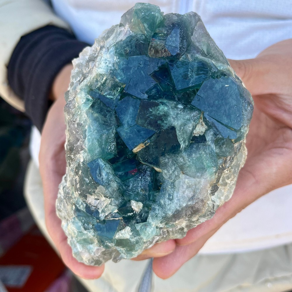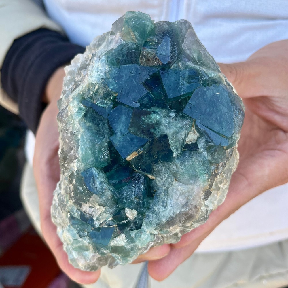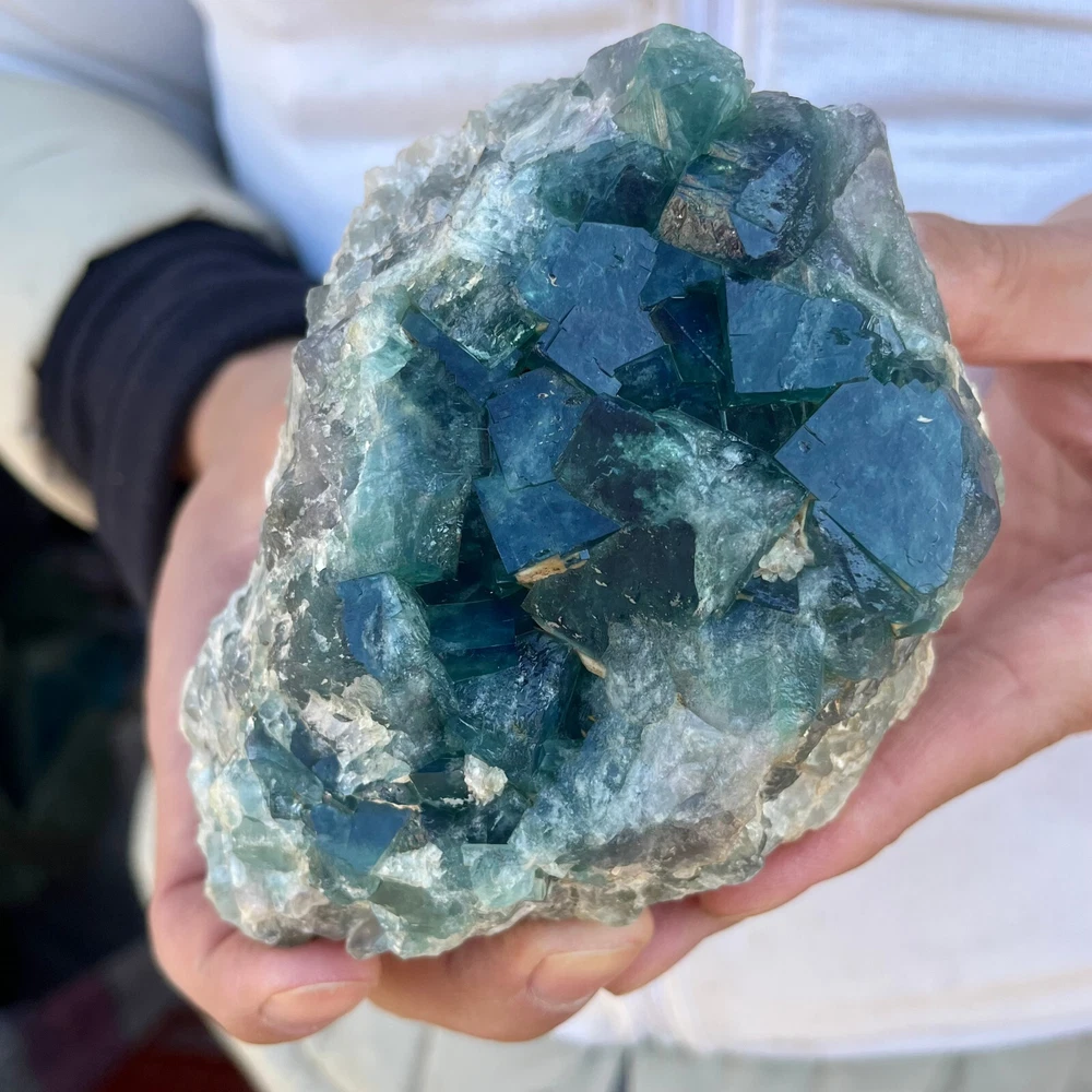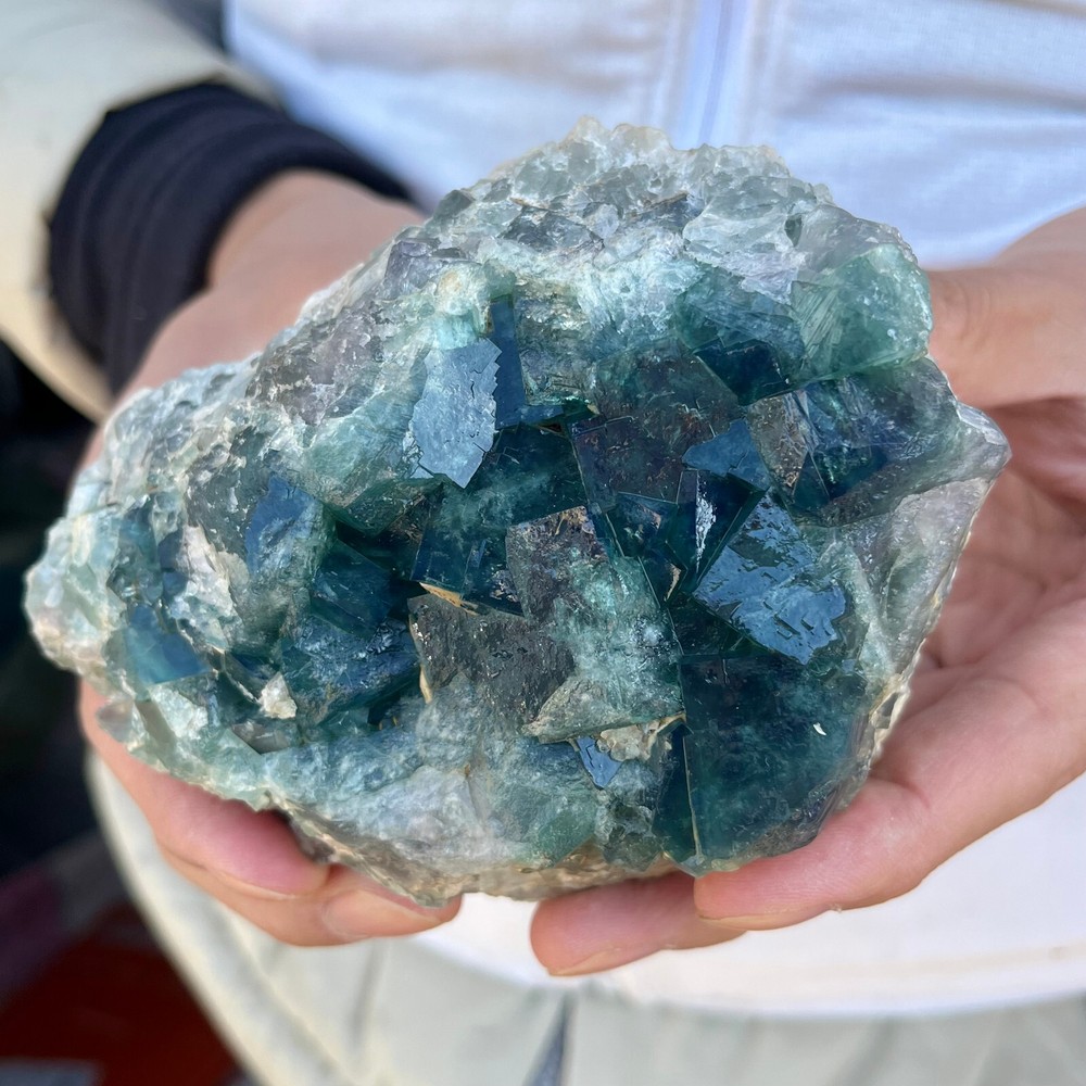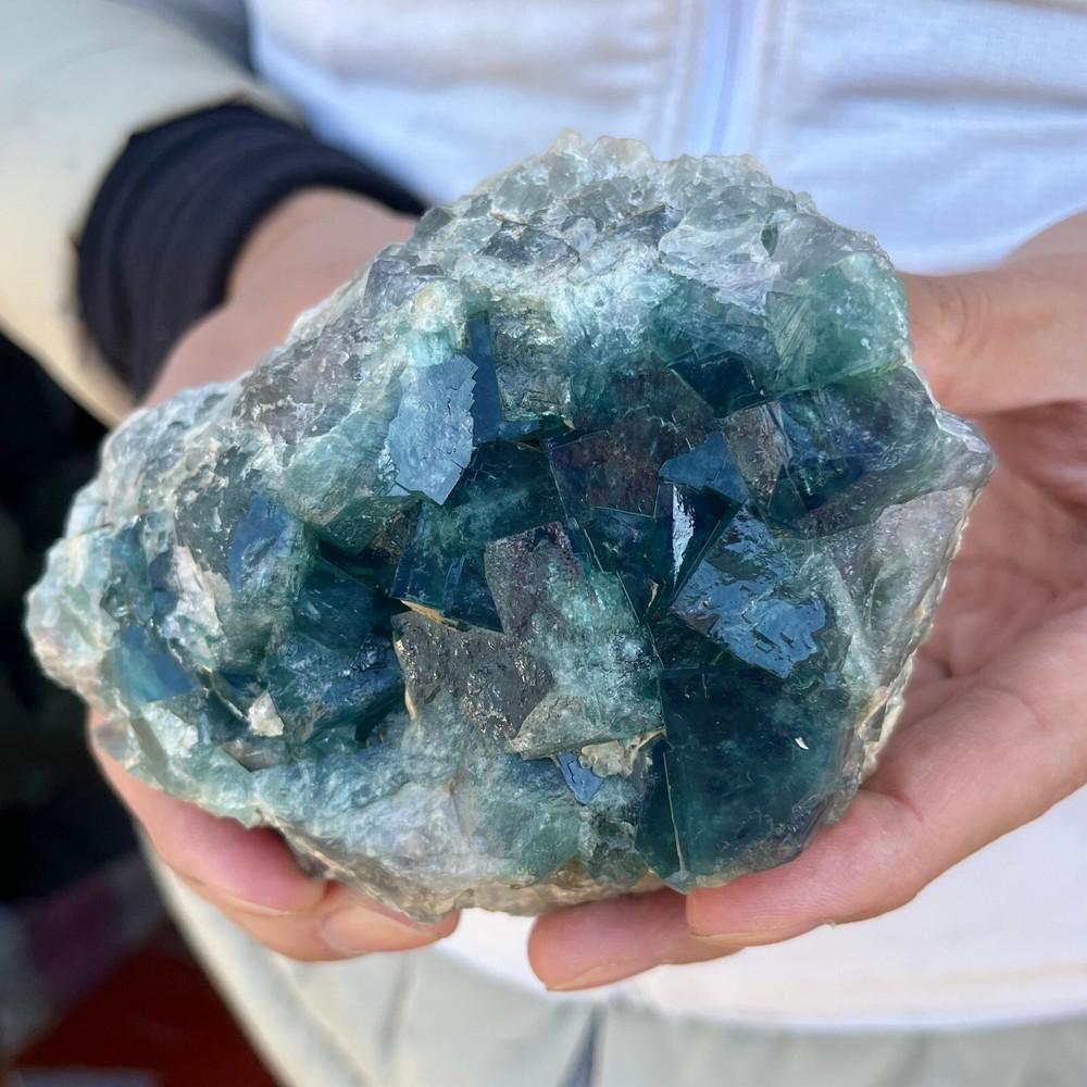 Amazing blue green hues in the fluorite. Item got here super quickly and it was wrapped completely in bubble wrap and tape. It looks exactly like the picture. It’s a solid chonk of a rock with interesting white flecks of crystal on the bottom. A+ transaction!!!