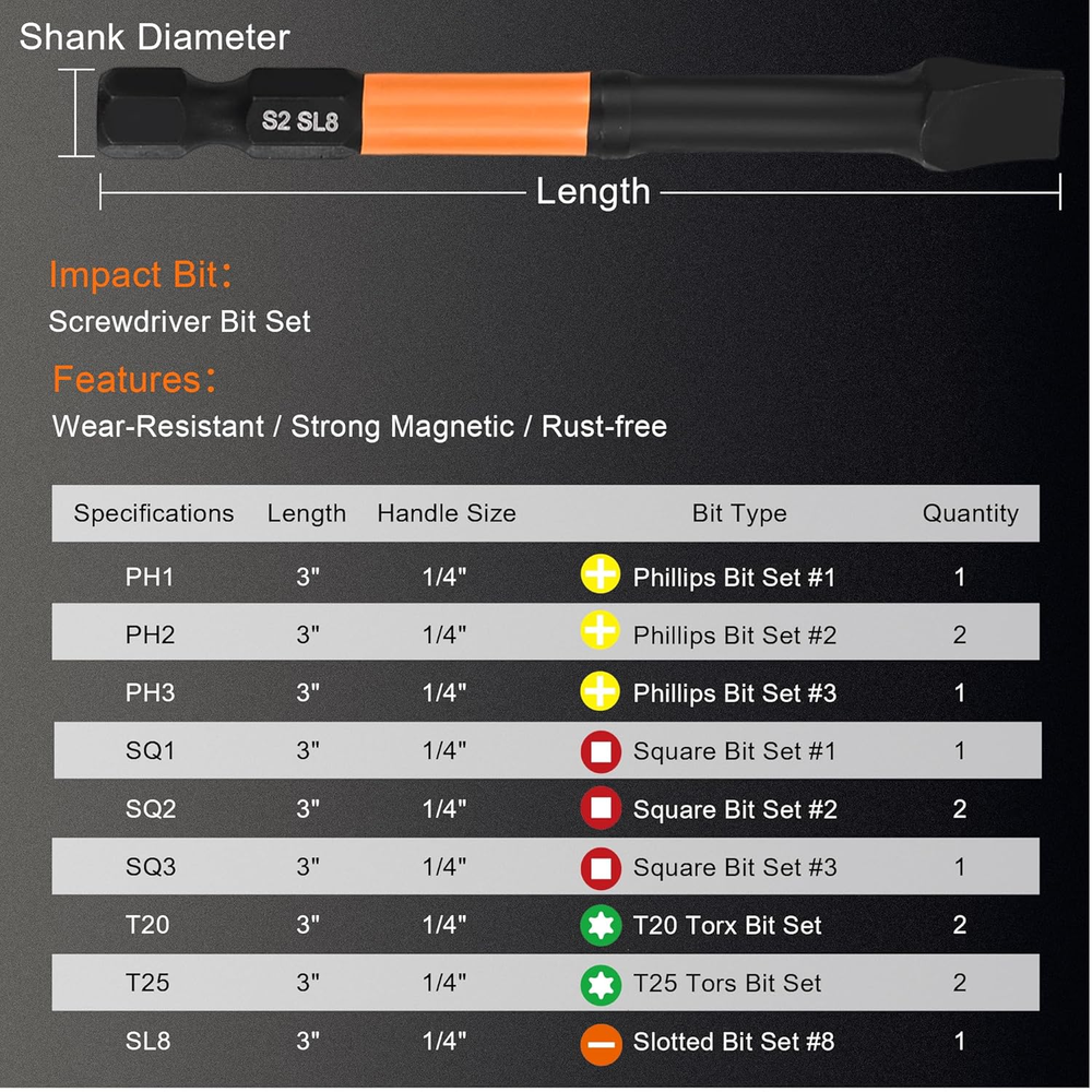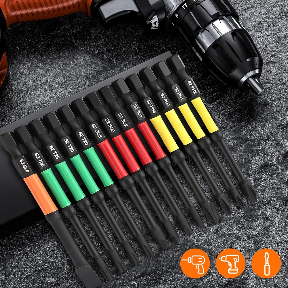 Business is our speciality NEW Magnetic Screwdriver Drill Bit Set, 13Pcs Impact Driver Bit Set Including Phillips Screwdriver Bit Set S2 Alloy Steel Security Torx Screwdriver Set Square Drive Drill Bit Set for Electric Hand Tool FEATURES 【PROFESSIONAL QUALITY AUTHENTIC TOOLS】: Strong magnetic durability screwdriver drill bit set made of high-quality premium solid S2 alloy steel to increase bit strength and reduce fracture, With a hardness of up to 56-60HRC, It is impact-resistant and wear-resistant, magnetic impact driver bit set adopts upgraded protective coating, Black phosphatecoating resists corrosion, Adapts to humid or complex environments, Maintains good performance of the screwdriver bit set and increases bit life 【CNC Machined】: Our hex screwdriver drill bit set are CNC machined precision, Ensuring more precise and durable use. The torsion zone can eflectvely spread the strength concentration. It will alleviate the excessive loading and the impact strength on the bit tip, Perfect for those who demand high-quality tools for their projects 【Strong Magnetic Hold】: Strengthened magnetic impact driver bit set helps you easy pick up screwse, Preventing Frustrating Drops, The magnetism doesn’t decay after multiple uses 【Multiple Specifications Available】: 13 Pcs Strong Magnetic screwdriver drill bit sets Provide a variety of bit types (PH1,PH2*2,PH3,SQ1,SQ2*2,SQ3,T20*2,T25*2,SL8): Phillips Screwdriver #1 (1 Pcs), Phillips Impact Driver Bits #2 (2 Pcs), Phillips Impact Bits #3 (1 Pcs), Slotted Screwdriver Bit Set (1 Pcs), T20 Torx Screwdriver Set (2 Pcs), T25 Torx Bits For Impact Driver (2 Pcs), Square Drive Bits #1 (1 Pcs), Square Bit Sets #2 (2 Pcs), Square Bit Set#2 (2 Pcs) 【Widely Compatible & Trusted Worldwide】: This 1/4-Inch Screwdriver Drill Bit Set, Compatible With Manual Screwdrivers, Electric Screwdrivers, Electric Drills And Other Tools, Suitable For Mechanical Maintenance, Home Assembly, furniturerepairs, automobiles, motorcycles, bicycles, woodworking and other screw driving applications Electronic Equipment,If you are not fully satisfied for any reason, Please feel free to contact us via Amazon for 100% refund or replacement. KENDO-2M Users Worldwide Trust Our International Tool Solutions Product Description KENDO 13Pcs Screwdriver Bit Set Add to Cart Add to Cart Add to Cart Customer Reviews 4.6 out of 5 stars 18 4.5 out of 5 stars 106 4.5 out of 5 stars 106 4.0 out of 5 stars 236 4.0 out of 5 stars 44 Price $10.91 $ 10 . 91 $8.49 $ 8 . 49 $22.99 $ 22 . 99 $9.99 $ 9 . 99 $9.99 $ 9 . 99 Number of Pieces 13 22 47 6 6 Material S2 Alloy Steel S2 Alloy Steel Chrome Vanadium Steel High Speed Steel High Speed Steel Drive System Phillips+Slotte+Torx+Square Phillips+Slotte+Torx Hex Torx Torx Compatible Fastener 1/4" 1/4" 1/4" drills, screws and bolts drills, screws and bolts Finish Type Steel Steel Steel Steel Steel Application Home Assembly, Woodworking Motorcycles, Woodworking Home Assembly Furniturerepairs, Automobiles Furniturerepairs, Automobiles Style 13pc 75mm(3") Country of Origin China Package Dimensions 4.69 x 2.99 x 0.51 inches; 5.64 ounces 2.99 inches x 4.69 inches x 0.51 inches. Weight: 5.64 oz Ask us anyhting Free shipping PAYMENT We accept all payments via Ebay using Credit Cards , PAYPAL , Apple Pay and many others SHIPPING We are always working hard to ensure your package arrives as soon as possible. Please understand that some factors like weather, high postal traffic, and the performance of shipping companies are outside of our control.