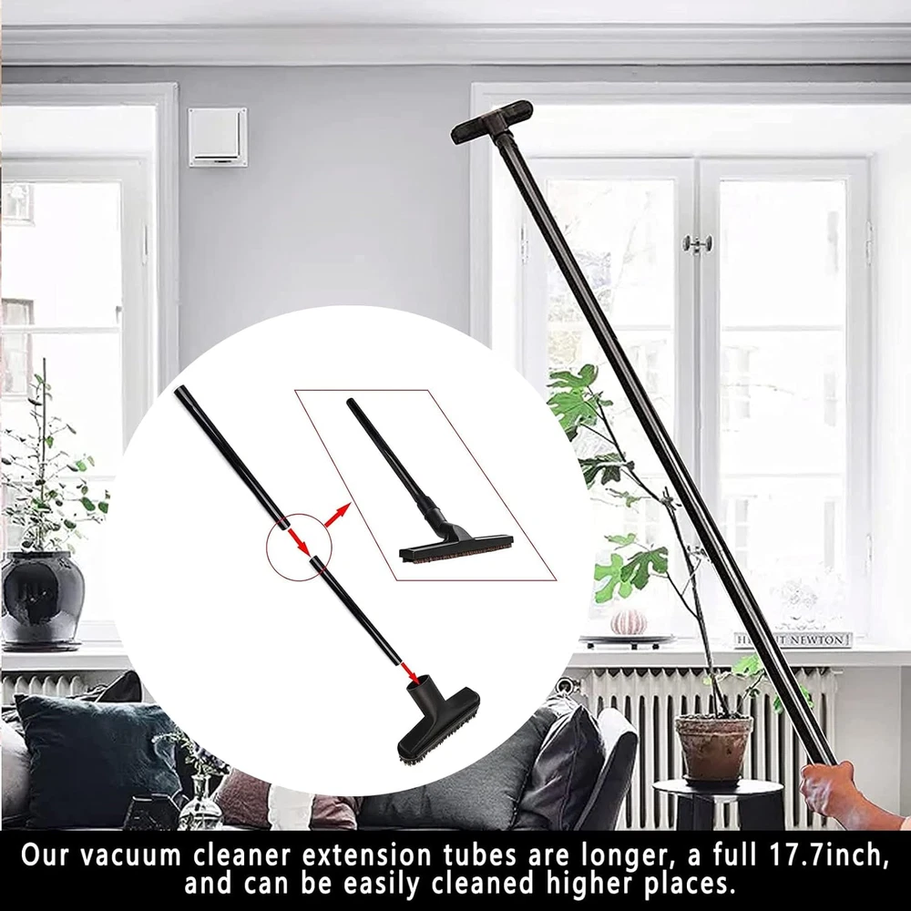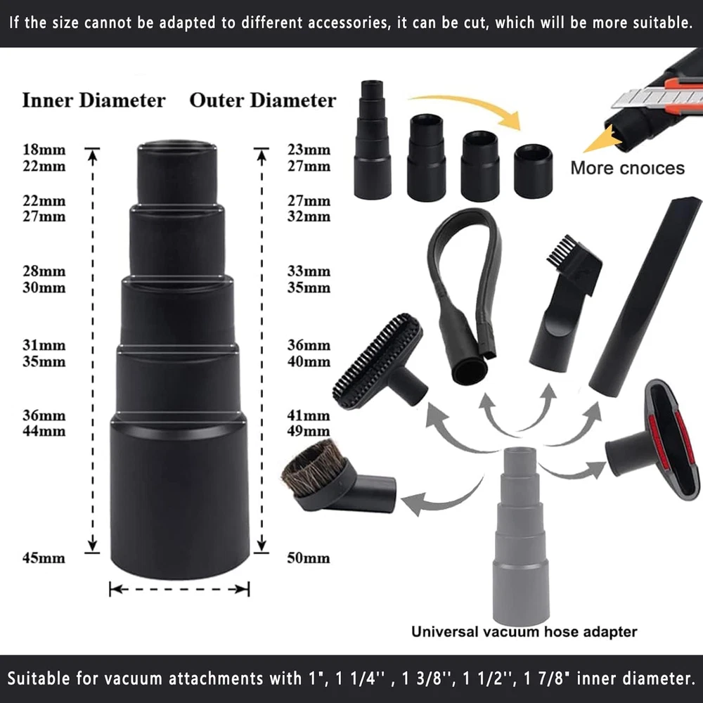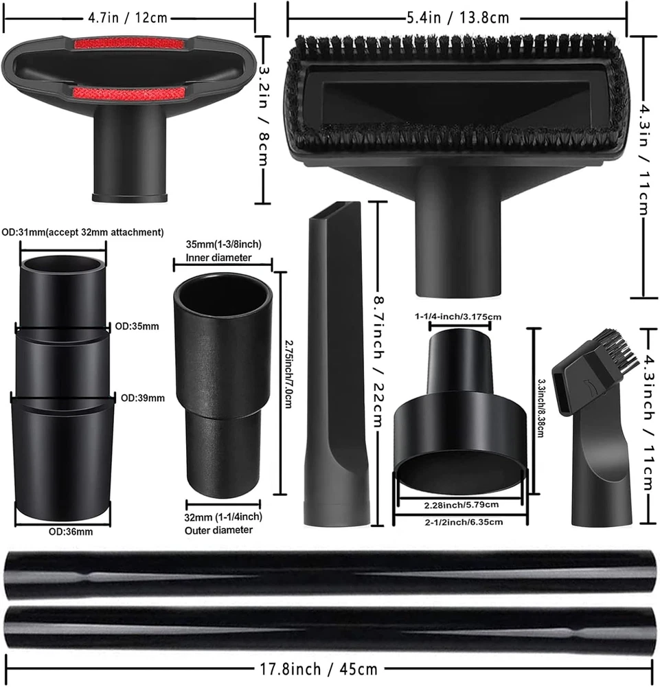 Compatible with more vacuum cleaner models: We have four different models of vacuum attachments connectors, the vacuum attachment fits most vacuum cleaners (of course a few models may not fit), compatible sizes are 1", 1 1/4'', 1 3/8'', 1 1 /2'', 1 7/8" ID. (Please double check the inner diameter of the hose/rod before purchasing, if not fit please contact us) Household Cleaning Essentials: Universal vacuum attachments kit are enough for multi-purpose cleaning at home, office and car interior ,such as : Keyboard, any gaps, shutter, sofa, vent, drawer, car, plants, remove pet hair and corners. Vacuum Extension Wand to expand your cleaning range: We are equipped with 2 vacuum extension wand, one with 17.7inch, which is longer than the vacuum extension wand provided by other manufacturers, and the two extension rods can be connected for use, you can clean higher and more Wide places, such as the ceiling, under the bed, narrow and inaccessible corners, etc. More complete functions: The vacuum horse hair brush is made of high-quality natural horse hair, which is very soft and easy to clean, and is suitable for cleaning and vacuuming different materials, including marble, hardwood, tile, linoleum, laminate, parquet floors, concrete and walls. Durable and not easy to break material: These vacuum cleaner hose adapters are made of high-quality ABS plastic material, which is lightweight, durable and stable, easy to use, not easy to break or damage, wet vac attachments can be used for a long time. There are a total of four vacuum cleaner accessory adapters of different specifications, which can be adapted to more vacuum cleaner models, so that you have no worries. 5 Layer Universal Vacuum Hose Adapter: Outer diameter of the 5 layers vacuum adapter is 27mm, 32mm, 35mm, 40mm, 50mm. Suitable for shop vac attachment with 1"(25.4mm), 1 1/4'' (32mm), 1 3/8'' (35mm), 1 1/2''(39mm), 1 7/8"(49mm) diameter. The vacuum hose adapter can be easily cut into 5 size connector to fit for shop vac accessories. Vacuum converter 2-1/2" to 1-1/4": This vacuum hose converter can convert 2-1/2" to 1-1/4", this hose converter can attach other smaller tools or attachments and make daily cleaning easier and faster. Vacuum Hose Converter 1-3/8" to 1-1/4": This hose converter reduces a 35mm/1-3/8" vacuum to a 32mm/1-1/4" attachment, allowing your vacuum to accommodate more cleaning brushes for a wider range of uses. Vacuum attachment 1-1/4" to 1-3/8" to 1-1/2" : This vacuum attachment converts 1-1/4" to 1-1/4", 1-1/4" to 1-3/8", 1-1/2" to 1-1/4", 1-1/2" to 1-3/8" and 1-1/2" to 1-3/8" for everyday cleaning needs and is suitable for most vacuum cleaners. Convenient and easy to use. Package Includes: 1. Extension tube *2 2. Horsehair round brush *1 3. Two-in-one flat suction *1 4. Sofa suction nozzle *1 5. T-shaped brush *1 6. long soft flat suction nozzle *1 7. Flat suction nozzle *1 8. Vacuum Hose Converter 1-3/8" to 1-1/4" *1 9. Vacuum converter 2-1/2" to 1-1/4" *1 10. Vacuum attachment 1-1/4" to 1-3/8" to 1-1/2" *1 11. Vacuum attachment 1", 1 1/4'', 1 3/8'', 1 1/2'', 1 7/8" *1 12. 12in Wide Vacuum Brush Attachment *1