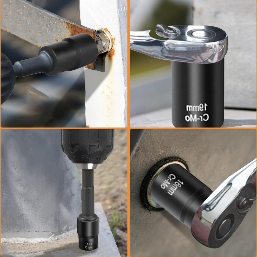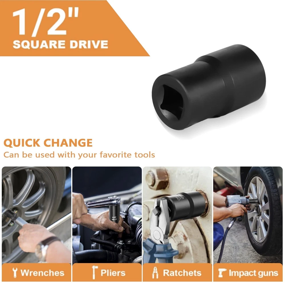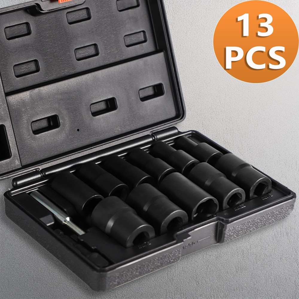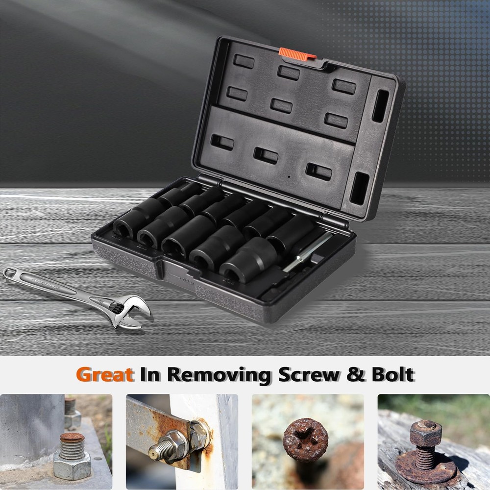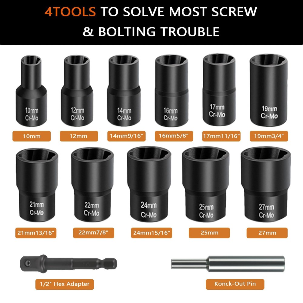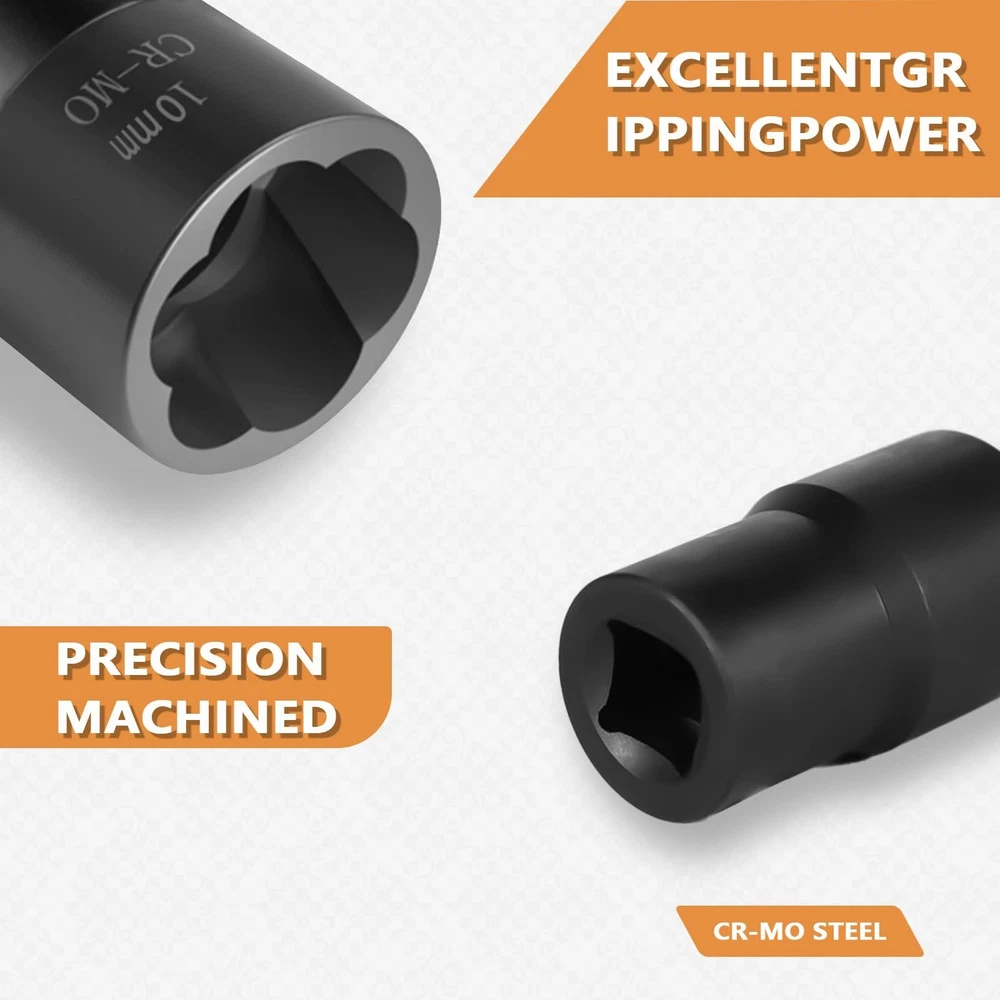 Bolt Nut Screws Extractor Set, 13 PCS Remover Socket Tool, Ideal for Automotive Repair & Home Projects Precision CNC Machined for Excellence: Each piece in the Bolt Nut Extractor Set is precision CNC machined to ensure superior performance and fit for automotive repair and home projects, catering to both professionals and DIY enthusiasts. High-Quality Material & Durability: Crafted from premium chromium-molybdenum steel, these tools undergo a strict production process and secondary quenching to achieve a 60HRC hardness, providing unmatched durability and longevity. Strong Torque & Firm Grip: Featuring a plum-shaped internal thread design, the set guarantees a strong grab on stubborn, deep-studded fasteners, ensuring even the toughest nuts and bolts can be efficiently removed. Wide Range of Metric Sizes: This comprehensive set includes socket sizes from 10mm to 27mm, along with a 1/2'' hex adapter and a drift punch nut removal bar, offering versatility for various tasks and tools. Multi-Application Versatility: Perfect for a wide array of applications, including car maintenance, home decoration, and craft production, the Bolt Nut Extractor Set is a versatile addition to any toolkit. Corrosion Resistance for Longevity: Each bolt extractor features an industrial-grade corrosion-resistant black phosphating finish for excellent impact resistance, ensuring long-lasting use even in harsh conditions.