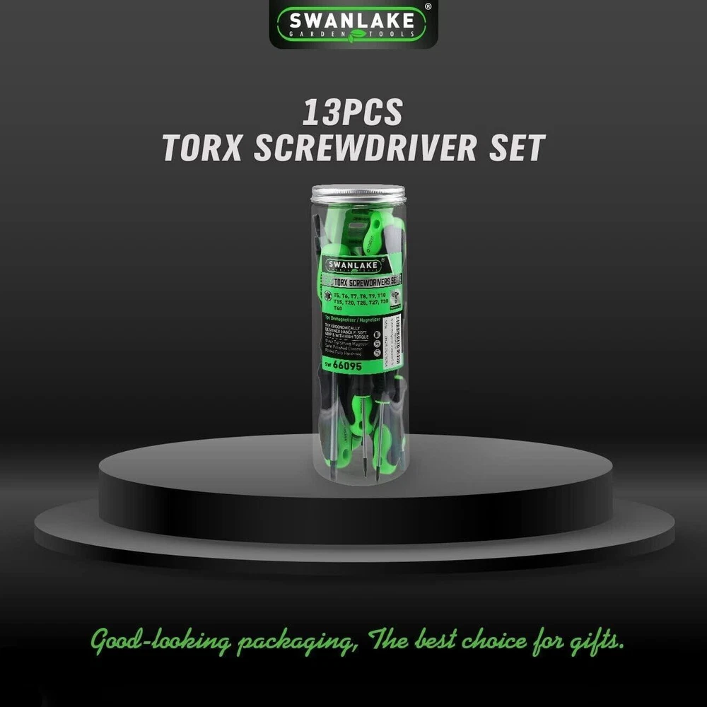 CONTACT US DIRECTLY FOR FREE & PREPAID RETURNS 13 Pieces Magnetic Torx Screwdriver Set, T5 to T40 Star Screwdrivers Magnetic Torx Screwdriver Set - 13 Pieces - T5 to T40 Star Screwdrivers ●Made of Chrome vanadium steel with heat treatment,high hardness, large torque, long service life. ●Cushion grip handle for comfort and control,With ergonomic TPR handle and button on it, it helps you to use easily. ●Black finish blade with magnetic tips which could conveniently attracts screws. ●Set Includes: T5 x2-1/2", T6 x2-1/2", T7 x 2-1/2", T8 x 2-1/2", T9 x 2-1/2", T10 x 2-1/2", T15 x 4", T20 x 4", T25 x 4", T27 x 4", T30 x 4", T40 x 5"and a magnetic retriever. ●Widely used for maintenance and assembly of all kinds of mechanical equipment ,domestic appliances and furniture. REVIEWS The product came very well packaged. I'm very happy. thank you for everything. Seller strongly recommended. This is great! I definitely recommend! Product looks amazing Delivery was fast. Excellent seller, great communication. I advise everyone
