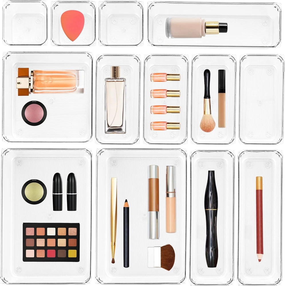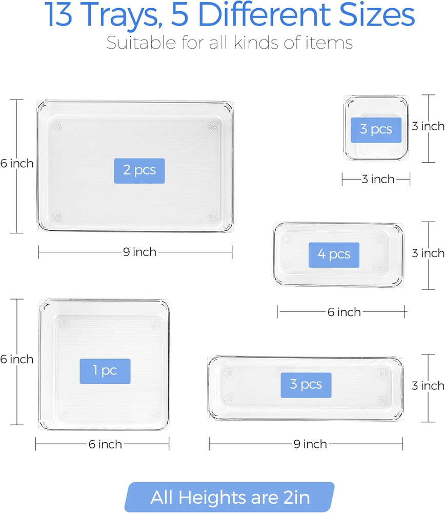 Store New Arrivals Add to Favorite View Feedback Contact 13 PCS Drawer Organizer Plastic Storage Bins, 5 - Size Kitchen Drawer Organizer with Non-Slip Pads Clear Desk Storage Tray for Makeup, Jewelries, Kitchen Utensils and Office Description Item model number OZCTSNHTM13 Number of Items 13 Batteries Included? No Unit Count 13.0 Count Batteries Required? No Finish Acrylic,Polished Product Dimensions 9"D x 3"W x 2"H Material Plastic Finish Type Acrylic,Polished Specific Uses For Product Jewelry,Makeup Item Package Quantity 13 Item Weight 3.34 pounds Special Features Non-slip Special Feature Non-slip Part Number OZCTSNHTM13 Mounting Type Tabletop Mount Number of Compartments 13 Color Clear Shape Square Included Components Includes: 9 x 6 x 2 inches (2pcs), 9 x 3x 2 inches(3pcs), 6 x 6 x 2 inches(1pcs), 6 x 3 x 2 inches(4pcs),3 x 3 x 2 inches(3cps), Non slip pads (52pcs) Number Of Pieces 13 Safe Material: Constructed from high-grade polished lucite acrylic, Ravinte vanity organizers maintain their crystal-clear transparency over time, even under intense sunlight, ensuring they remain visually striking without losing their luster Non-Slip Pads Included: Unlike other systems that may slide around when opening and closing your drawer, this clear drawer organizers come with non-slip pad that will keep your organizer trays in place, just stick them on the bottom of the trays Make Everything Organized: This acrylic organizer is a great choice for storing a wide range of household items from kitchen tools like cutlery and utensils to craft supplies. They are even nicely sized for household tool storage, makeup drawers, and closet organizers for properly storing jewelry or other small accessories Customizable with 5 Different Sizes: One set of desk drawer organizers includes 13 separate storage bins in 5 different sizes. Includes: 9 x 6 x 2 in (2pcs), 9 x 3x 2 in (3pcs), 6 x 6 x 2 in (1pcs), 6 x 3 x 2 in (4pcs),3 x 3 x 2 in (3cps) Easy to Wipe Clean: You can easily wipe these organizers clean with a damp cloth, which is particularly helpful if you’re putting them in the kitchen or bathroom Product Description Ravinte Drawer Organizer Save your time to organize and find your stuff Easy to keep things neat and tidy with organizers Non-Slip Pads Included Unlike other systems that may slide around when opening and closing your drawer, this clear drawer organizers come with non-slip pad that will keep your organizer trays in place, just stick them on the bottom of the trays Stackable Design Organize all your items and then stack these bins into one other, that will save much space especially when you have a narrow drawer. Designed for multipurpose solutions Other Combination of Drawer Organizer Add to Cart Add to Cart Add to Cart Add to Cart Add to Cart Customer Reviews 4.7 out of 5 stars 405 4.7 out of 5 stars 405 4.7 out of 5 stars 405 4.7 out of 5 stars 405 4.7 out of 5 stars 405 Price $13.99 $ 13 . 99 $18.99 $ 18 . 99 $25.99 $ 25 . 99 $27.99 $ 27 . 99 $29.99 $ 29 . 99 Size 5 Different Sizes 5 Different Sizes 4 Different Sizes 4 Different Sizes 5 Different Sizes Number of 3 x 3 x 2 in bin 3 6 8 8 7 Number of 6 x 3 x 2 in bin 4 5 8 8 8 Number of 6 x 6 x 2 in bin 1 2 0 0 4 Number of 9 x 3 x 2 in bin 3 2 6 8 9 Number of 9 x 6 x 2 in bin 2 1 3 4 3 Non-Slip Pads Included? ✔ ✔ ✔ ✔ ✔ ABOUT US We offer the best prices around on high quality products. Our E-store includes media such as books, movies, music and games while offering electronics, toys, sporting apparel, clothing, tools, general home, garden items and more. SHIPPING We are always working hard to ensure your package arrives as soon as possible. Please understand that some factors like weather, high postal traffic, and the performance of shipping companies are outside of our control. We offer free shipping to the lower 48 states and ship within 2 business days of payment, usually sooner. We do not accept P.O. Boxes. Please provide a physical address. RETURNS We offer a 30-Day Return Policy on items which you are not completely satisfied with. You have the option for a full-refund or an exchange of the item. No returns are available on items shipped outside of the USA. PAYMENT We accept PayPal. CONTACT US This page content is yet to come Please ad us to your favorite seller and visit again later Thank You CUSTOMER SATISFACTION We try our very best to make sure every customer is completely satisfied. If there's a problem, message us! We're happy to help.