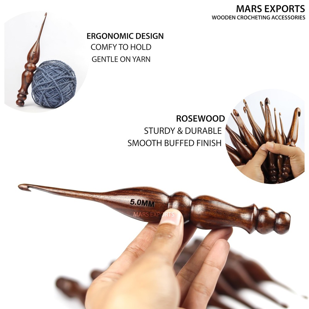 These wooden crochet hooks are a dream to work with! The smooth rosewood feels luxurious in your hands, and the ergonomic design makes stitching comfortable for hours. The set covers all the sizes I need, from delicate lace to chunky yarns. The craftsmanship is outstanding—no snagging or rough edges. Perfect for both beginners and experienced crocheters who appreciate quality tools. A must-have for anyone serious about their craft!