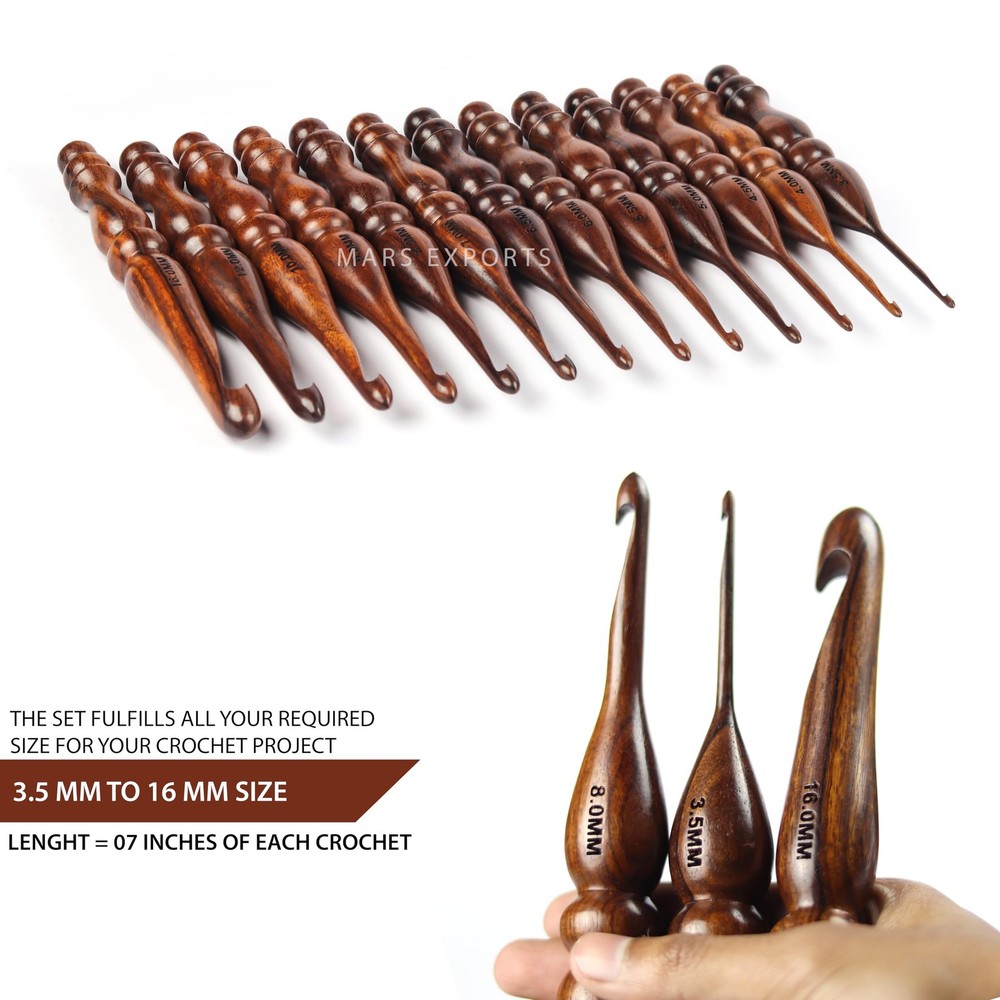 Elevate your crochet projects with our 13 Pieces Premium Wooden Crochet Hooks Set, expertly crafted from exquisite Rosewood knitting needles. This set offers versatility with a range of sizes from 3.5 MM to 16.0 MM, ensuring you have the perfect tool for various yarn weights and creative endeavors. Key Features: Premium Rosewood Craftsmanship: Each crochet hook is meticulously crafted from high-quality Rosewood, known for its natural warmth and smooth texture. The premium material enhances the overall quality of your crochet experience. Set of 13 Sizes: This comprehensive set includes 13 crochet hooks in sizes ranging from 3.5 MM to 16.0 MM. Whether you're working on delicate lace projects or cozy blankets, this set covers all your creative needs. Versatile Crocheting: Designed for both knitting and crocheting, this set accommodates various yarn types and thicknesses. The smooth finish ensures a snag-free experience, allowing you to delve into intricate patterns with ease. Premium Ergonomics: Each crochet hook is ergonomically designed for comfortable handling, reducing hand fatigue during extended crafting sessions. Enjoy a smooth and pleasant crocheting experience with these thoughtfully crafted hooks. Functional and Stylish: Beyond functionality, the Rosewood construction adds a touch of style to your crafting tools. Display these premium crochet hooks proudly in your crafting space. Practical Storage: The set comes with a convenient storage case, keeping your crochet hooks organized and easily accessible. The compact, portable case is perfect for both on-the-go crafting and tidy storage at home. Perfect Gift: Whether for yourself or a fellow crafting enthusiast, this Premium Wooden Crochet Hooks Set makes for an excellent gift. Share the joy of elevated crocheting with these beautifully crafted hooks. Experience the beauty and functionality of our 13 Pieces Premium Wooden Crochet Hooks Set in Rosewood. Elevate your crochet projects with the warmth and sophistication of these meticulously crafted hooks. Order now and add a touch of luxury to your creative journey. MATERIAL : Crafted from high-quality rosewood, known for its durability, strength, and attractive grain patterns SET SIZE : Consists of a complete set of 13 crochet hooks, catering to various project requirements and yarn weights SIZES : 3.5mm, 4.0mm, 4.5mm, 5.0mm, 5.5mm, 6.0mm, 6.5mm, 7.0mm, 8.0mm, 9.0mm, 10.0mm, 12mm, 16mm. Lenght of each crochet is 7 inches. SMOOTH FINISH : Each hook features a meticulously smooth finish, preventing snagging or splitting of yarn and ensuring a seamless crocheting experience ERGONOMIC DESIGN : Designed with an ergonomic handle for comfortable grip and reduced hand fatigue during extended crocheting sessions. Size Markings Clear and engraved size markings on each hook for easy identification, allowing you to quickly select the appropriate size for your project. VERSATILITY : Suitable for a wide range of crochet projects, from delicate lacework to bulkier yarn projects, thanks to the variety of included hook sizes. NATURAL BEAUTY : Rosewood's natural aesthetic adds a touch of elegance to the crochet hooks, making them visually appealing tools for your crafting endeavors. BALANCED WEIGHT : The hooks are designed with balanced weight distribution, providing a comfortable and controlled feel while working on different types of projects. IDEAL GIFT : This set makes for an excellent gift for crochet enthusiasts, showcasing both practicality and aesthetic appeal
