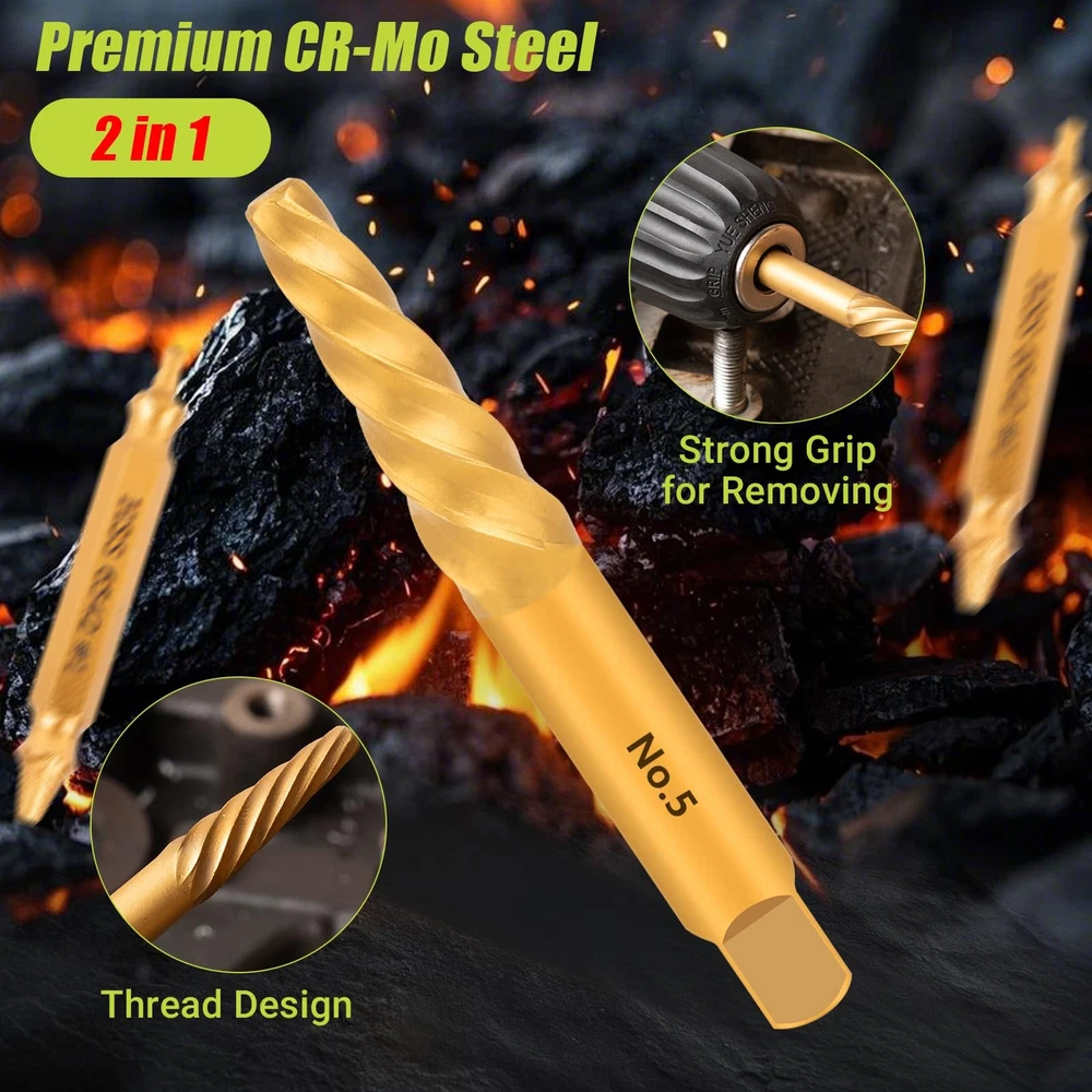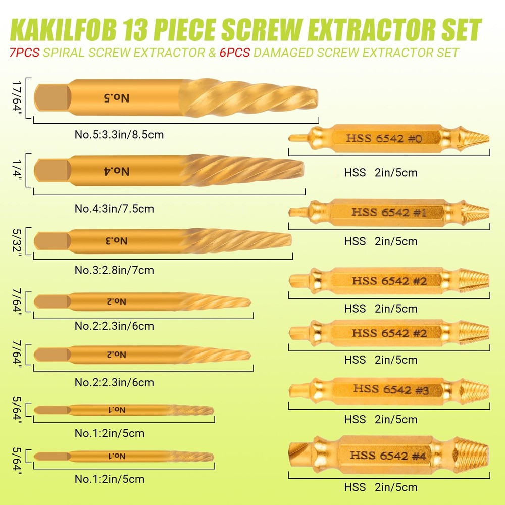 Screw Extractor Set, 13 Pieces Easy Out Screw Extractor Set and Left-Hand Drill Bit Set, Stripped Screw Extractor Set for Removing Damaged Screws, Broken Bolts, Studs High-quality materials: With titanium gold-plated surface treatment, rust-proof and corrosion-resistant. The spiral screw extractor is made of CR-MO steel, and the easy-out bolt extractor set is made of HSS 6542 to ensure sturdiness. And with laser-etched markings for easy identification, meeting the needs of screw extractor drill bits and broken bolt extractor kits. Wide Range of Sizes: Damaged Screw Extractor Set features 7PCS spiral screw extractors: 1#5/64", 1#5/64", 2#7/64", 2#7/64", 3#5/32", 4#1/4", 5#17/64", along with 6PCS double-head extractors: 0#, 1#, 2#, 2#, 3#, 4#. Easy to remove stuck, broken, or tightened tools. Broken bolt extractor kit removes damaged screws, whether working on wood or metal, saving you valuable time and effort. Tool Compatibility: Engineered to seamlessly integrate with electric drills, screwdriver bit holders, and wrenches, offering compatibility across a wide range of tools, including tap socket sets. Versatile Applications: Tailored for a variety of daily life uses, such as home repairs, car maintenance, construction projects, and metalworking. Designed to easily handle a variety of challenges, including stripped, broken or frozen screws, bolts, and nuts. Cool Gift Ideal: This an excellent gift choice for dad, husband, father, him, guy teens, adult, boyfriend, or son on Birthdays, Christmas, and Father's Day reflecting quality and practicality. Backed by exceptional after-sales service, ensuring complete customer satisfaction. Perfect for those seeking easy-out bolt extractor sets or stripped bolt extractors.