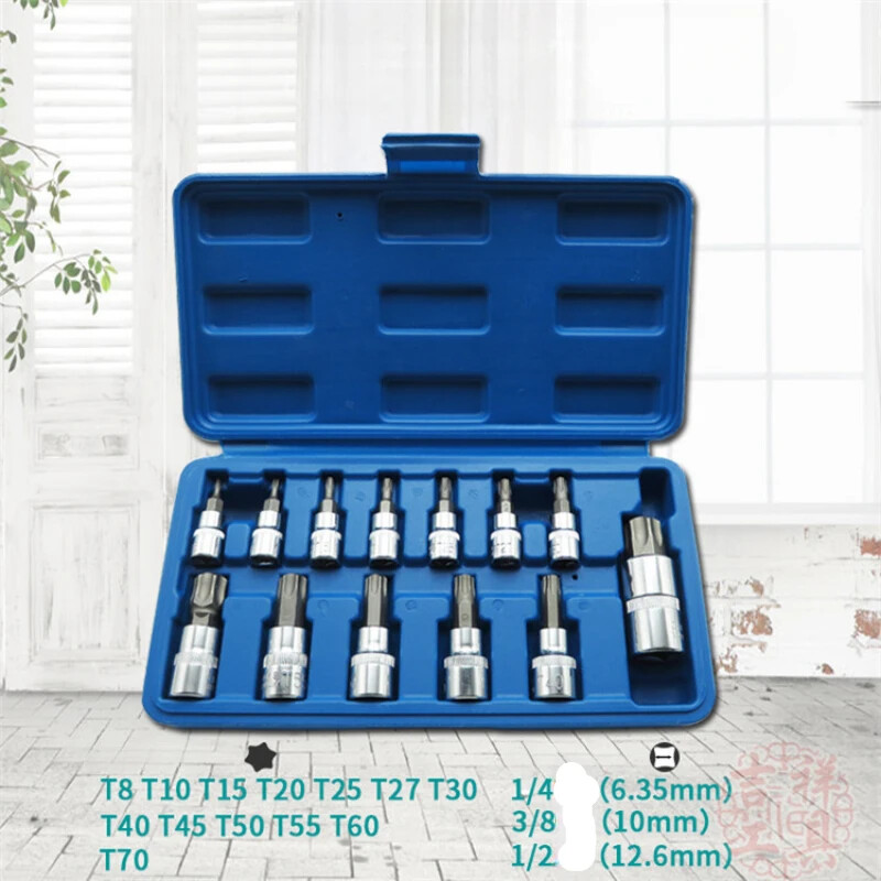 Features: 1. Good performance: torque, strength and durability, oil resistance and corrosion resistance. 2. S2 steel: Forged, heat-treated S2 steel has torque, strength and durability. 3. Oil resistance and corrosion resistance. Drop-forged, heat-treated S2 steel has torque, strength and durability. 4. Package content: All parts of the suit are firmly packed in a durable blow-molded suitcase, which is easy to organize and transport. Specifications: Material: chrome vanadium steel Number of kits: 13 pieces System: Metric Notes: 1. Please allow 0-1 inch error due to manual measurement. Thanks for your understanding. 2. Monitors are not calibrated same, item color displayed in photos may be showing slightly different from real object. 13 pcs/set * tool 1/4 drive: T8 T10 T15 T20 T25 T27 T30 3/8 drive: T40 T45 T50 T55 T60 1/2 drivea: T70