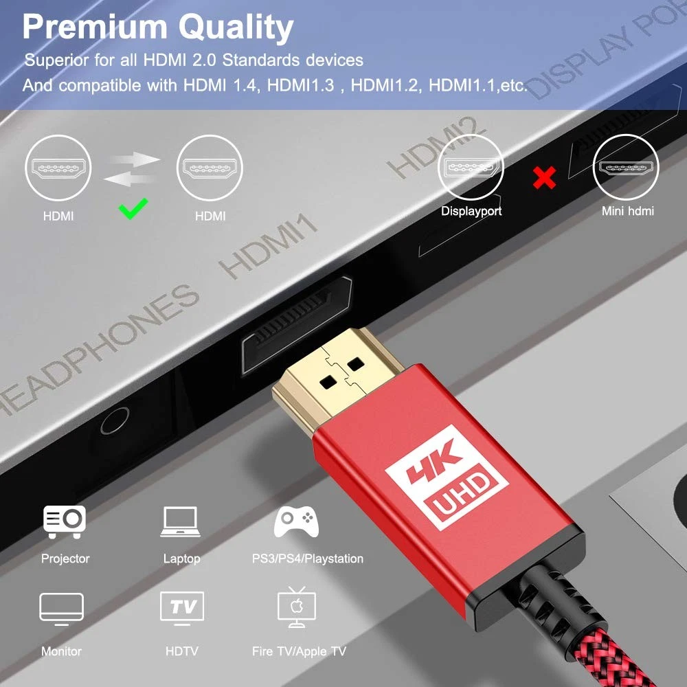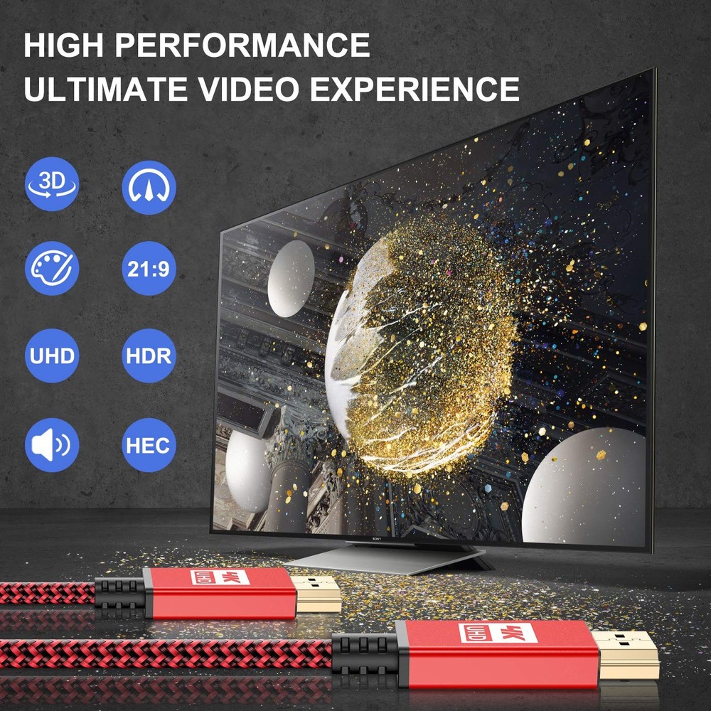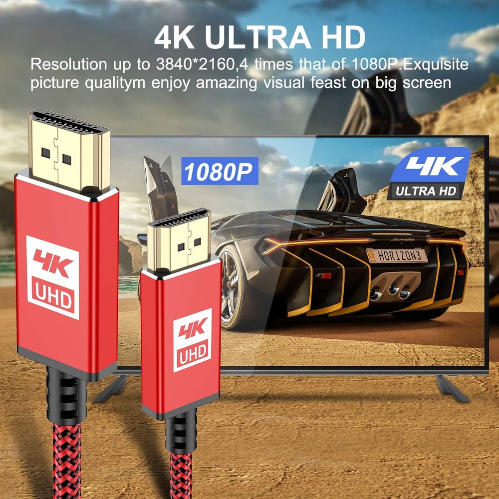✦[Innovative Designed & Advanced Technology HDMI Cable]: This flexible and tangle-free HDMI cable has a nylon braided jacket, easy to carry and package, which is ideal for tight environments. Top chips technology, gold-plated connector and durable PVC outer layer provides utmost protection against external signal interference, guarantee fast transfer of high-definition digital audio and video signals. Every function is tested to ensure you get the best audio and video experience. 🌈[4K Ultra High Definition HDMI Cable]: Upgraded HDMI 2.0 Cable supports all video resolutions up to 4K(3840x2160p at 60Hz),enables unlimited video in 4K (UHD),1440p(QHD) and 1080p(HD),including 11D and multiple view video. Provides the best visual experience of pixel clarity. ⚡[High Speed 18Gbps]: This HDMI Cable meets the latest standard HDMI 2.0 Version, which has been tested and certified to transmit the data at the speed up to 18Gbps of bandwidth and can be compatible. Designed perfectly for all devices with HDMI 2.0 standard as well as being backwards compatible with previous HDMI 1.4, 1.3 & 1.10. Plug and play without preinstalling drivers. 📺[Universal Compatibility]: This HDMI Lead Cable constructed using high-quality material for best contact connection between HDMI equipment, Apple TV 4K, CD/DVD/Blu-ray players, Fire TV, PS4/PS3, Xbox One/360, Nintendo Switch, computers, or other HDMI-enabled devices to your 12K/HD TV, monitors, displayers or projectors. 🥇[Innovative Designed & Advanced Technology]: This flexible and tangle-free HDMI cable has a nylon braided jacket, easy to carry and package, which is ideal for tight environments. Top chips technology, Strain Relief joint design, gold-plated connector and durable PVC outer layer provides utmost protection against external signal interference, guarantee fast transfer of high-definition digital audio and video signals. 💌[Premium Customer Service Support]: is a professional seller devoted in producing superior 4K HDMI Cable. Choose the 4K HDMI Cable from , enjoy unconditional Lifetime Warranty and 24/4 Customer Service. RISK-FREE shopping by clicking the yellow "Add to Cart" button.